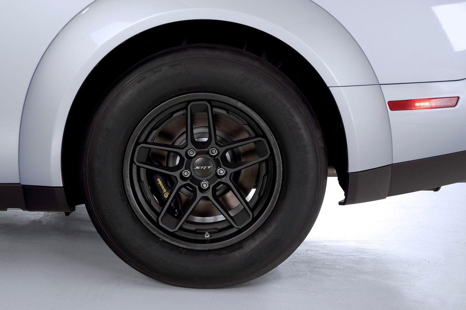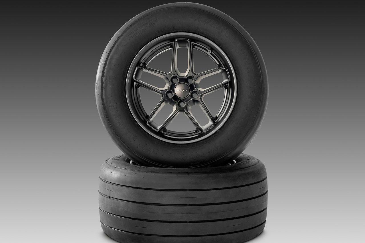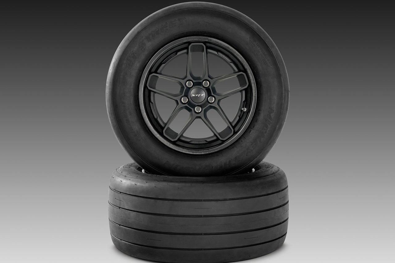 Wer das Dragcar ordert bekommt zwei paar Rad-Reifensätze dazu. Eines davon ist für den Einsatz auf dem Dragstrip optimiert und beinhaltet 315/15 R17 messende Mickey Thompso ET Street R Reifen für die Hinterachse und 245/55 R18-Rerivate für die Vorderachse.