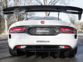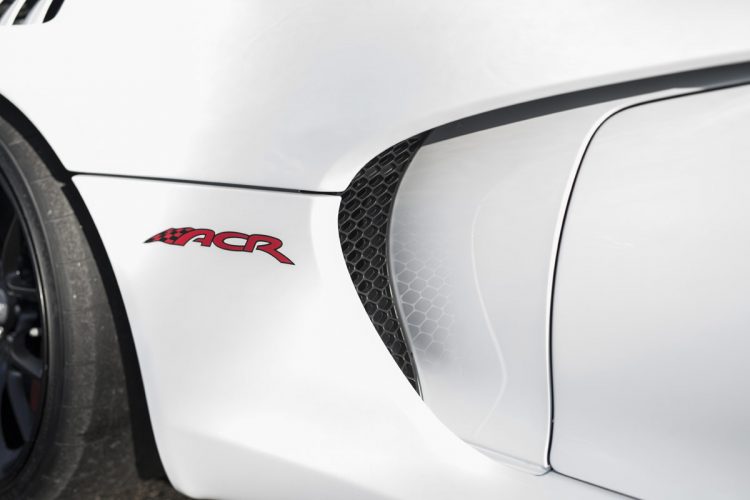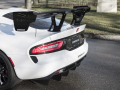 {1}Die Aerodynamik der Dodge Viper ACR allerdings lässt keine Frage offen und erklärt schon auf den ersten Blick, woher die spitzenmäßige Performance herrührt. Bestückt mit dem „Extreme Aero Package“ trumpft das Musclecar mit einem großen Frontsplitter, Flaps, einem 1,88 Meter breiten, einstellbaren Heckflügel, seitlichen Luftleitelementen sowie einem Carbon-Heckdiffusor. Hinzu kommen speziell entwickelte Reifen der Marke Kumo, die vorne das Format 295/25R19 und hinten 355/30R19 aufweisen. Sie sollen eine Querbeschleunigung von bis zu 1,5 g ermöglichen. Hinzu kommen ein einstellbaren Bilstein-Fahrwerk und eine Carbon-Ceramik-Bremsanlage mit 390 Millimeter messenden Scheiben und Sechs-Kolben-Sätteln vorn und 360er Scheiben hinten, die von Vier-Kolben-Sätteln in die Zange genommen werden.