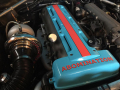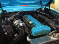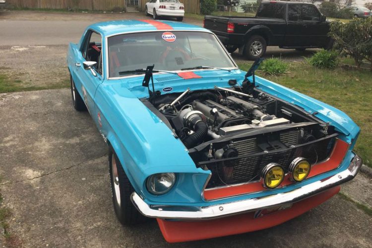 {1}Nachdem der ursprüngliche 3.3 Liter Sechszylinder nicht mehr gut genug war, verbaute der Eigentümer einen 2.3 Liter Turbo-Vierzylinder ebenfalls aus Ford Produktion, der jedoch kurz darauf schon wieder weichen musste, da weder Motorleistung noch Zuverlässigkeit den eigenen Ansprüchen genügte. Auf der Suche nach einer neuen Antriebsquelle wurde man dann schließlich in Japan fündig, von wo aus man einen doppelt aufgeladenen 2JZ-GTE Sechszylinder aus einem Toyota Aristo importierte und auf einen einzelnen „Turbonetics“ Lader umrüstete. Zusammen mit dem neuen Motor hielt dann auch ein Automatikgetriebe und eine neue elektrische Lenkung anstelle der alten hydraulischen Einzug. Der umfangreiche Schaffensweg dieses in den Gulf-Farben lackierte Mustang wurde im Forum auf über 40 Seiten ausführlich dokumentiert, wer also einen genaueren Blick drauf werfen will, sollte hier klicken.