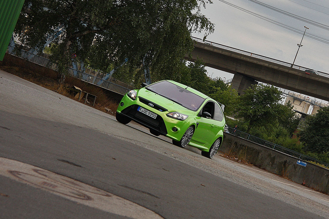 In diesen Drehzahlbereichen ist der grüne Kölner derart schnell, dass das Hirn kaum mehr mitkommt. Doch selbst der dilettantischste Fahrer ist mit dem RS in der Lage neue Bestzeiten in den Asphalt zu brennen. Das Chassis reagiert in jeder Situation spektakulär vertrauensvoll. Zwar dreht sich das Heck mit ein und das kurveninnere Rad der Hinterachse verliert oft den Bodenkontakt, doch das ändert nichts daran, dass der Focus jeden Quadratzentimeter Asphalt in Grip umzusetzen scheint. Auf der Straße kleben bekommt hier eine ganz andere Bedeutung. Und es ist egal ob man ihn in den Lastwechsel zwingt, voll das Gas anlegt oder andere Spielereien macht, der RS liegt und geht. Immer. Überall. Gefühlt schneller als alles andere.