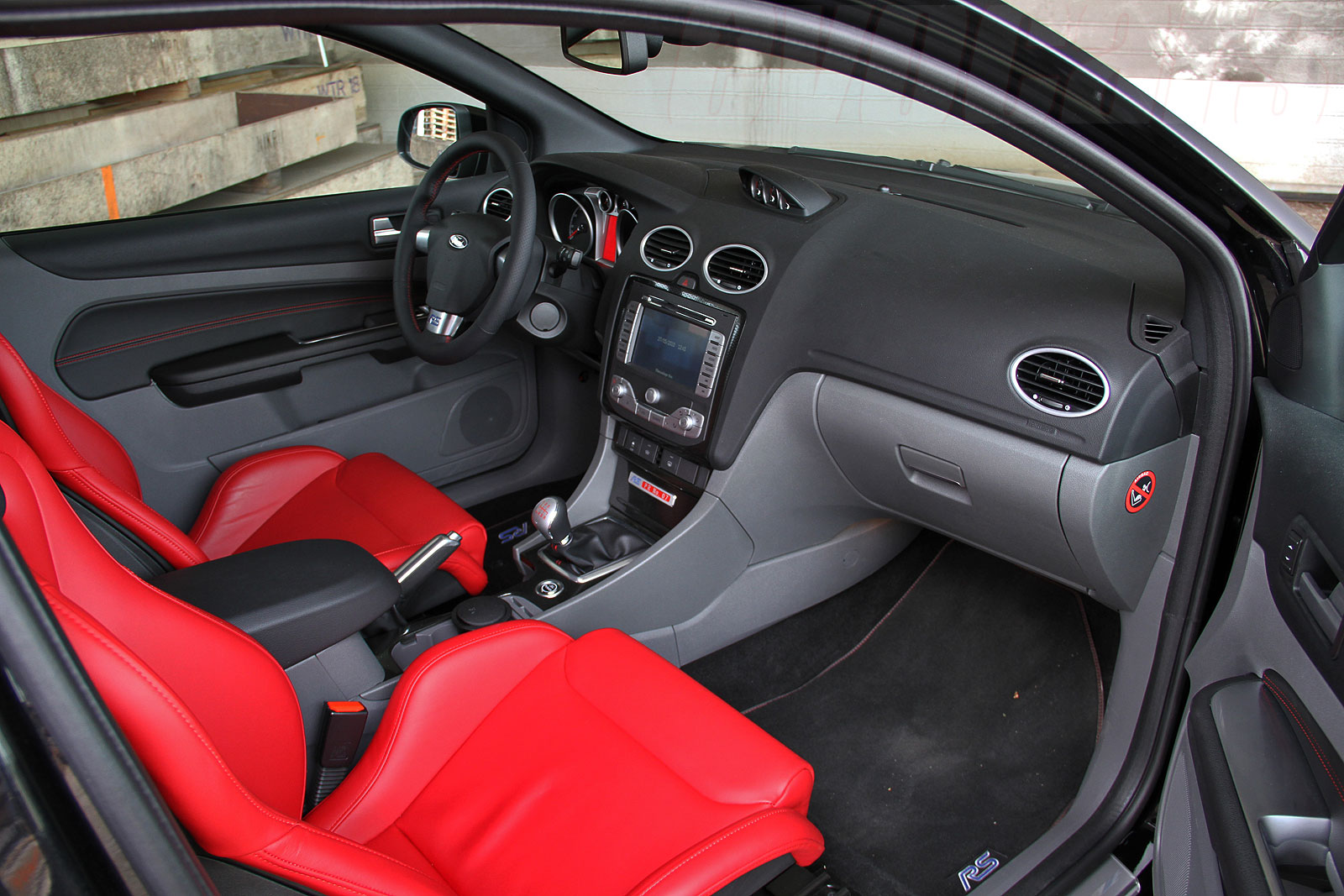 Ob die Fahrleistungen auf Landstraße und Rennstrecke allerdings tatsächlich besser sind, als im Serien-RS mit 305 PS und 440 Newtonmeter Drehmoment, entzieht sich unserer Kenntnis. Fakt ist: Der RS500 ist 0,3 Sekunden schneller als ein RS, fährt zwei km/h schneller und mobilisiert sein 45-Zusatz-PS aus größere Benzinpumpe, Luftfilter, Intercooler und Auslasskrümmer. Samt angepasster Steuerelektronik und erwähnter Folierung, durchnummerierten Nummern-Plaketten im Innenraum und RS500-Schriftzügen wird der limitierte Ford zur echten Wertanlage – leider.