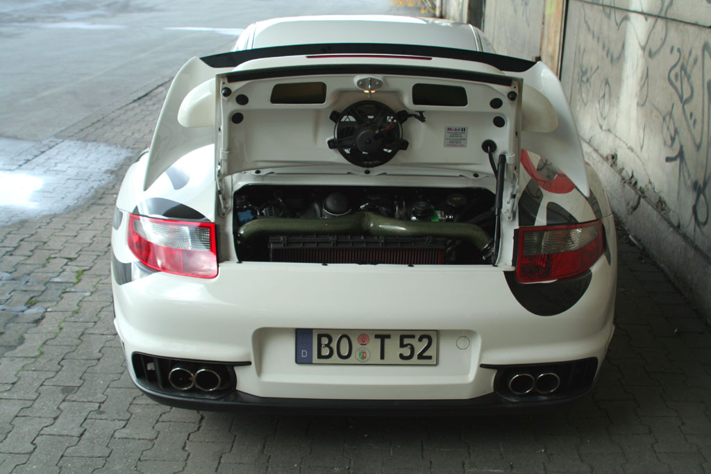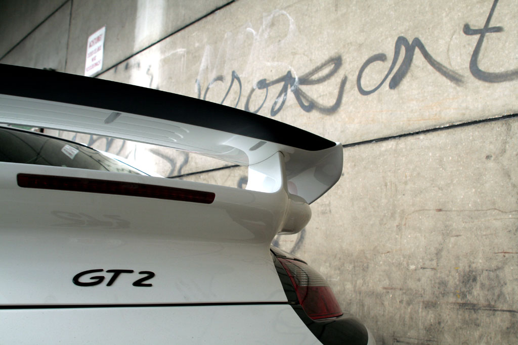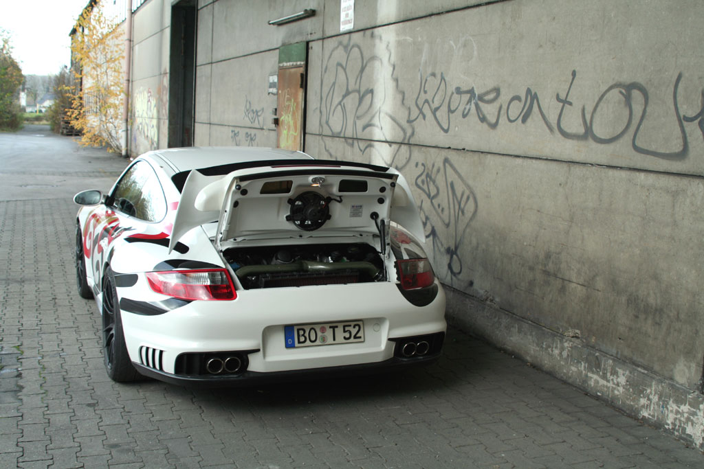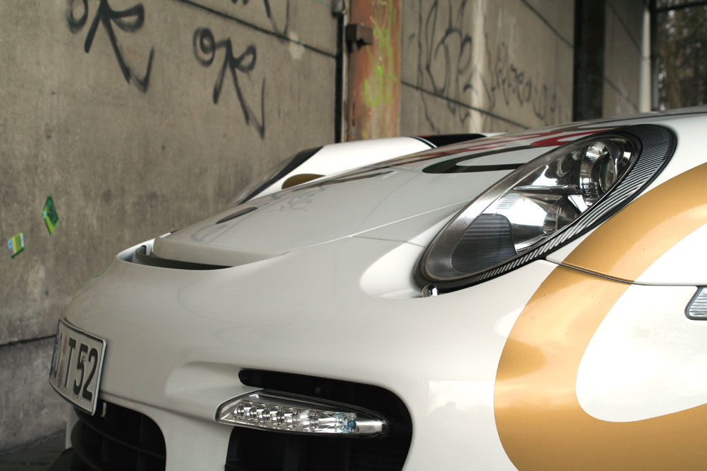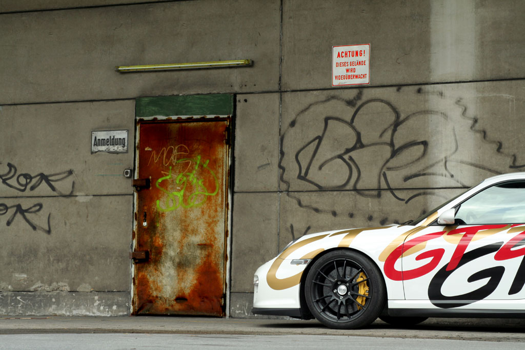 Nachdem der Boxer warmgelaufen ist, kann ich nicht mehr an mich halten und gebe dem hammerharten Porsche die Sporen. Schließlich bin ich ein Mann. Aber leider kein Rennfahrer. Mein Hände werden feucht und feuchter als der GT2 anfängt zu fliegen. Jede Bodenwelle, jede Fuge schickt harte Schläge ins Cockpit und bei 300 Sachen ist am Lenkrad harte Arbeit angesagt. Kein Vergleich zum brutalen 320-km/h-Cruisen im Audi RS6R von MTM. Tempo-Schilder und Ausfahrten flitzen vorbei, die Titanflöte spielt eine wundervolle Melodie und das fahrwerksbedingte Zittern der Xenonfunzeln räumt die linke Spur erfolgreich frei. Aber mal ehrlich: Mit stumpfem Geradeausfahren ist der GT2 von 9ff sträflich unterfordert. Zwar versuche ich noch, auf der Landstraße ein geeignetes Revier zu finden, doch vergebens. Dieses Ding ist ein Monster. Ein Biest. Ein Zeitenjäger, der im drögen Alltag und auf öffentlichen Straßen wie Boxer Mike Tyson hinterm Schreibtisch wirkt. Und wir alle wissen, zu was „Iron Mike“ fähig ist (Stichwort Ohr).