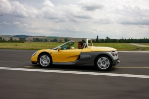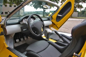 Auch einen außen angebrachten Türöffner finde ich nicht. Brauch ich auch nicht. Schließlich gibt’s eh kein Dach, und so greife ich in den Innenraum und benutzte den innen liegenden Türöffner. Butterweich schwingt das „Türchen“ nach oben, ich fädel mich ein ein und ziehe den Einstieg zu. Lenkrad, Schaltknauf, großer Drehzahlmesser – fertig. Reicht doch. Der Sitz lässt sich zwar nicht in der Höhe verstellen, doch wenn die Sitzpolster rausgerupft werden, guckt selbst der über 1,90 große Tim (unser EVOCARS-Fotograf) nur noch rund zehn Zentimeter über die aufpreispflichtige Windschutzscheibe. Nur mit Mühe kann ich mir bei diesem Anblick ein Grinsen verkneifen (sorry Tim :-)). Doch nachdem wir die Plätze getauscht haben, ich das Prinzip des Rückwärtsgangs erklärt bekommen habe – den Schaltknauf nach links drehen und dann den Wahlhebel nach links oben schieben -, geht’s auf die Piste.