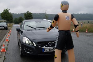 Vorstellung deswegen, weil es sich bei der „Person“ lediglich um eine aufblasbare Dummy-Puppe und bei der Dame auf dem Beifahrersitz um eine erfahrene Instruktorin handelte, deren bereits vorab erklärtes Ziel es war, mich vollständig vom Verkehrsgeschehen abzulenken, um mir so die Vorzüge der Fußgänger-Erkennung mit automatischer Vollbremsung inklusive aktivem Geschwindigkeits- und Abstandsregelsystem näher zu bringen. Kollisionen mit Fußgängern soll das System bis zu einem Tempo von 35 km/h vollständig verhindern und dank serienmäßigem City Safety System auch vor Auffahrunfällen bei niedrigem Tempo schützen. Zumindest bei unserem simulierten Test klappte das so eindrucksvoll, das wir nachdrücklich empfehlen können, die zusätzlichen 1700 Euro zu investieren.