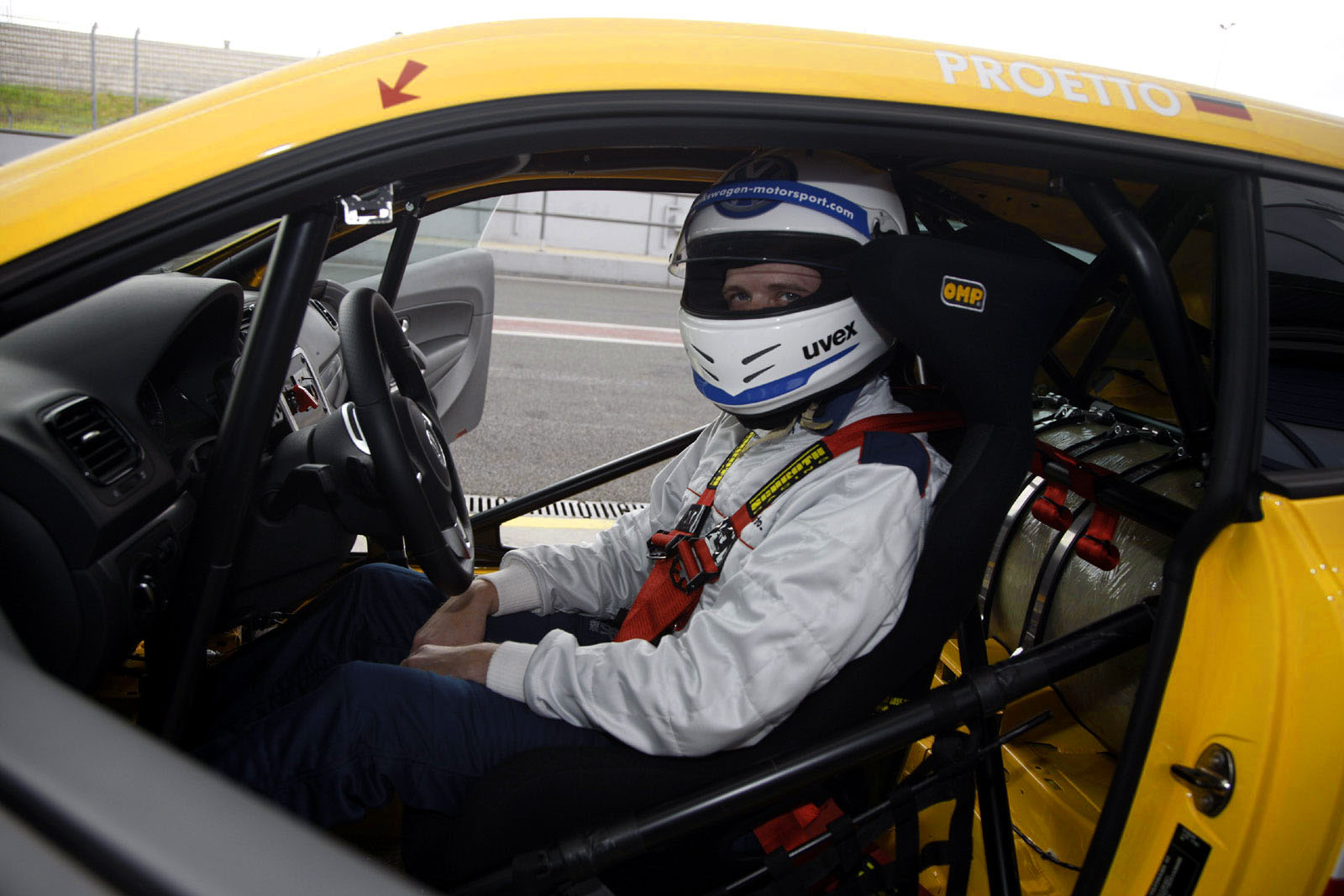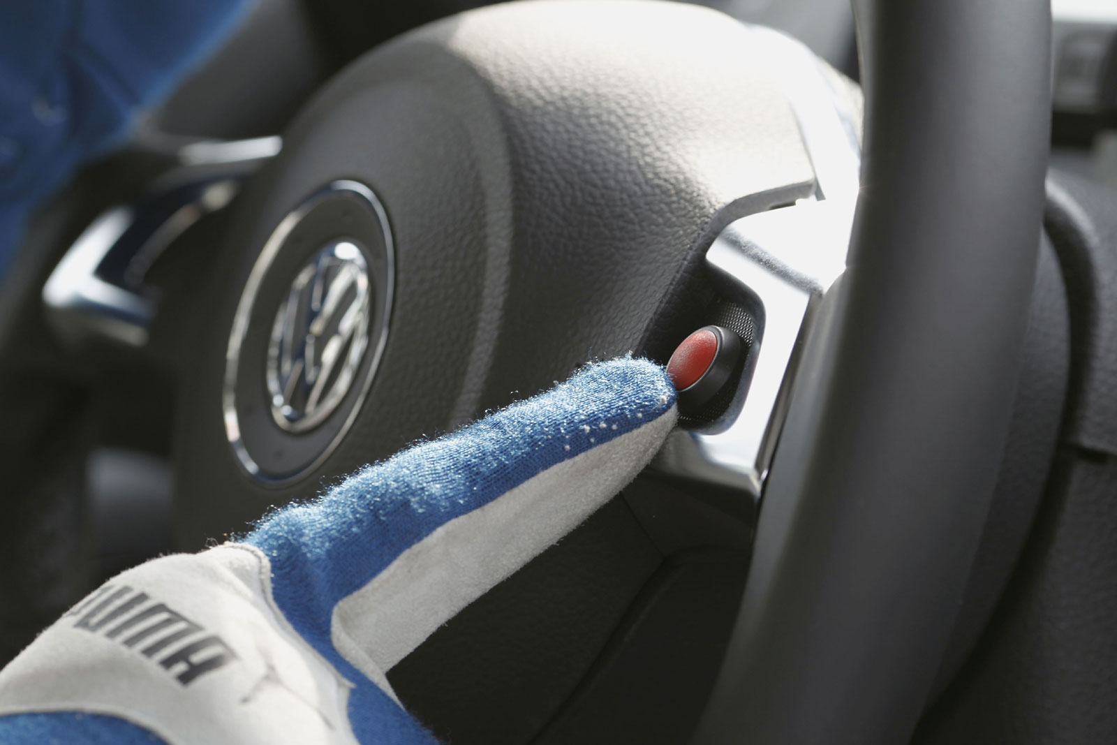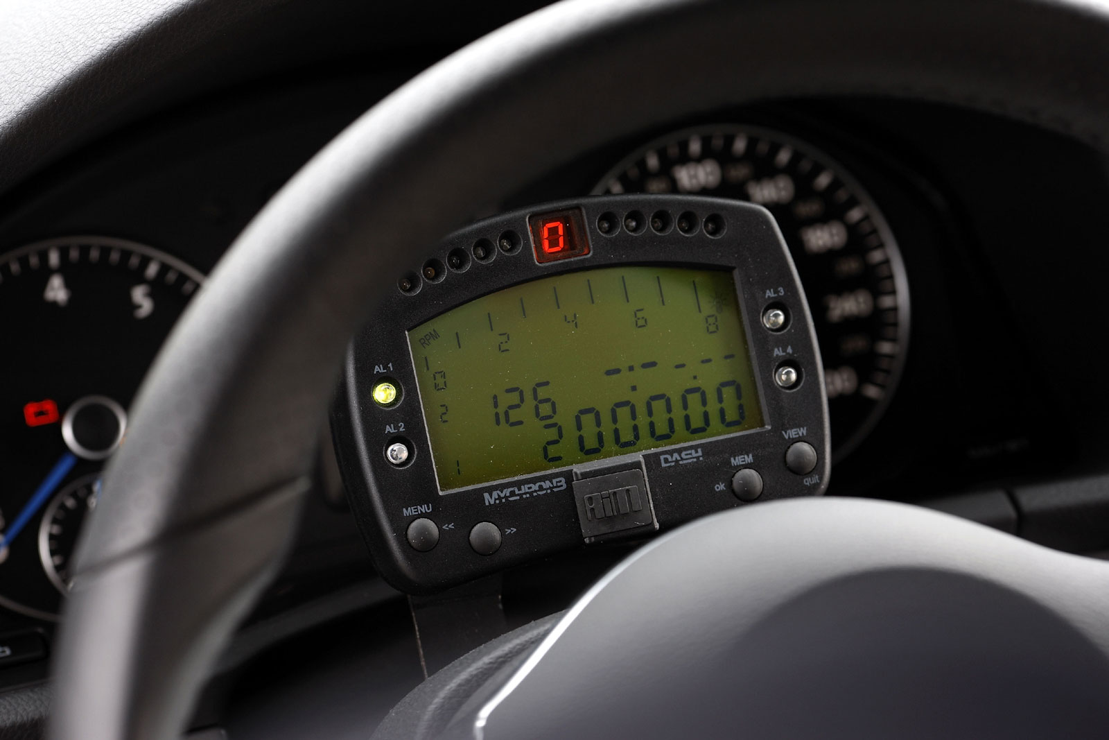 Anders die von uns gefahrene Light-Version: Im Scirocco R Cup erwartet den Fahrer das serienmäßige Airbag-Lenkrad mit DSG-Paddels, der Armaturenträger ist weiterhin an Bord und auch der DSG-Schaltknauf verbreitet wohnliche Atmosphäre. Angesichts des einzelnen Recaro-Sitzes mit Sechspunktgurten, dem Kombiinstrument von AIM hinterm Lenkrad, einem Überrollkäfig und jeder Menge weiterem Rennsport-Equipment, steigt der Puls aber dennoch spätestens beim Platznehmen und Festgeschnallt werden. Jetzt noch das Sicherheitsnetz vorm Fenster einrasten (innen), einmal tief Durchatmen und los geht’s.
