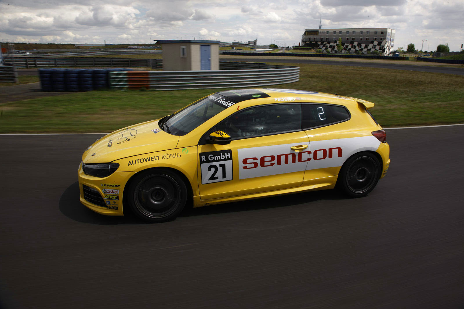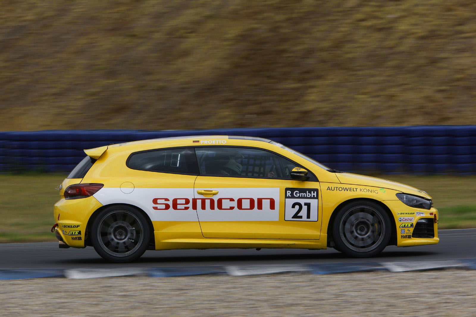 Ja, donnern ist trotz der erdgasbedingten PS-Einbußen auf 225 PS noch immer Nagelkopf-treffend ist. Immerhin sprotzt der Zweiliter-Turbo die Power durch eine tüchtig erleichterte Abgasanlage mit Rennkats ins Freie und im Innenraum dämmen nur noch wenige Serien-Einbauteile des Fahrers Ohr vor der berauschenden Geräuschkulisse. Die kann zwar an den verlockenden Sound des GT24-Langstrecken-Sciroccos nicht herankommen, dafür entspricht der Scirocco R Cup in weiten Teilen noch der Serie. Der Hardcore-Renner indes hält lediglich nach Außen den Scirocco-Schein aufrecht.