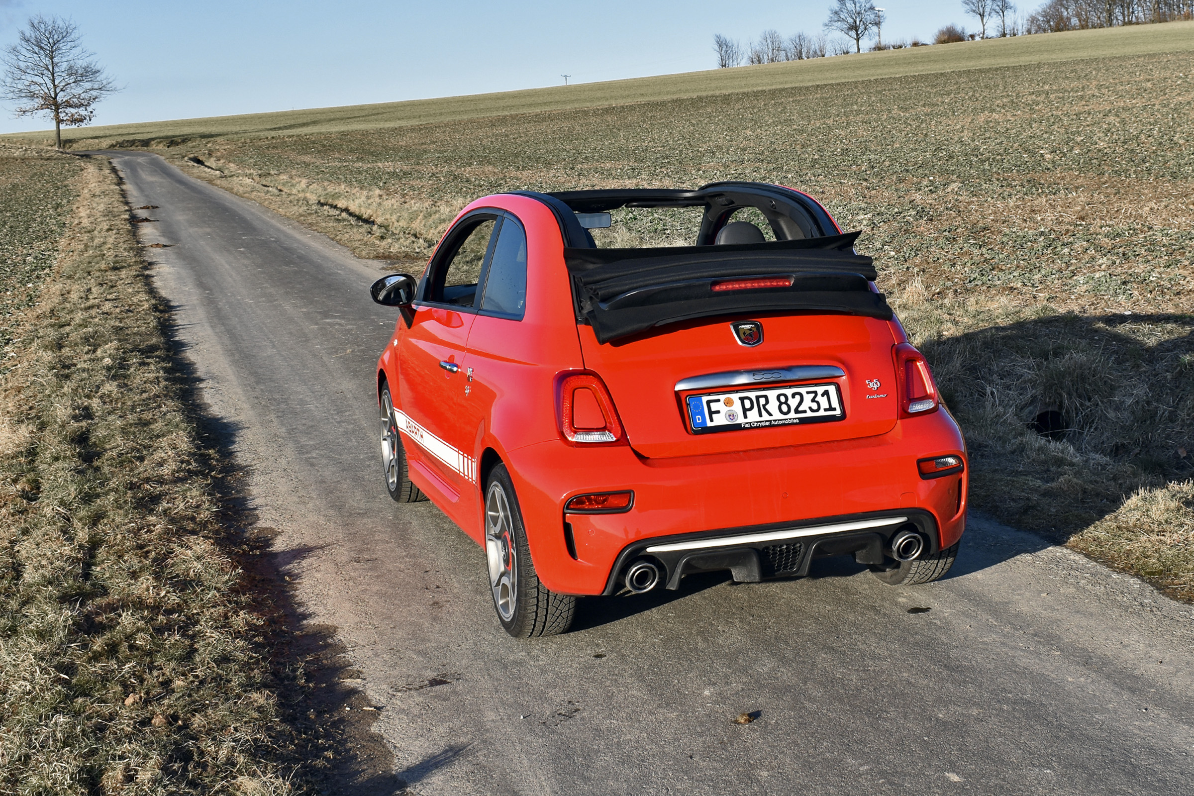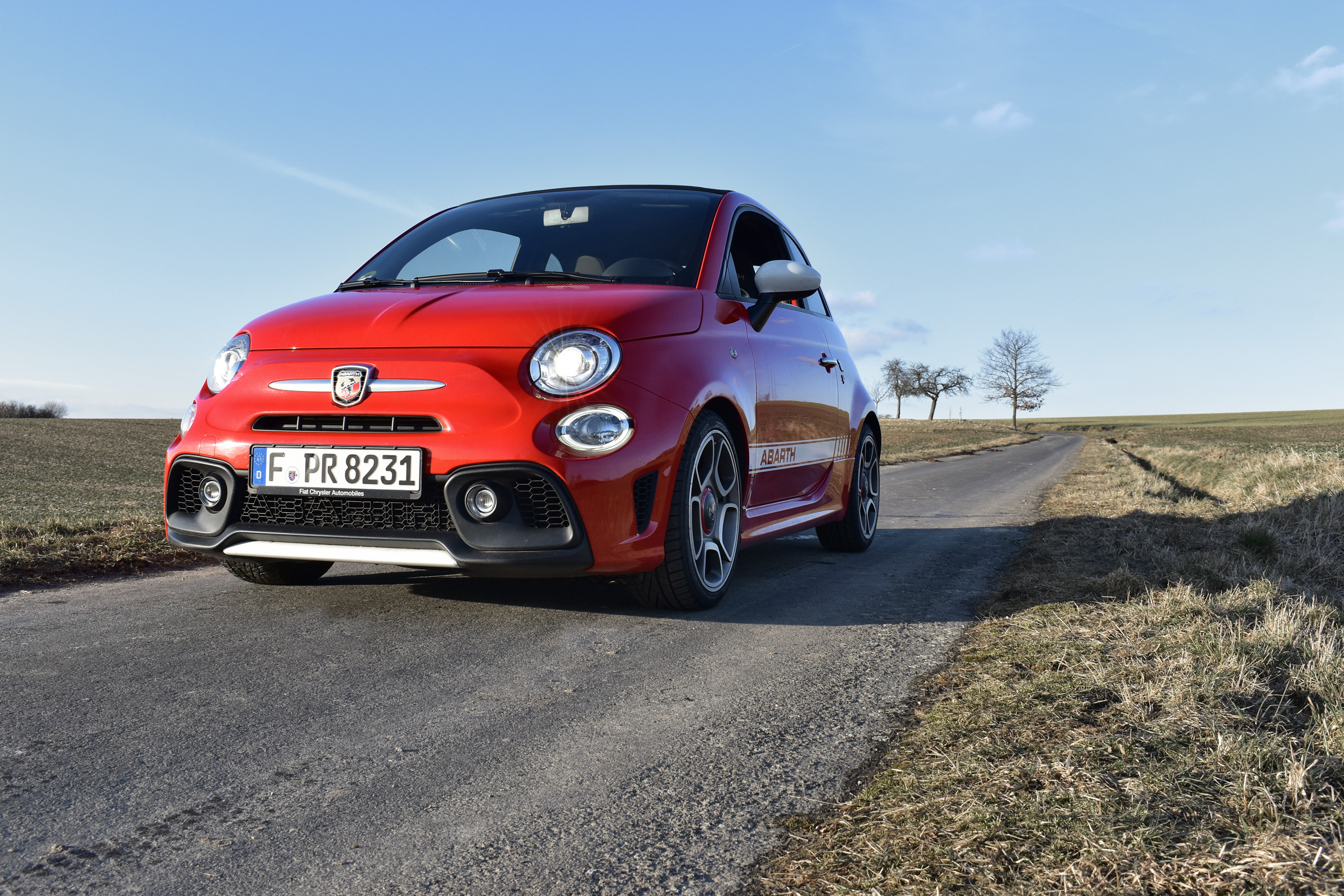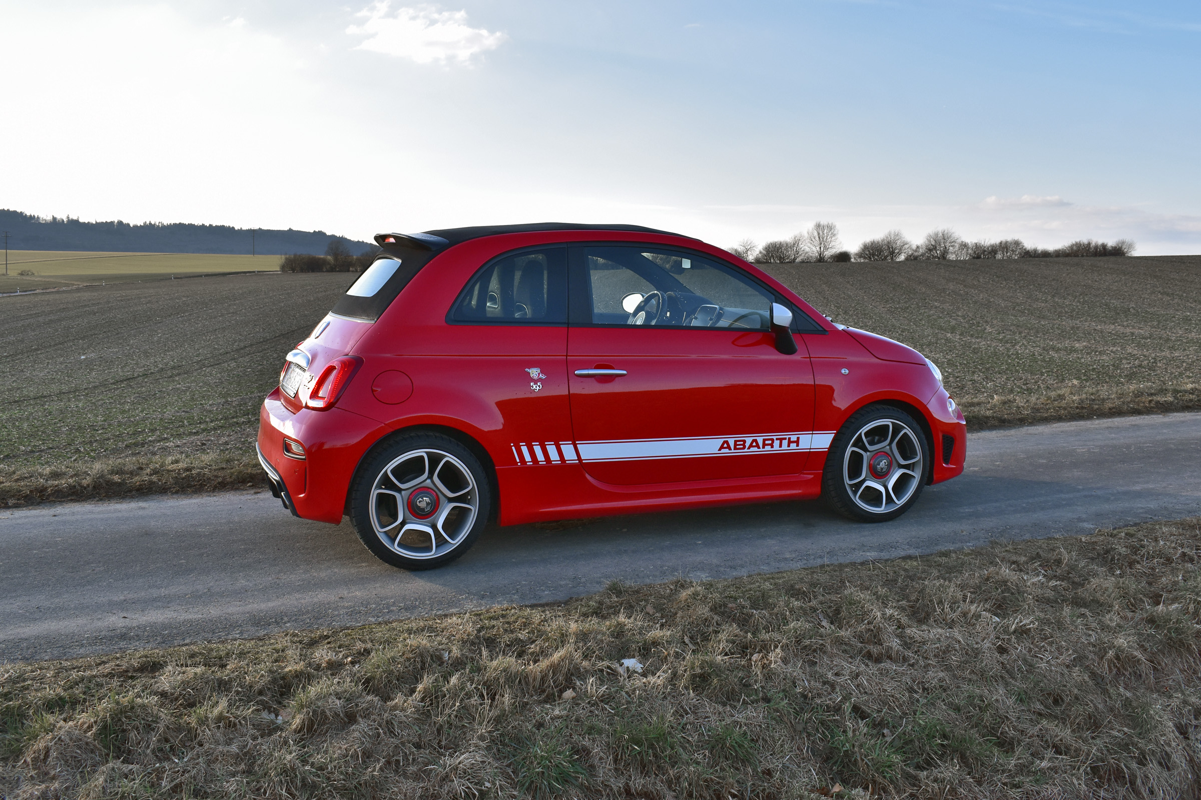 {1}Einmal auf der (freien) Landstraße unterwegs, spielen Gedanken an Überholprestige aber kaum mehr eine Rolle. Zu viel Freude macht es, den 595C durch enge oder langgezogene Kurven zu bügeln. Dabei macht sich das serienmäßige Sportfahrwerk mehr als bemerkbar, hält den Kleinwagen souverän und auch bei schlechten Straßen in der Spur. Die knackige Schaltung tut ihr übriges dazu und sogar störende Antriebseinflüsse konnten wir trotz Winterreifen nur seltenst verzeichnen. Was nicht an fehlender Leistung liegen soll: elastisch dreht der Vierzylinder hoch, wobei er – typisch Turbo – erst bei mittleren Drehzahlen sein volles Drehmoment entfaltet. Darunter passiert nicht viel, sodass man ihn mit fleißigem Schalten bei Laune halten muss. Die Leistungsentfaltung geschieht dabei nicht explosionsartig, sondern fein dosierbar und erst nach dem Blick auf den Tacho realisiert man hinter dem Volant, wie schnell man gerade wirklich ist. Nämlich zu schnell für die meisten anderen Verkehrsteilnehmer.