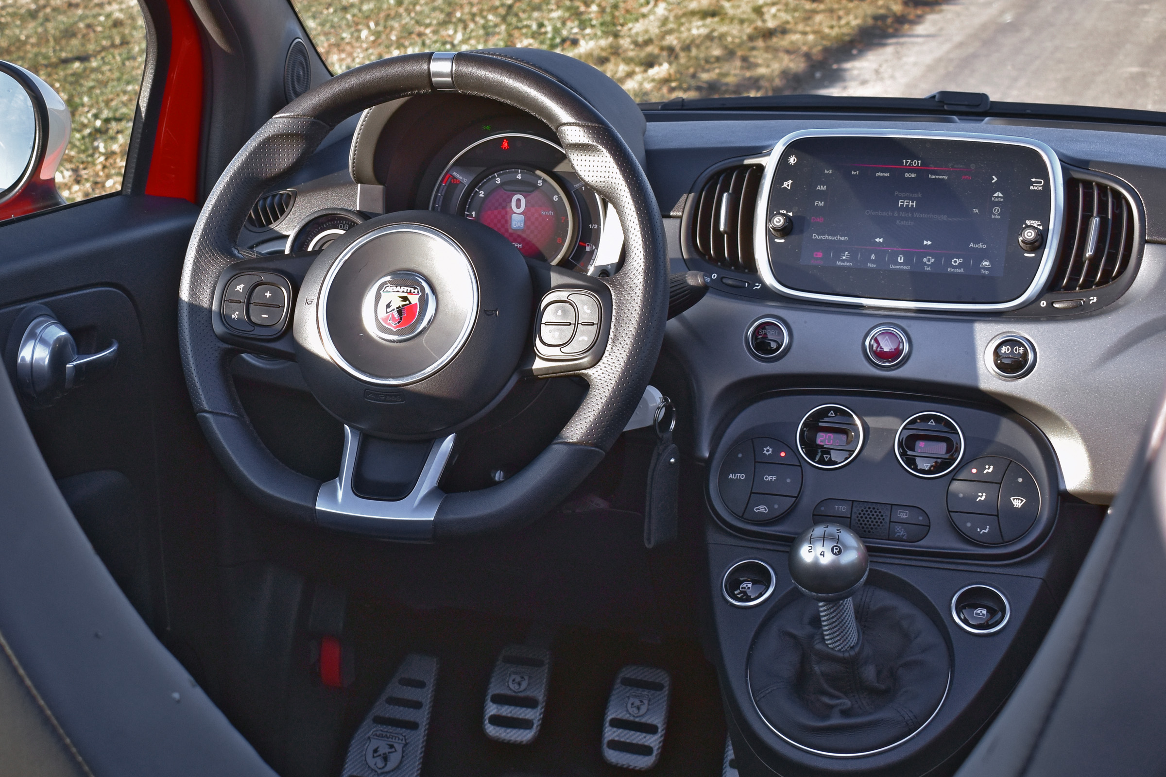 Von außen wie von innen. Wobei bei satten 25.090 Euro Basispreis die Innenausstattung durchaus etwas liebevoller sein könnte, denn sie ist doch sehr vom Hartplastik des Standard-500ers geprägt. Die Standard-Sportsitze in Lederoptik sind zwar Serie und fühlen sich ordentlich an, könnten aber deutlich mehr Seitenhalt vertragen, sodass man bei ambitionierter Fahrweise sicherlich zu den Sabelt-Rennsportsitzen (2.190 Euro) greifen dürfte. Aber sei es drum. Mehr als schick ist das digitalisierte Kombiinstrument, das Grafiken fein animiert und beim Druck auf den „Sport“-Knopf gleich zu einem großen Drehzahlmesser wird. Ebenso gut gefallen hat uns das Multimediasystem mit integrierter Navigation und Digitalradio, das zügig auf Eingabebefehle reagiert und seinen Preis von 990 Euro allemal wert ist.