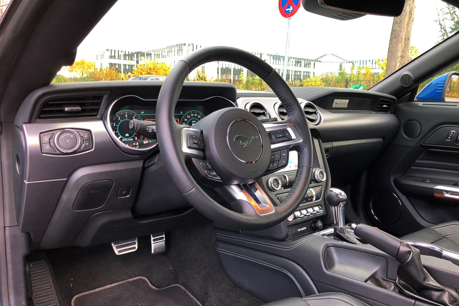 {1}Spielchen an Innenraumfarben sollte man während der Fahrt natürlich tunlichst unterlassen und sich stattdessen aufs Wesentliche konzentrieren. Wie macht sich nun der Mustang Ecoboost im Alltag? Und die wichtigste Frage: Vermisst man den Achtzylinder? Klare Antwort: Ja, man vermisst ihn natürlich. Der „Klang“ des (mit einigen Abweichungen) aus dem Focus RS entliehenen Motors ist, wenn man ihn denn so nennen kann, quasi nicht vorhanden, auch wenn man dem Antrieb sein aufdringliches Dröhnen im Normalbetrieb fein aberzogen hat. Schön ist es dennoch nicht, was da bis an die Ohren der Insassen gelangt. Es ist ein unmotivierter Rauschton, der zu allem Überfluss auch noch etwas angestrengt klingt, sobald man den Motor ein wenig fordert. So greift man gerne und zügig zum Lautstärkeregler der vorzüglichen Soundanlage, die in der Lage ist, sämtliche Geräusche im Umkreis von etwa 1000 Metern wegzubügeln, dass einem im Auto schon zum Feiern zumute ist.