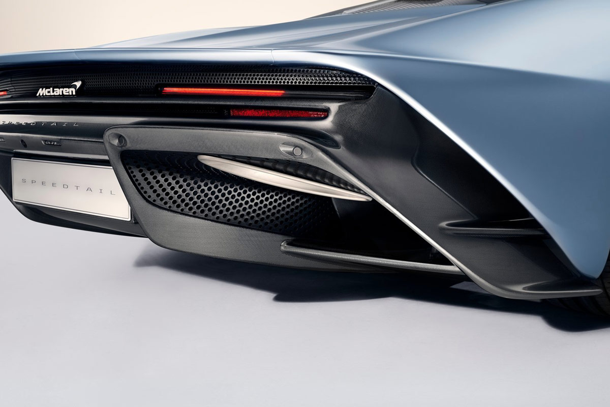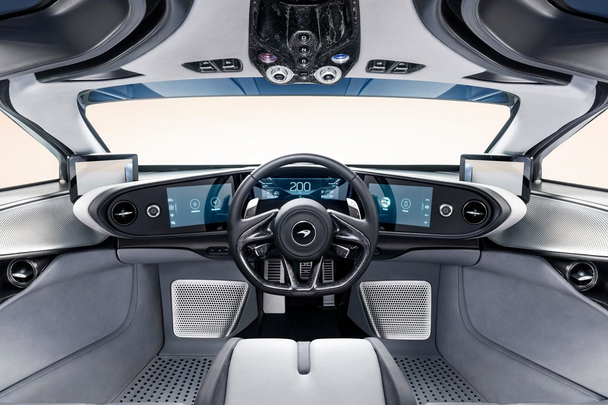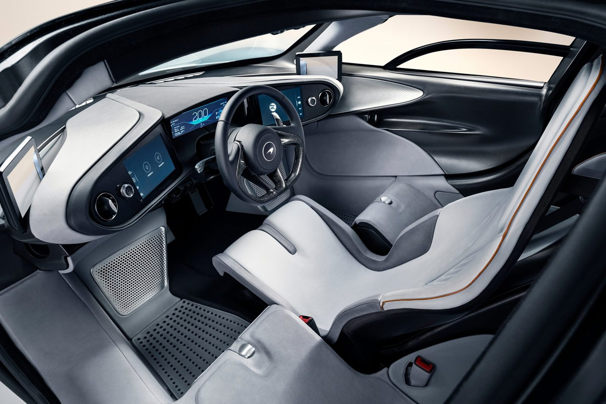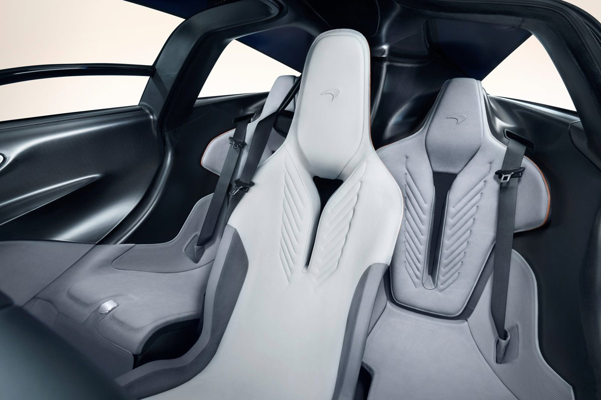 {1} Damit nichts die Aerodynamik des McLaren Speedtail stört, lassen sich die Rückfahrkameras – man verzichtet auf Spiegel – einfahren. Die Karosserie verfügt derweil über eine aktive Luftführung und damit der Fahrer des Speedtail bei Hochgeschwindigkeitsfahrten nicht von der Sonne geblendet wird, lässt sich die Oberseite der Windschutzscheibe elektrochrom verdunkeln. Mit dem Speedtail gelingt McLaren zugleich eine Hommage an den Supersportwagen F1, der bereits in den 1990er Jahren mit seinem ungewöhnlichen Sitzkonzept für Furore sorgte. Der Fahrer sitzt mittig, etwas nach vorne versetzt, wohingegen bis zu zwei Passagiere jeweils außen und weiter hinten Platz nehmen dürfen.