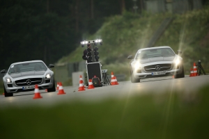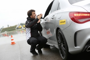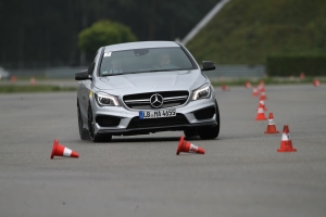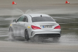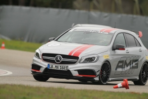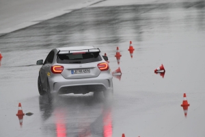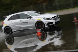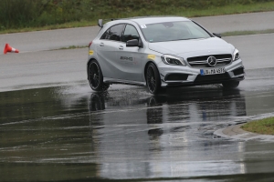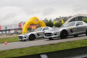 Soweit die Theorie, nun die Praxis. Anfangs ist die Strecke noch nass, als wir in den SLS einsteigen und die zweite Teilnehmergruppe auf den A-Klassen und dem Dunlop Sport Maxx RT die Kreisbahn und den Slalomparcours unsicher macht. Wir wissen – schon der Standard-SLS mit normalen Straßenreifen ist selbst mit eingeschalteten Fahrhilfen eine kleine Zicke auf nasser Straße. Mit den Sport Maxx Race bestückt, entwickelt sich der 20 PS stärkere GT Final Edition auf wässrigem Kurs zu einem Biest, da helfen auch die vier Rillen zur Wasserabführung nicht mehr viel.