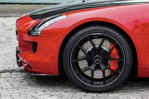 Der Sport Maxx Race auf dem SLS kann seine Stärken erst auf trockener Strecke voll ausspielen. Im engen Handlingparcours vom LuK Driving Center in Baden-Baden erwartet uns eine Offenbarung. Heckschwenks und rauchende Hinterreifen sind nur noch mit Gewalt provozierbar, aber nicht mehr mit einem leichten Gasstoß. Das Musclecar-ähnliche Verhalten – geradeaus geht’s schnell, um’s Eck nur quer – legt der SLS in der GT-Abstimmung und den Sport Maxx Race vollkommen ab. Hart auf die Bremse, präzise die lange Carbonschnauze in Richtung Kurvenscheitel dirigieren, sofort wieder ans Gas: Mit welch chirurgischer Genauigkeit sich der 1,6-Tonner auf dem schmalen Geläuf auf einmal bewegen lässt, ist nahezu unwirklich. Die Traktion an der Hinterachse ist es ebenfalls. Die Reifen machen aus dem SLS nicht nur ein völlig neues Auto. Sie sind auch eine der besten Arten, das Wochenende einzuläuten.