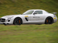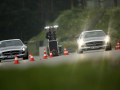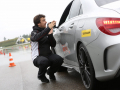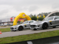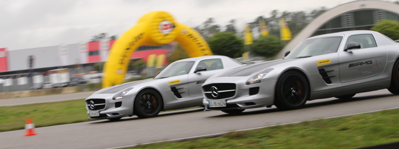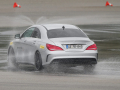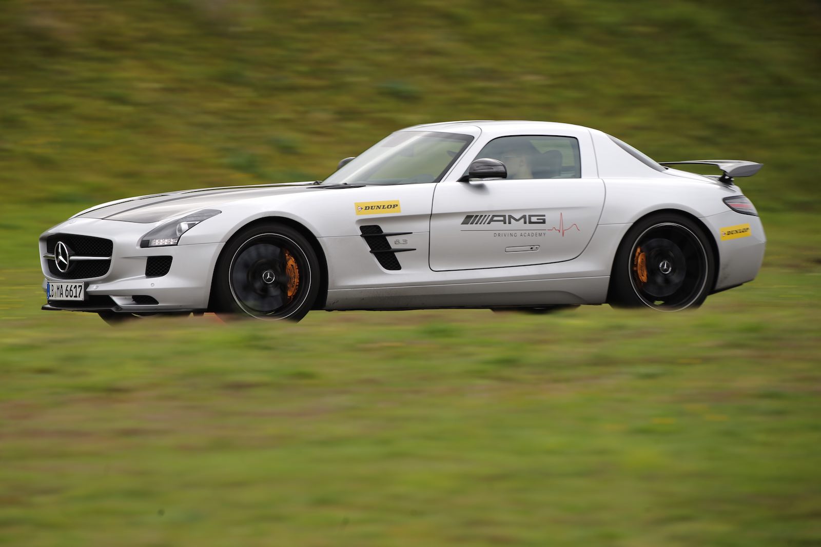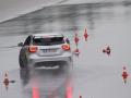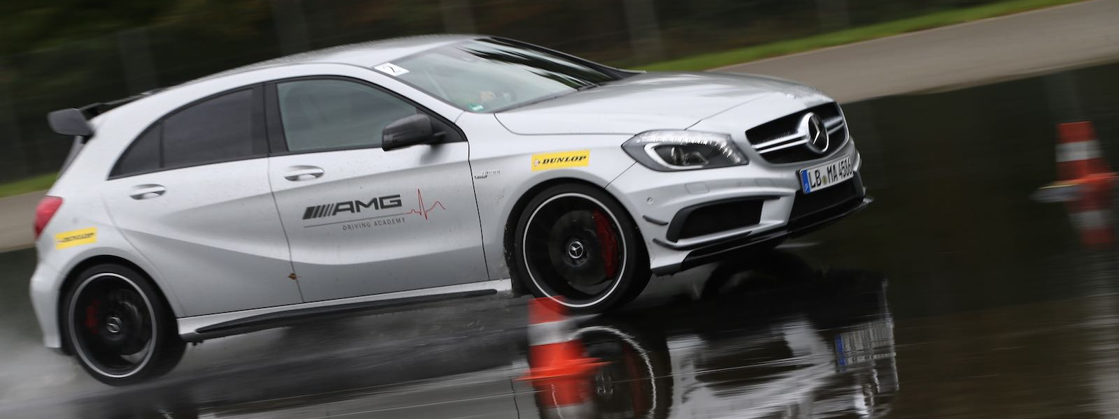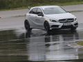 Soweit die Theorie, nun die Praxis. Anfangs ist die Strecke noch nass, als wir in den SLS einsteigen und die zweite Teilnehmergruppe auf den A-Klassen und dem Dunlop Sport Maxx RT die Kreisbahn und den Slalomparcours unsicher macht. Wir wissen – schon der Standard-SLS mit normalen Straßenreifen ist selbst mit eingeschalteten Fahrhilfen eine kleine Zicke auf nasser Straße. Mit den Sport Maxx Race bestückt, entwickelt sich der 20 PS stärkere GT Final Edition auf wässrigem Kurs zu einem Biest, da helfen auch die vier Rillen zur Wasserabführung nicht mehr viel.