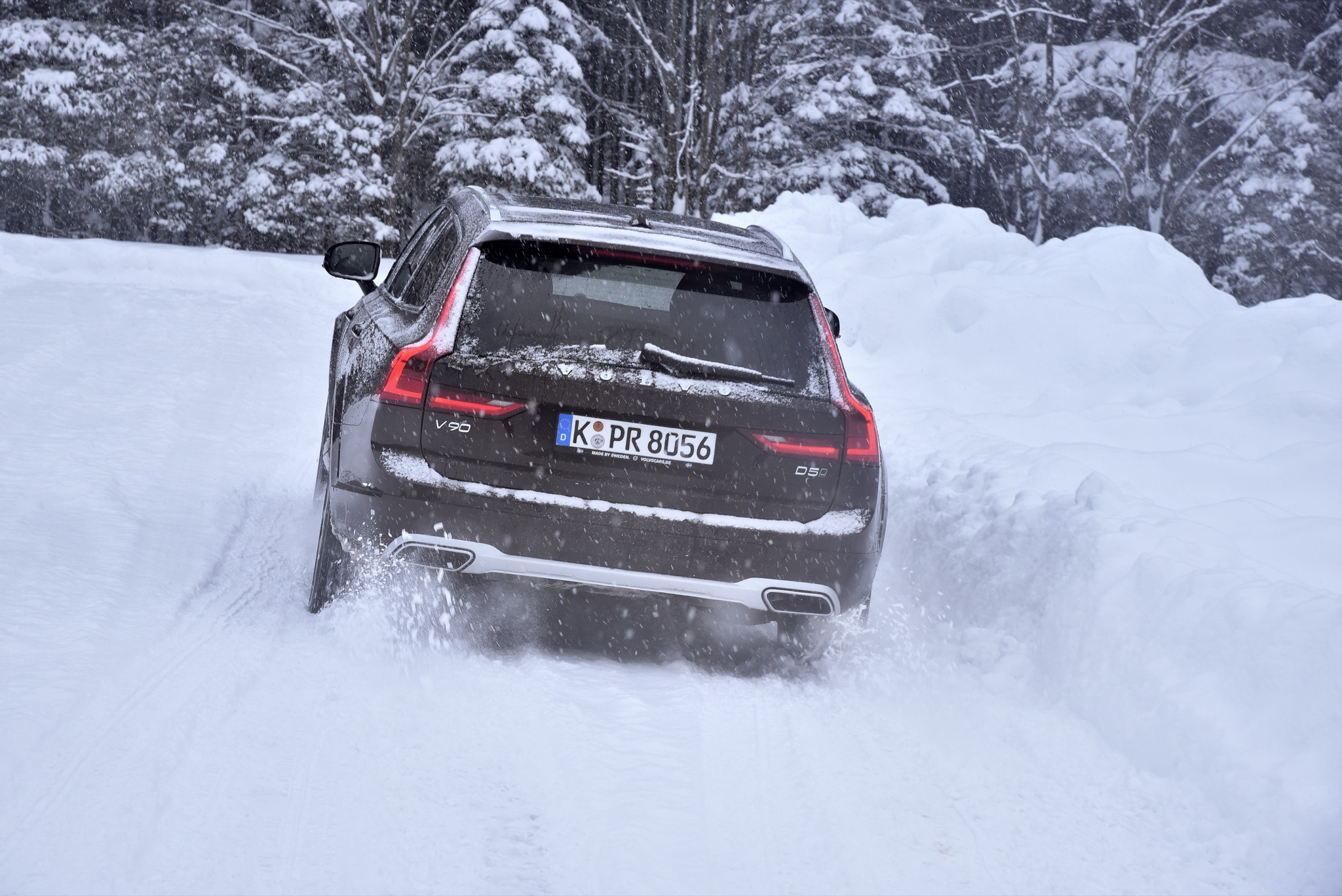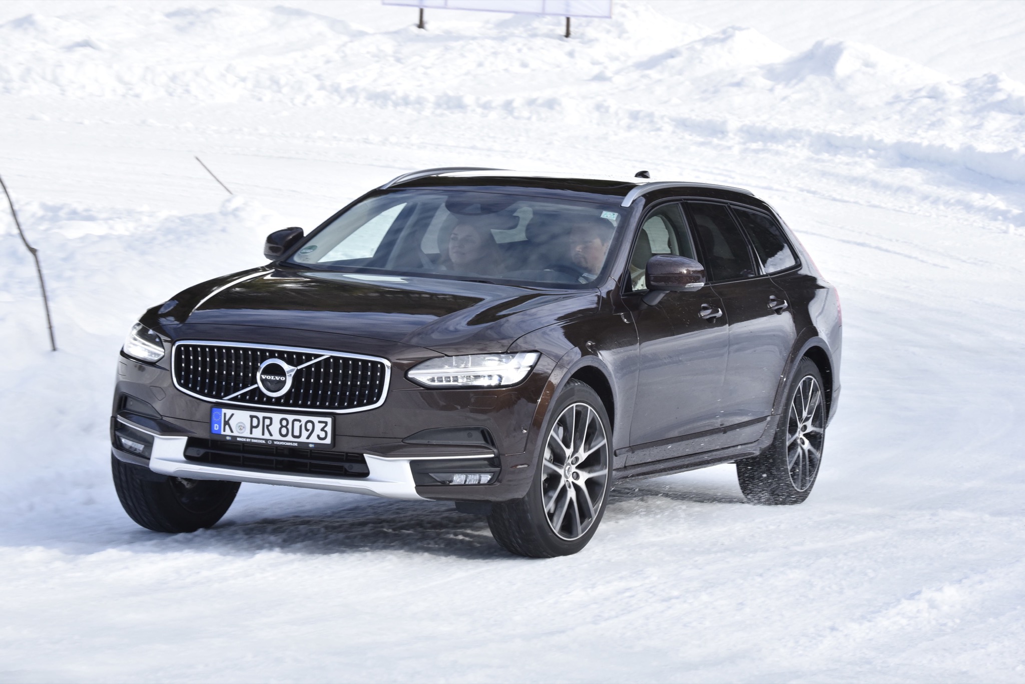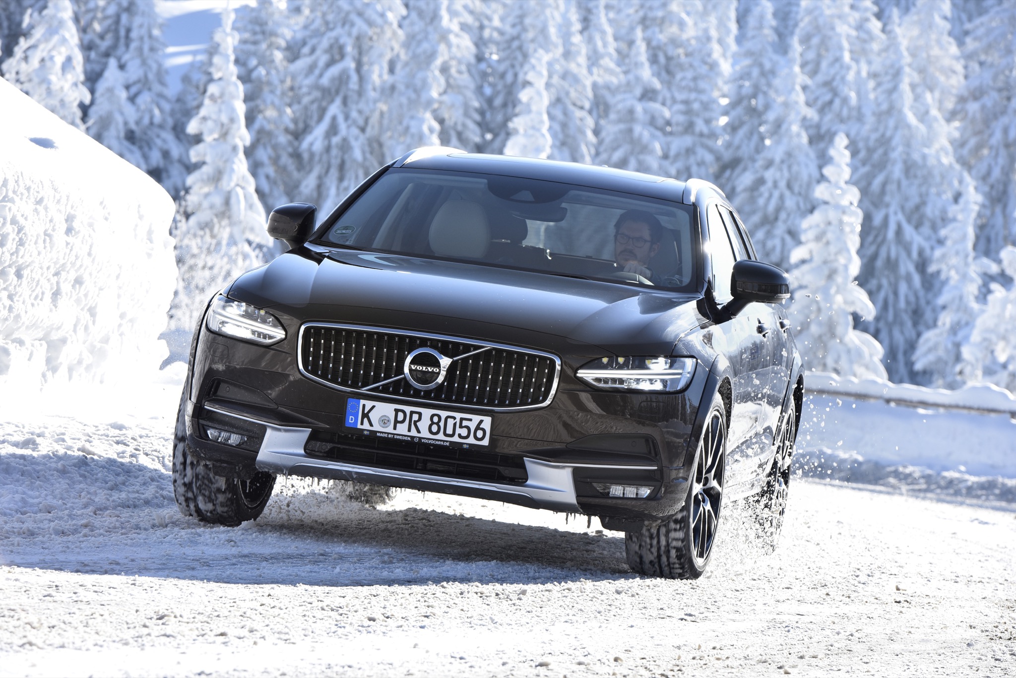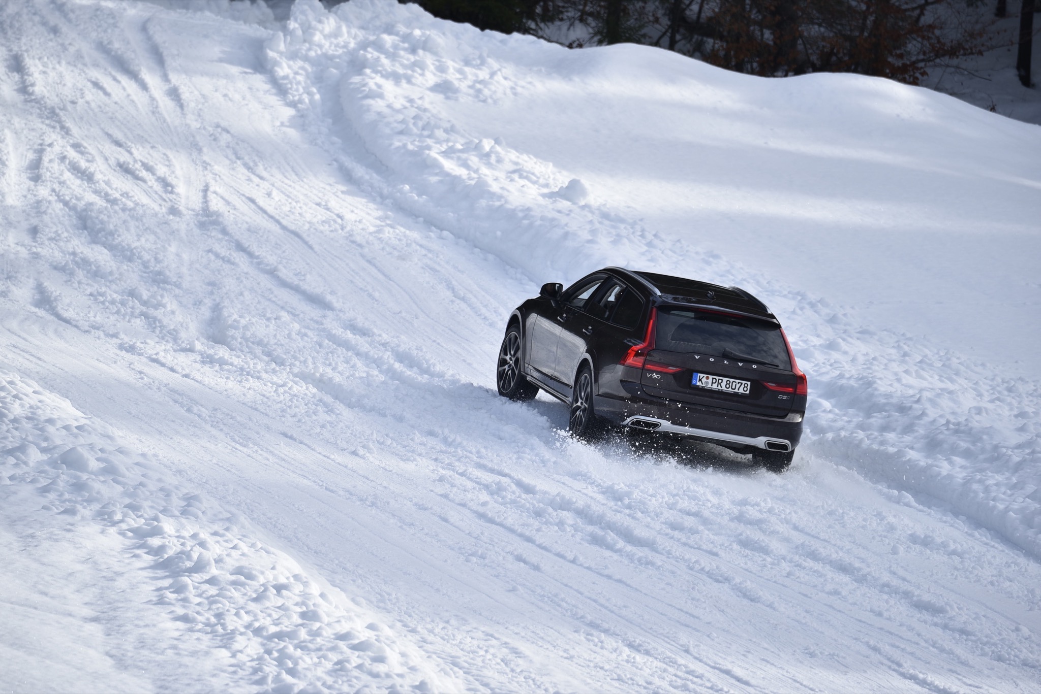 Dafür, dass der Spaß nicht zu sehr ausartet, sorgt der elektronisch gesteuerte Allradantrieb, der den dicken Schweden nach kurzem Streifen der Schneemauer wieder zurück auf die richtige Bahn zieht. Abseits wilder Benutzung des Gaspedals vermittelt der V90 auch bei schlechten Straßenverhältnissen aber eine derartige Stabilität und Sicherheit, dass es kaum vorstellbar ist, einmal ungewollt in eine Grenzsituation zu kommen. Falls doch, werden die Passagiere automatisch von den Sicherheitsgurten festgezurrt – das System agiert jedoch sehr feinfühlig und greift erst ein, wenn der V90 schon beinahe im 90-Grad-Winkel zur Fahrbahn „fährt“. Und als es einmal nicht mehr weiterging, half uns zumindest kurzzeitig der für den Cross Country exklusive OffRoad-Fahrmodus, der bis 40 Km/h aktiv ist und die Kraft permanent auf alle vier Räder verteilt und zudem eine automatische Bergabfahrhilfe beinhaltet.