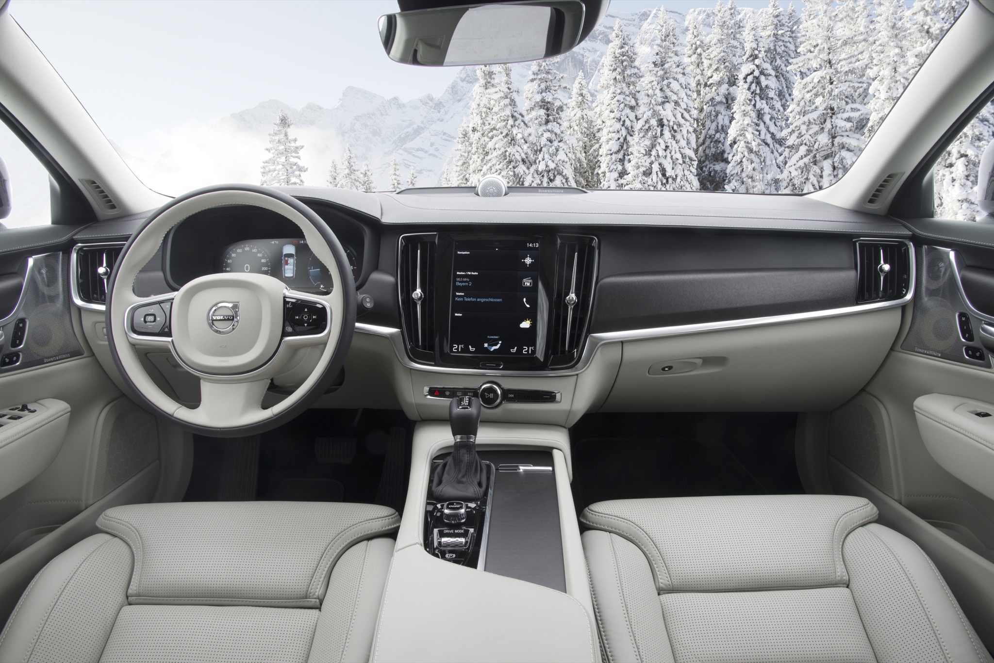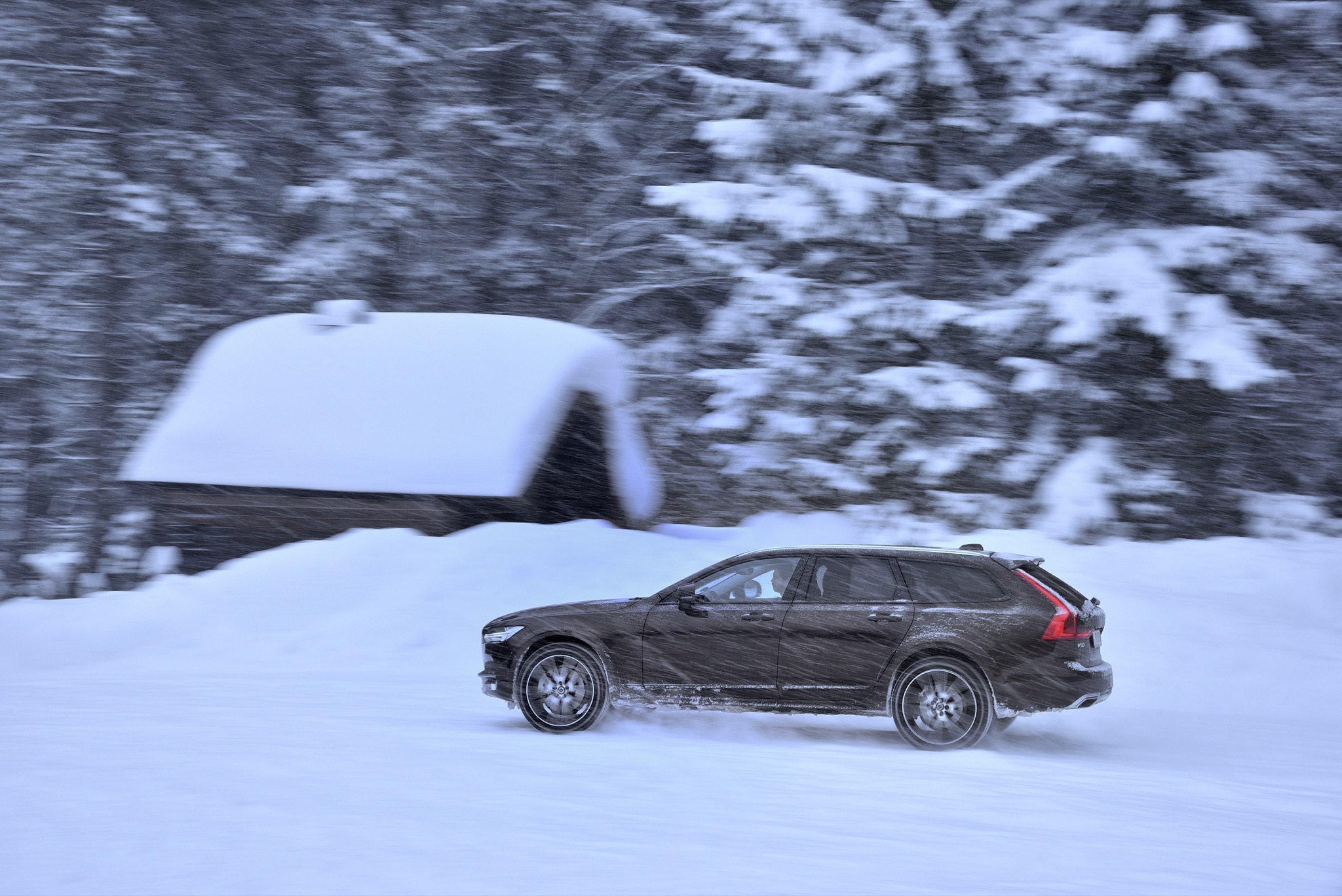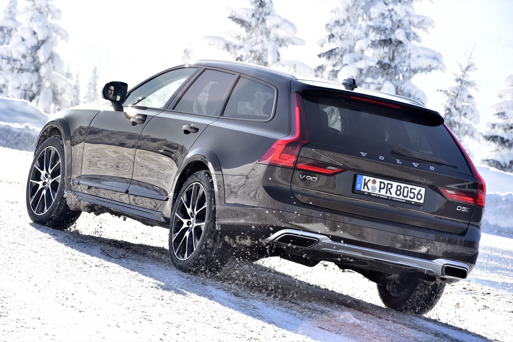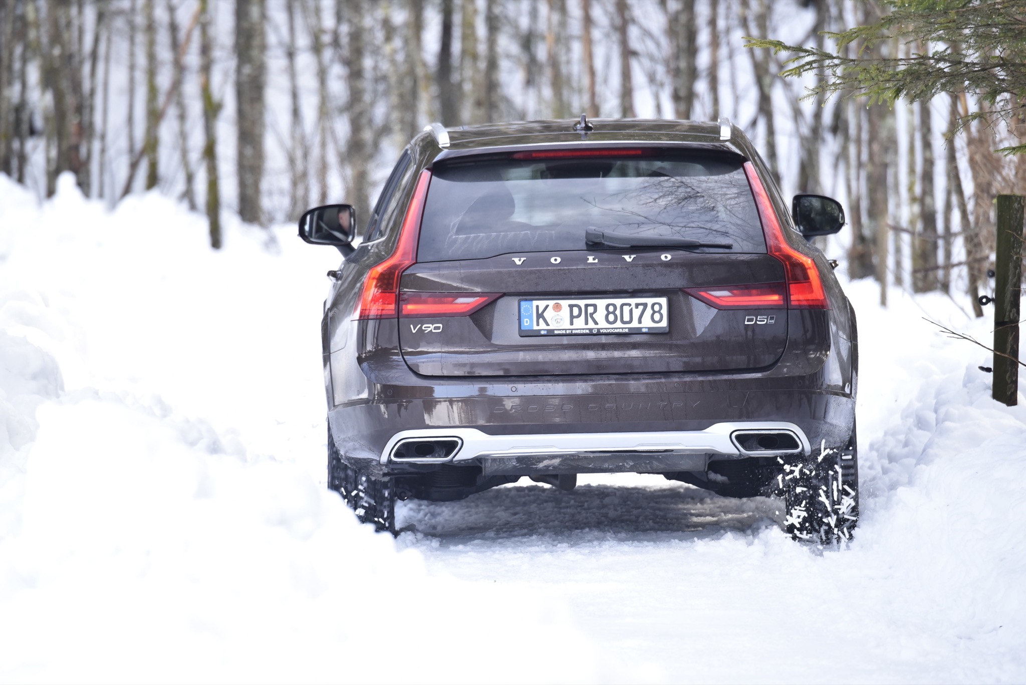 Dafür, dass der Spaß nicht zu sehr ausartet, sorgt der elektronisch gesteuerte Allradantrieb, der den dicken Schweden nach kurzem Streifen der Schneemauer wieder zurück auf die richtige Bahn zieht. Abseits wilder Benutzung des Gaspedals vermittelt der V90 auch bei schlechten Straßenverhältnissen aber eine derartige Stabilität und Sicherheit, dass es kaum vorstellbar ist, einmal ungewollt in eine Grenzsituation zu kommen. Falls doch, werden die Passagiere automatisch von den Sicherheitsgurten festgezurrt – das System agiert jedoch sehr feinfühlig und greift erst ein, wenn der V90 schon beinahe im 90-Grad-Winkel zur Fahrbahn „fährt“. Und als es einmal nicht mehr weiterging, half uns zumindest kurzzeitig der für den Cross Country exklusive OffRoad-Fahrmodus, der bis 40 Km/h aktiv ist und die Kraft permanent auf alle vier Räder verteilt und zudem eine automatische Bergabfahrhilfe beinhaltet.