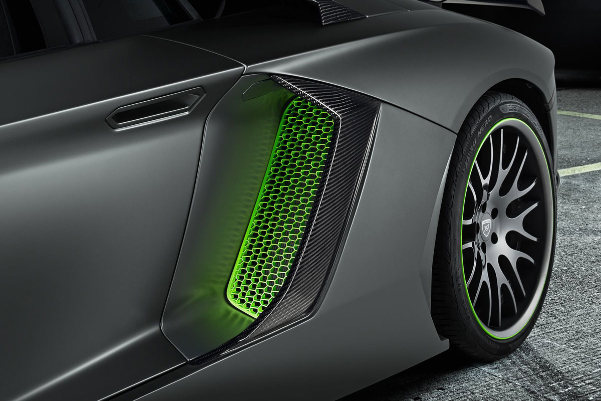 Um sich von dem quasi zum Massenauto verkommenem normalem Aventador abzuheben, verfügt der Limited über eine neue Carbon-Frontschürze, Seitenschweller und Heckspoiler. Heckschürze und Diffusor wurden durch Teile aus Carbon ersetzt, dazu kommt ein neuer Endschalldämpfer, den es wahlweise auch als „Backfire“-Variante gibt, dessen Eigenheit sich von selbst erklären dürfte. Über der normalerweise gläsernen Motorraumabdeckung erhebt sich eine gift-grün lackierte Lufthutze, die den 6,5-Liter-V12 mit zusätzlicher Frischluft versorgt. Passend dazu sind alle Lüftungsschächte gleichfarbig eingefärbt.