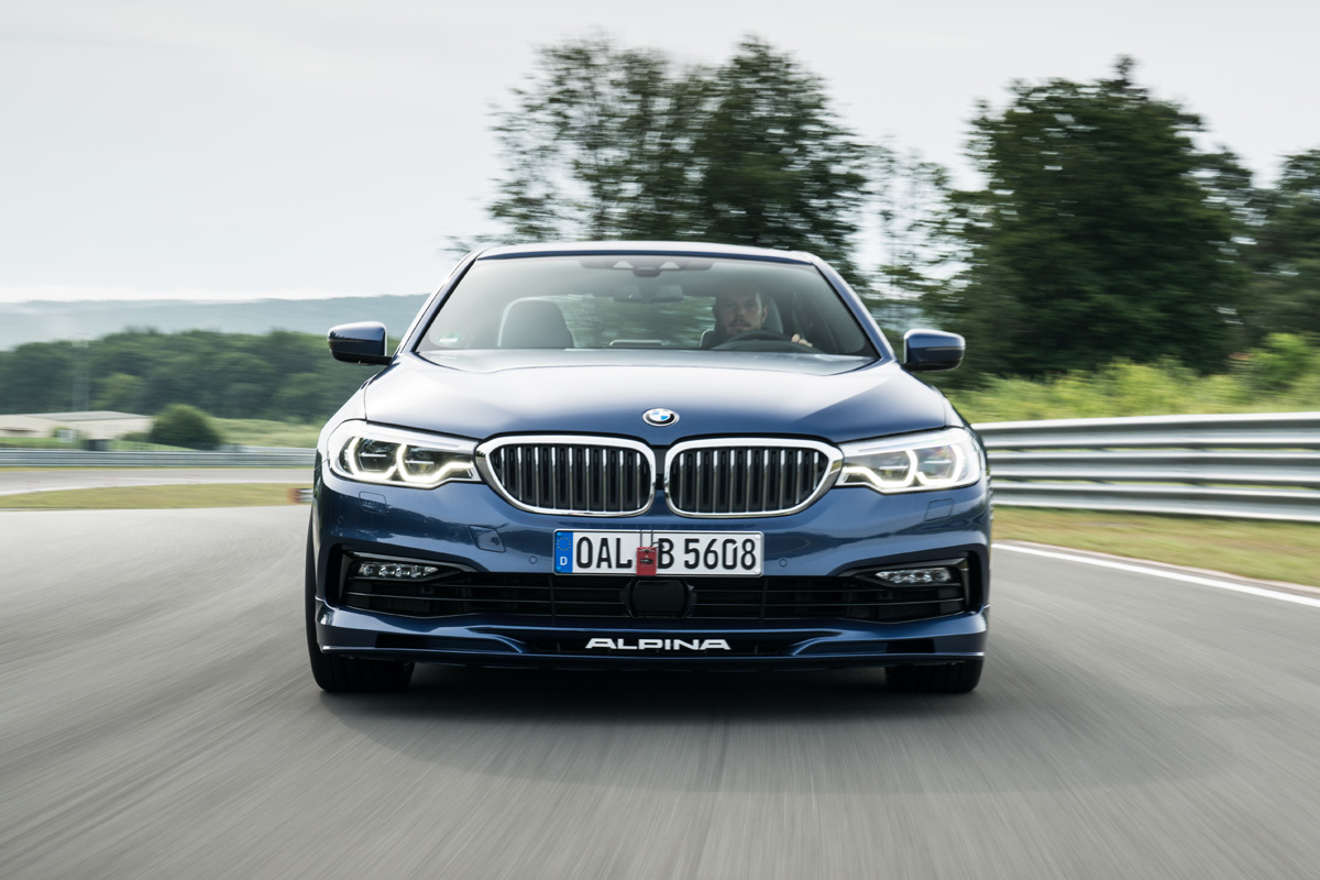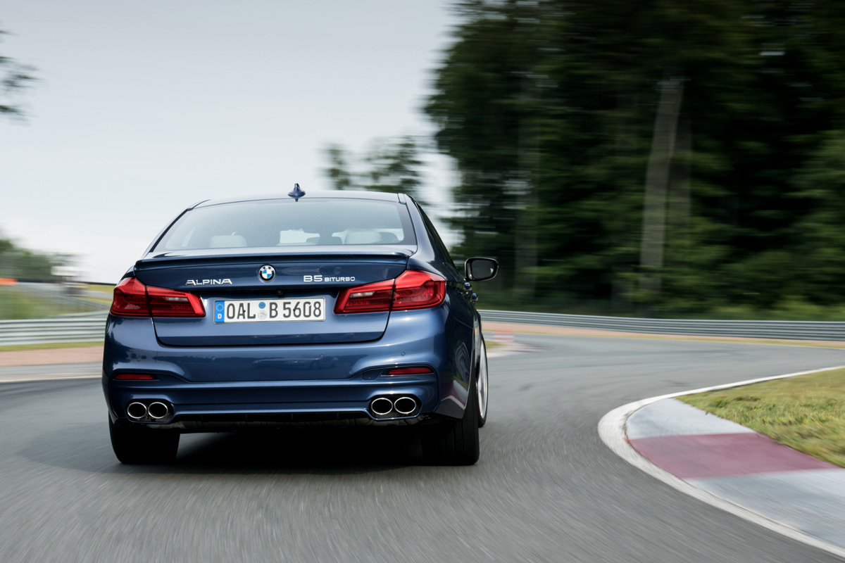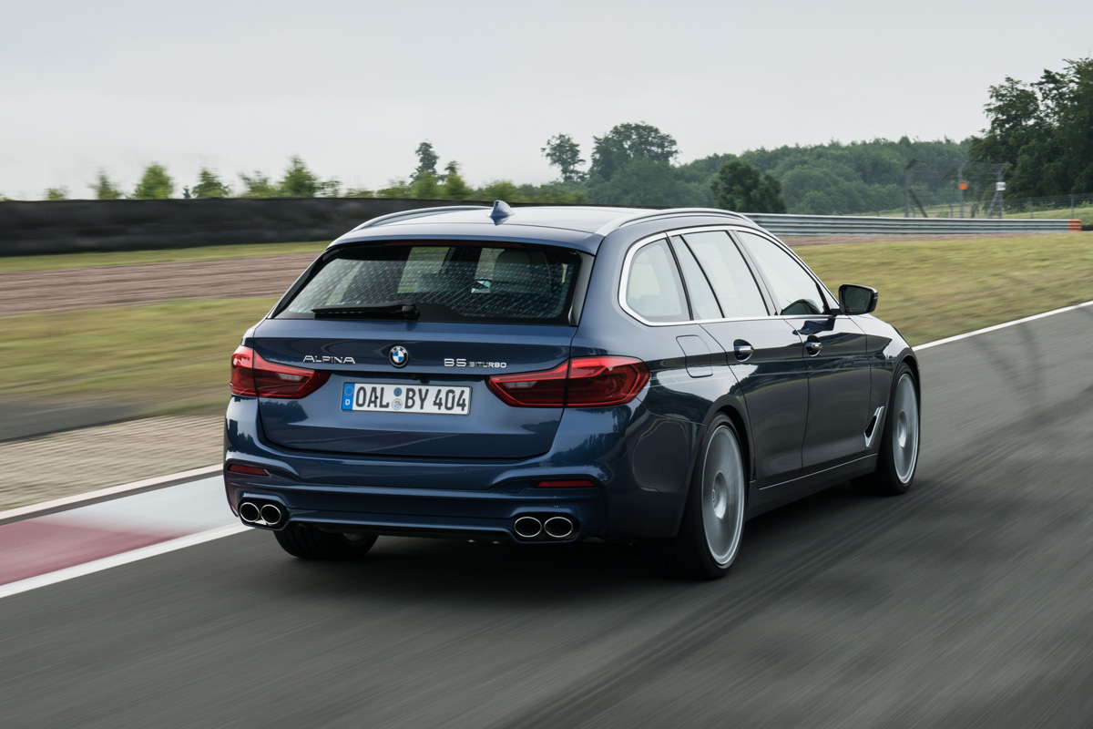 {1}Bereits ab 2.000 Umdrehungen liegen 670 Newtonmeter an, ab 3.000 Umdrehungen steht das maximale Drehmoment zu Verfügung. Der Benziner wird gefühlt zum Diesel. Im Gegensatz zu drehmomentstarken Selbstzündern geht dem BMW Alpina B5 Bi-Turbo im oberen Drehzahlbereich jedoch nicht die Puste aus. 330 km/h schnell ist der Buchloer Businessjet als Limousine; der Touring folgt bis 325 km/h. 3,5 Sekunden vergehen auf Tempo 100, in gut 11,4 Sekunden (Limousine) fällt die 200 km/h Marke – selbstredend aus dem Stand! Gegner? Bei der Endgeschwindigkeit vielleicht ein Porsche 911 Turbo S, der weder vier ausgewachsenen Herrschaften, noch deren Gepäck Platz bietet. Wer noch mehr Lasten mit sich herumfahren will greift zum Kombi.