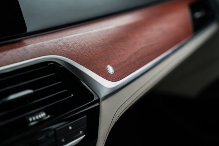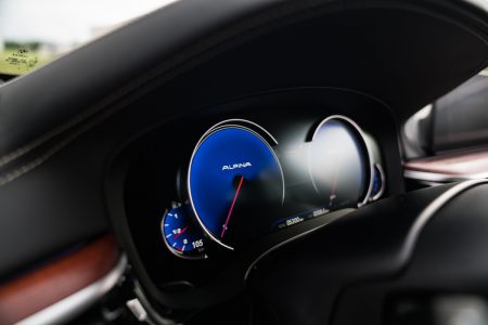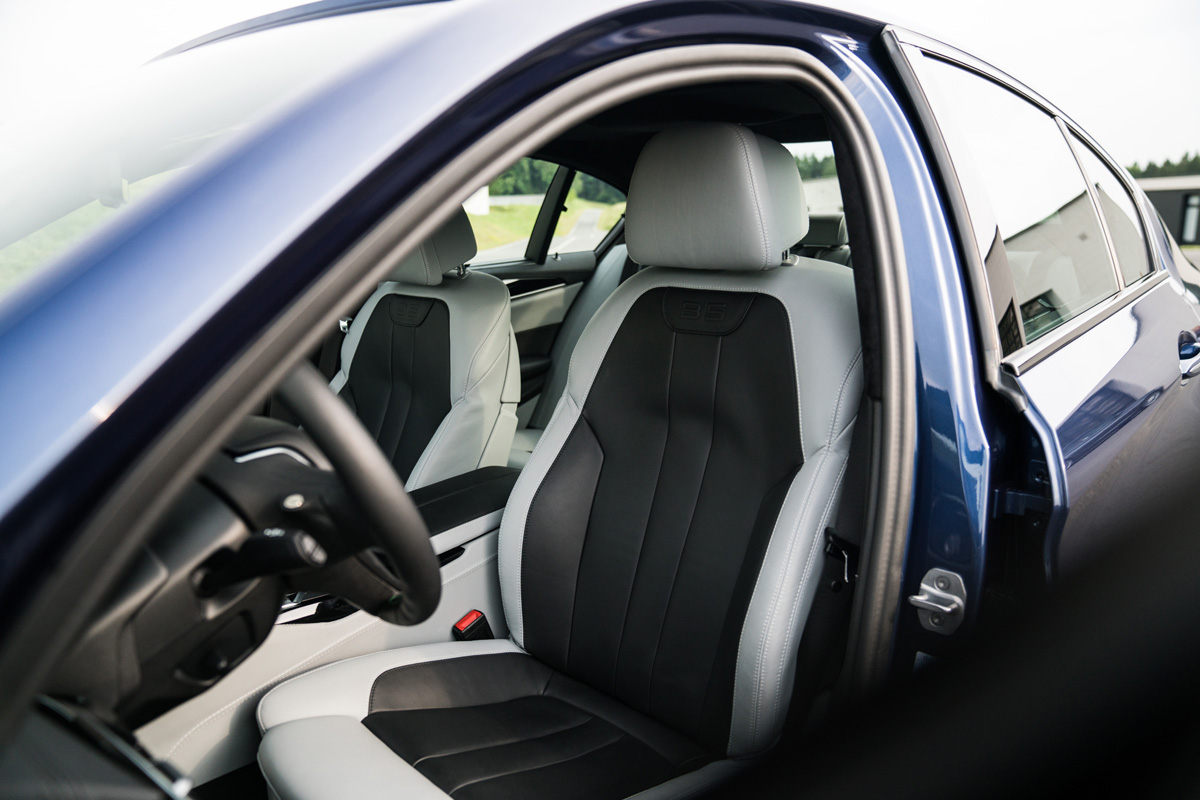Und auch im Innenraum des neuen BMW Alpina B5 Bi-Turbo geht es betont sportlich-elegant zur Sache. Begrüßt werden wir, serienmäßig, von einem volldigitalen Kombiinstrument in den bekannten Alpina-Farben blau und weiß mit roter Anzeigennadel. Im Sportmodus wird die Anzeige zusätzlich um grüne Akzente erweitert. Komfortsitze mit Nappa-Leder bezogen, eine 4-Zonen Klimaautomatik, BMWs Professional Navigation inklusive Connected-Drive Paket, ein HiFi-Soundsystem und LED-Scheinwerfer gehören u.a. zur Serienausstattung des B5. Freilich wird es bei den meisten Kunden nicht dabei bleiben. Ist Alpina doch bekannt für seine hochwertigen und individuellen Innenräume. Lavalina heißt hier das Maß der Dinge bei den Lederbezügen. Überdies trägt das mit blau/grünen Fäden genähte Sportlederlenkrad zum gewohnt hochwertigen Alpina-Erscheinungsbild bei. Auf vielfachen Kundenwunsch gibt es am Lenkrad erstmals Schaltpaddles, statt der üblichen Druckknöpfe, zu bestellen. Mit ihnen lässt sich die serienmäßige 8-Gang-Switch-Tronic, im Vergleich zum Vorgänger, eine Spur präziser schalten.