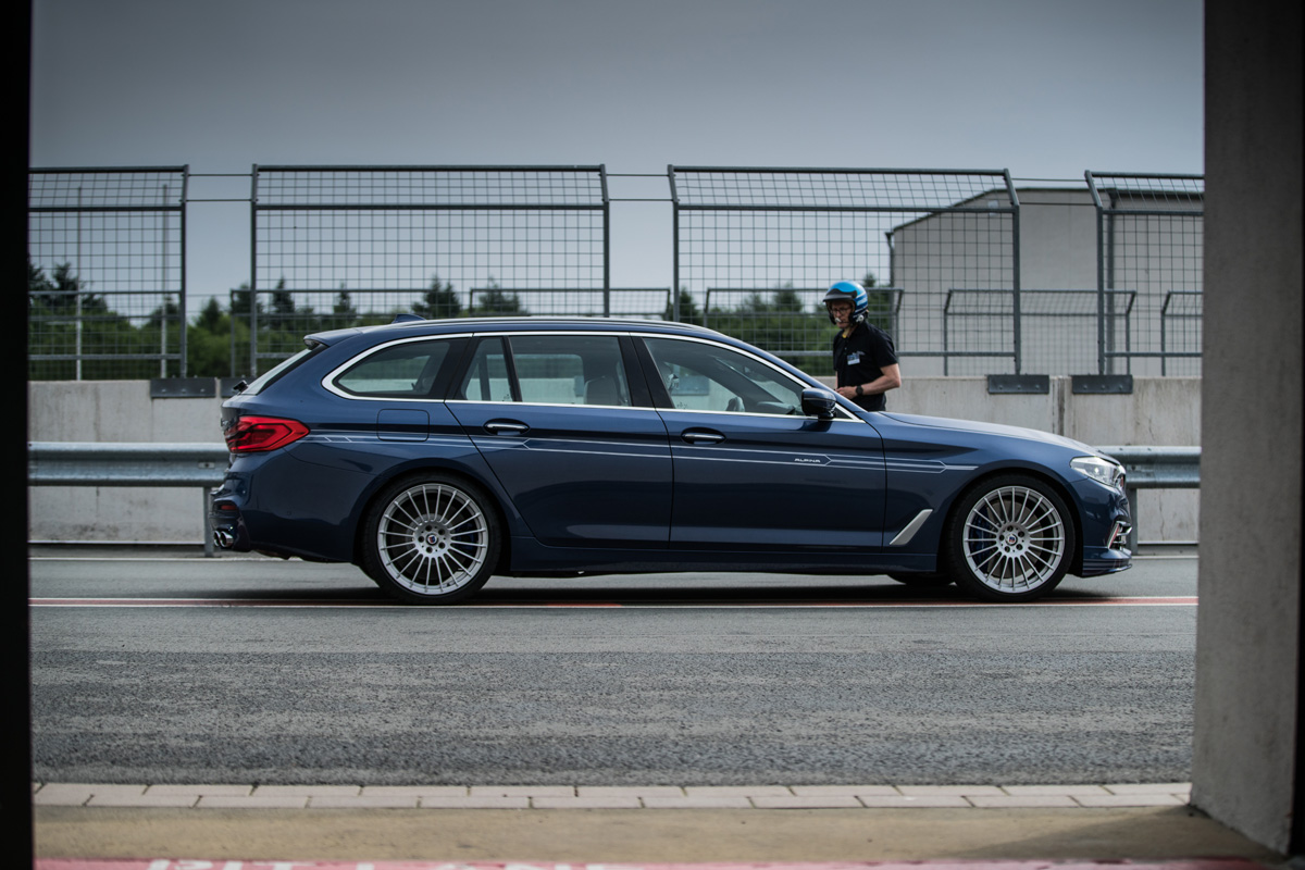Ein Touring also, der 325 km/h Spitze läuft? Vor einigen Jahren noch undenkbar. Und selbst in Zeiten von Mercedes–AMG E 63 S 4Matic+ und Audi RS 6 Avant Performance ein Novum, fahren beide Konkurrenten doch (optional) bei 300, respektive 305 km/h, in den elektronischen Begrenzer. Alpina hingegen lässt seinen B5 ab Werk so schnell laufen wie er kann und so schnell der Fahrer es sich zutraut. Auf dem Bilster Berg bot sich diese Gelegenheit nicht. Mehr als 200 km/h sind hier streckenbedingt für den Normalfahrer schwierig zu erreichen, 250 km/h laut Streckenplan wohl machbar.