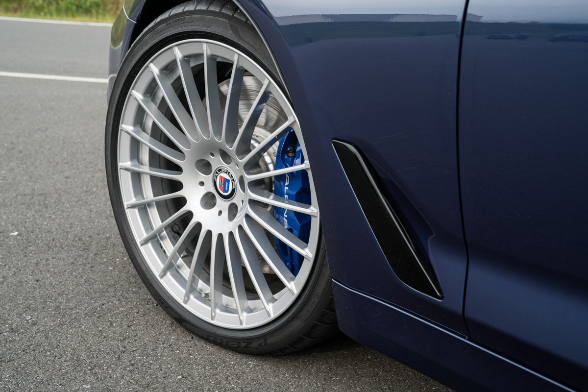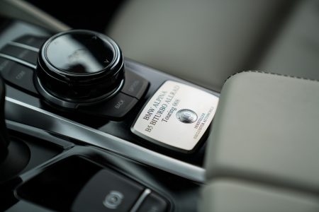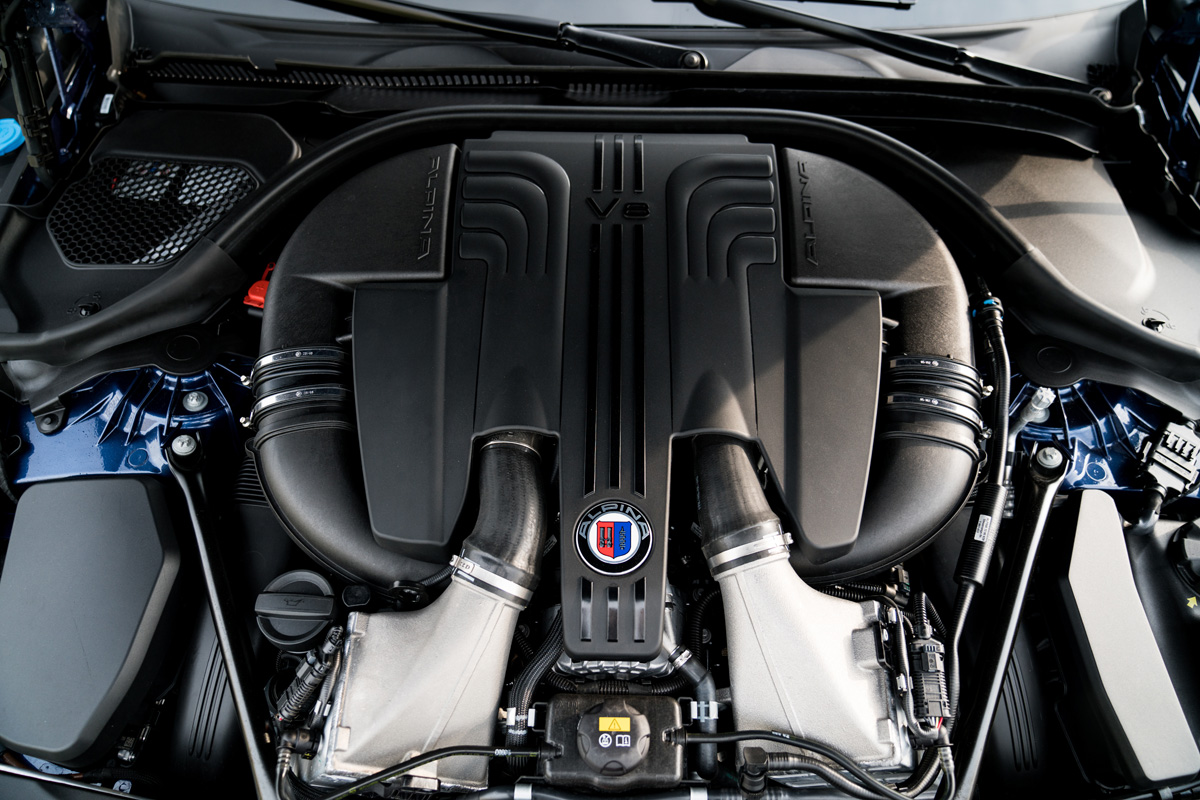 {1} Im Comfort+ Modus wollen wir am liebsten sofort die Autobahn erobern, den bärenstarken und stets unaufgeregten V8 seine saubere Arbeit vollführen lassen. Uns von dem betörenden Klang der Edelstahlabgasanlage beschallen lassen. Nie übertrieben, das richtige Maß an Zurückhaltung findend, wissen wir immer um die schiere Kraft die vor uns sitzt. Die serienmäßige 8-Gang Alpina Switch-Tronic schaltet stets passend, im Sportmodus geradezu blitzartig. Schaltzeit: ca. 1/10 Sekunde! Geschmeidig rollen die serienmäßigen 20 Zöller im gewohnten Alpina Design ab. Erstmals allerdings mit Pirelli P Zero (inklusive Alpina Kennzeichnung), statt mit Michelin Pneus. In Verbindung mit dem elektronisch geregelten Fahrwerk, das in Zusammenarbeit mit ThyssenKrupp-Bilstein konstruiert wurde, ergibt sich ein äußerst ausgewogenes Fahrverhalten.