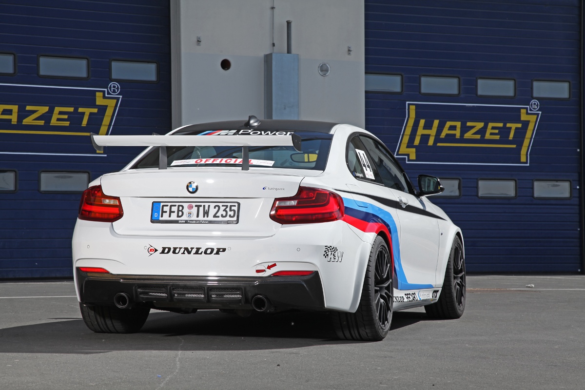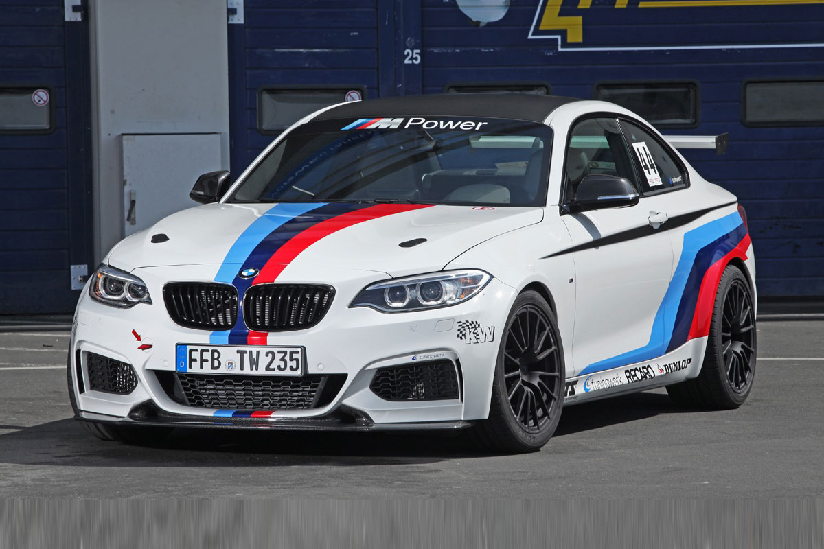Er sieht aus, als käme er gerade frisch von der Rennstrecke (kam er auch) und hätte dabei der Konkurrenz die Schweißperlen auf die Stirn getrieben (hatte er auch). Der M235i vom Tuningwerk aus Puchheim bei München fällt bereits im Stand aus vielen Rahmen, denn Worte wie „unauffällig“ oder „dezent“ haben die Jungs für diesen Wagen aus ihrem Wortschatz bereitwillig gestrichen. „Radikal“ und „kompromisslos“ beschreiben die Optik des 2er Coupés, das mit über 440 PS aufwarten kann, deutlich besser.