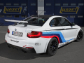 {bmw}Nutzt man dabei mal das Drehzahlband aus, offenbart sich seine andere, nach außen getragene Persönlichkeit: Mit 444 PS und 600 Newtonmeter Drehmoment (Serie: 326 PS und 450 Newtonmeter) packt er kräftig an und entfacht ab 3.500 U/min ein wahres Feuerwerk an Sound, Leistungsentfaltung und Emotionen. Die Beschleunigung ist in Verbindung mit dem gesenkten Gewicht von 1.490 Kilogramm (Serie: 1.550 Kilogramm) über alle Zweifel erhaben und Kurven werden dank verstellbarem KW ClubSport Fahrwerk zur Spielwiese der Sportreifen, die sich unerbittlich mit dem Asphalt verzahnen. Die Differentialsperre von Drexler erlaubt in diesem Zusammenspiel eine Traktion, die man normalerweise nur von Sportwagen anderer (Preis-) Kategorien kennt. Und wer dann doch etwas zu schnell unterwegs war, kann auf Brembo-Stopper mit 350er Scheiben vertrauen. Das macht Spaß und so süchtig, dass jede Probefahrt zwangsweise zu kurz ist. Doch mehr als nur eine Probefahrt hat natürlich seinen Preis: Los geht’s bei 65.000 Euro.