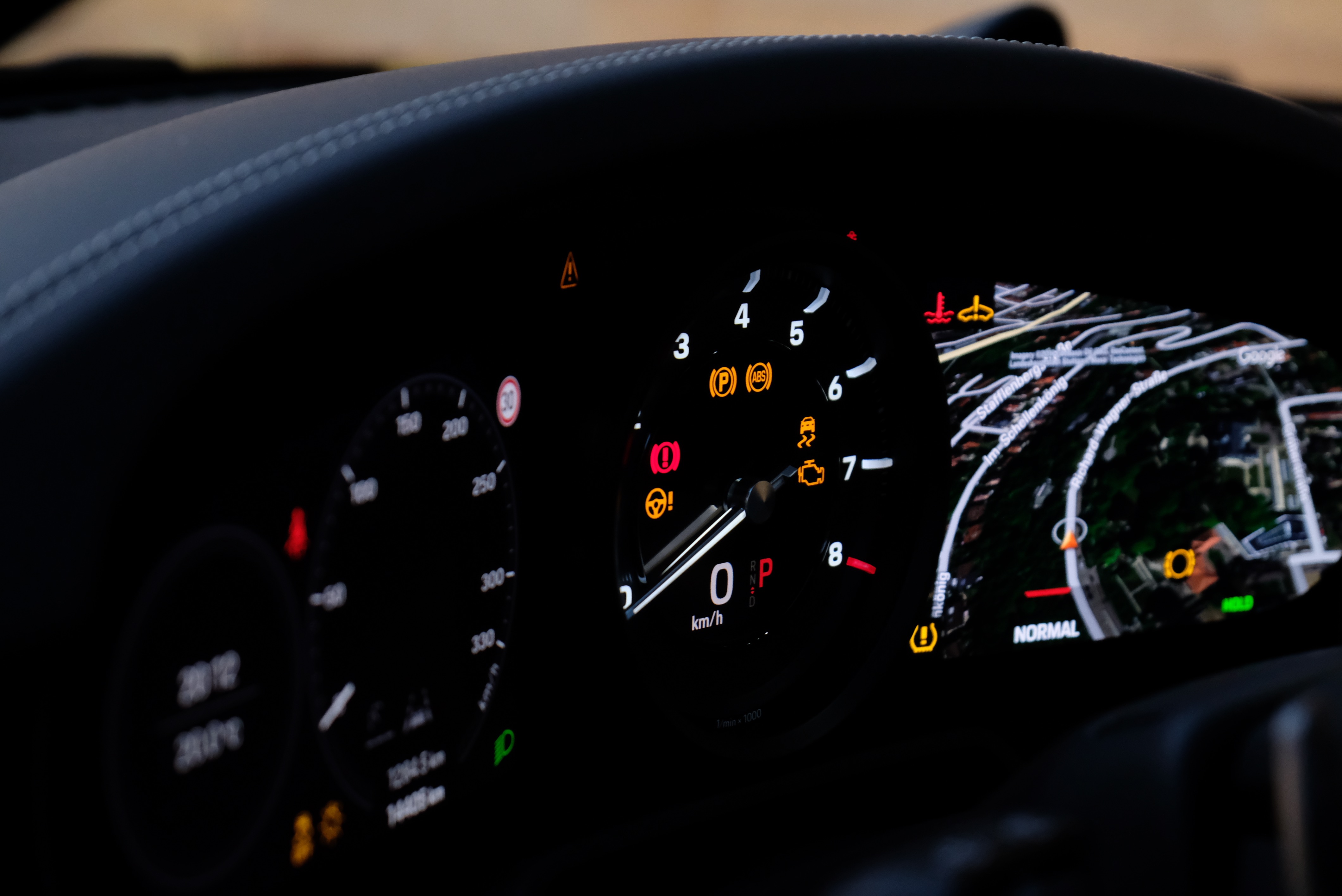 Bekanntlich liegt die Stärke der Heckmotor-Porsche aber in der flotten Kurvenfahrt. Also runter von der Bahn, rein in das Kurvengeschlängel des Albaufstiegs. Du spannst den 992 jetzt zusätzlich vor: am Lenkrad das Fahrdynamik Rändelrad auf Sport Plus gedreht und in diesem herrlich reduziertem Cockpit den Schalter für den aktiven Wankausgleich gedrückt. Am Touchscreen prüfst Du noch in den Fahrzeugeinstellungen, ob die Sportabgasanlage auf Krawall gebürstet ist, optimierst schnell noch deine Sitzposition von Cruising auf Racing und denkst: „Feuer“. Noch bevor dieser Gedanke verflogen ist, katapultiert sich der Elfer vehement zur nächsten Spitzkehre. Hart bremst du bis in den ABS Regelbereich tief in die Spitzkehre rein. Doch das bringt die Keramikbremse nicht einmal zum Erröten und der derbe Tritt auf das Gaspedal am Kurvenausgang lässt den 911er nicht einmal ansatzweise die Haftung verlieren. Im Gegenteil! Die aktive Hinterachslenkung gibt dir das Gefühl, dass das Cabrio unter Last eigentlich am liebsten rechtwinkelig abbiegen würde. Dabei ist dieser 911 kein Leichtgewicht. Gut 1,6 Tonnen bringt das Zuffenhausener Gelb auf die Waage. Trotzdem glaubst du, den offenen Sportwagen ständig rufen zu hören: „Laaaaaangweilig“. Besonders, wenn du wieder einmal nicht den voll aufgebauten Ladedruck nutzt und das Wastgate diesen leicht erbost und fauchend abbläst.