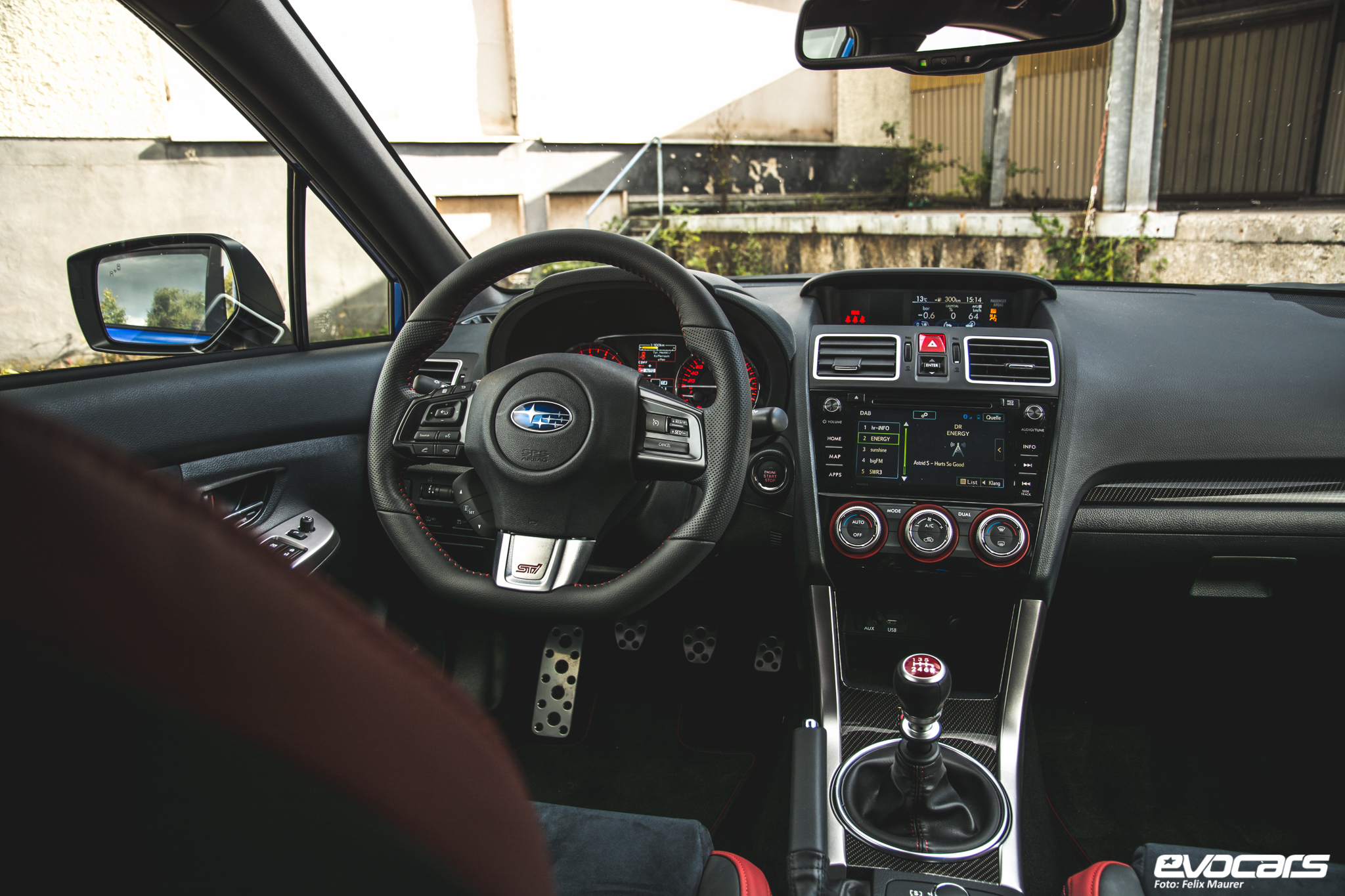 Dazu passt der – abgesehen von der Optik – dezente Auftritt des Sportlers, der sich auch durchaus von seinen Vorgängern unterscheidet. Die Recarositze mit roten Inlays und Alcantarabesatz passen wie angegossen, das Lederlenkrad liegt gut in der Hand, ist aber leider etwas mit Tasten überfrachtet worden. Man hat überdurchschnittlich viel Platz im Subaru, die Rücksitze sind umklappbar und der Kofferraum reicht sogar für einen Ausflug zu viert samt Schwiegereltern – falls nötig. Dank der unaufdringlichen Soundkulisse des Boxers, der weder dröhnig noch zu laut in den Innenraum schallt, würde es eben jenen nichtmal auffallen, in was für einem Rallyegeschoss sie gerade sitzen.