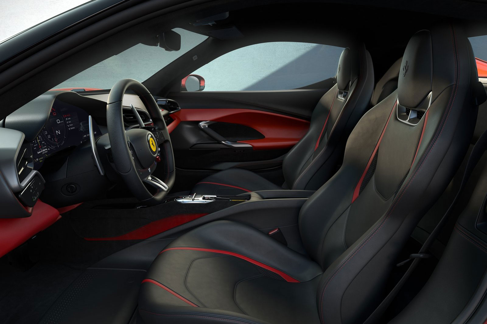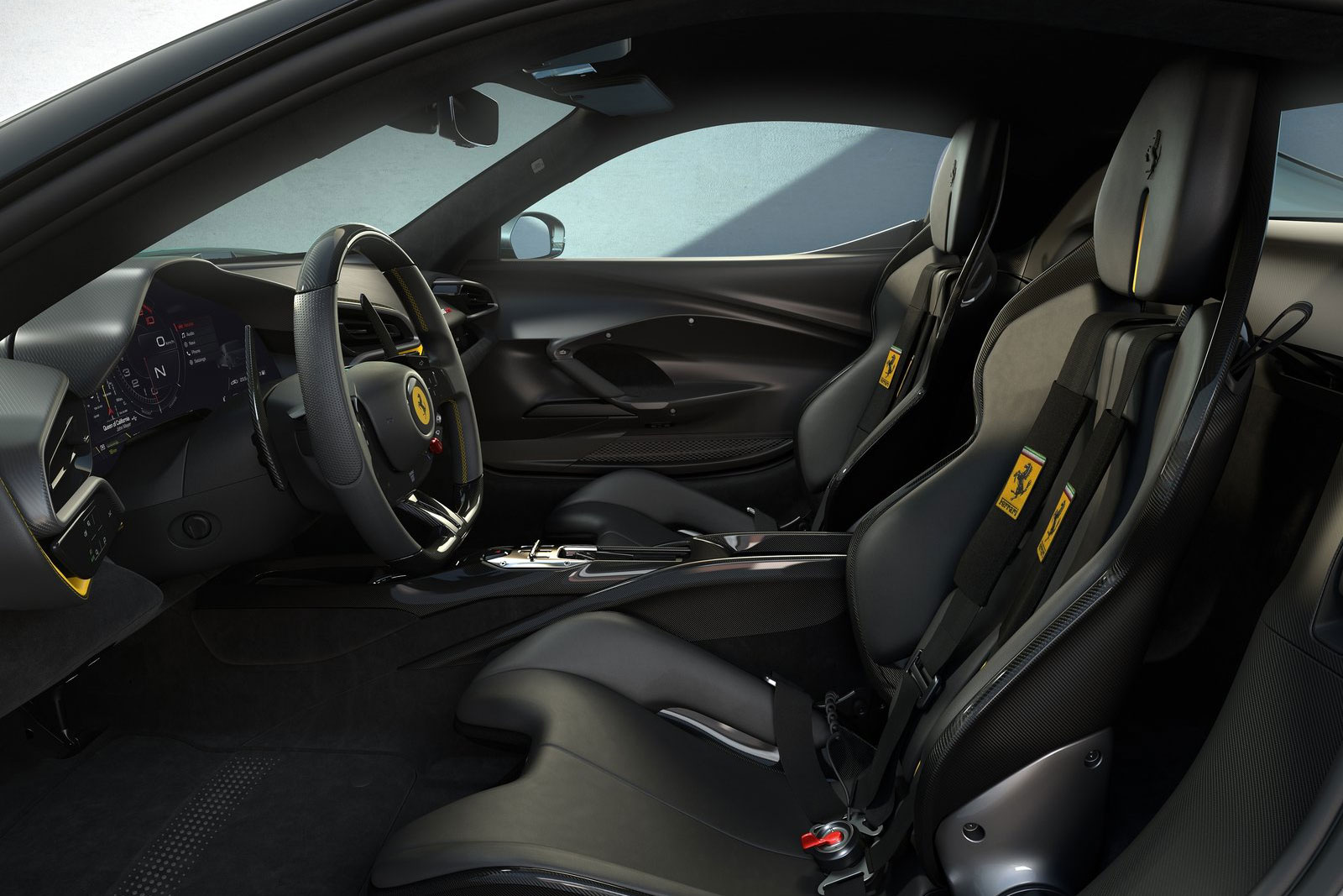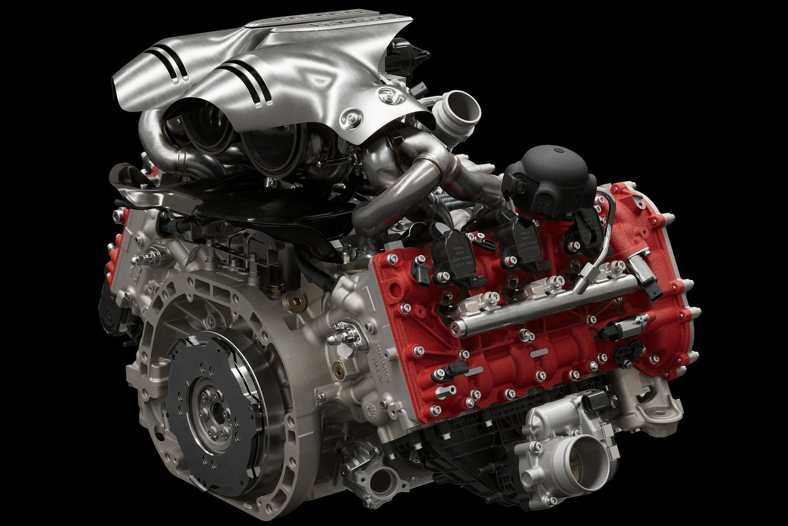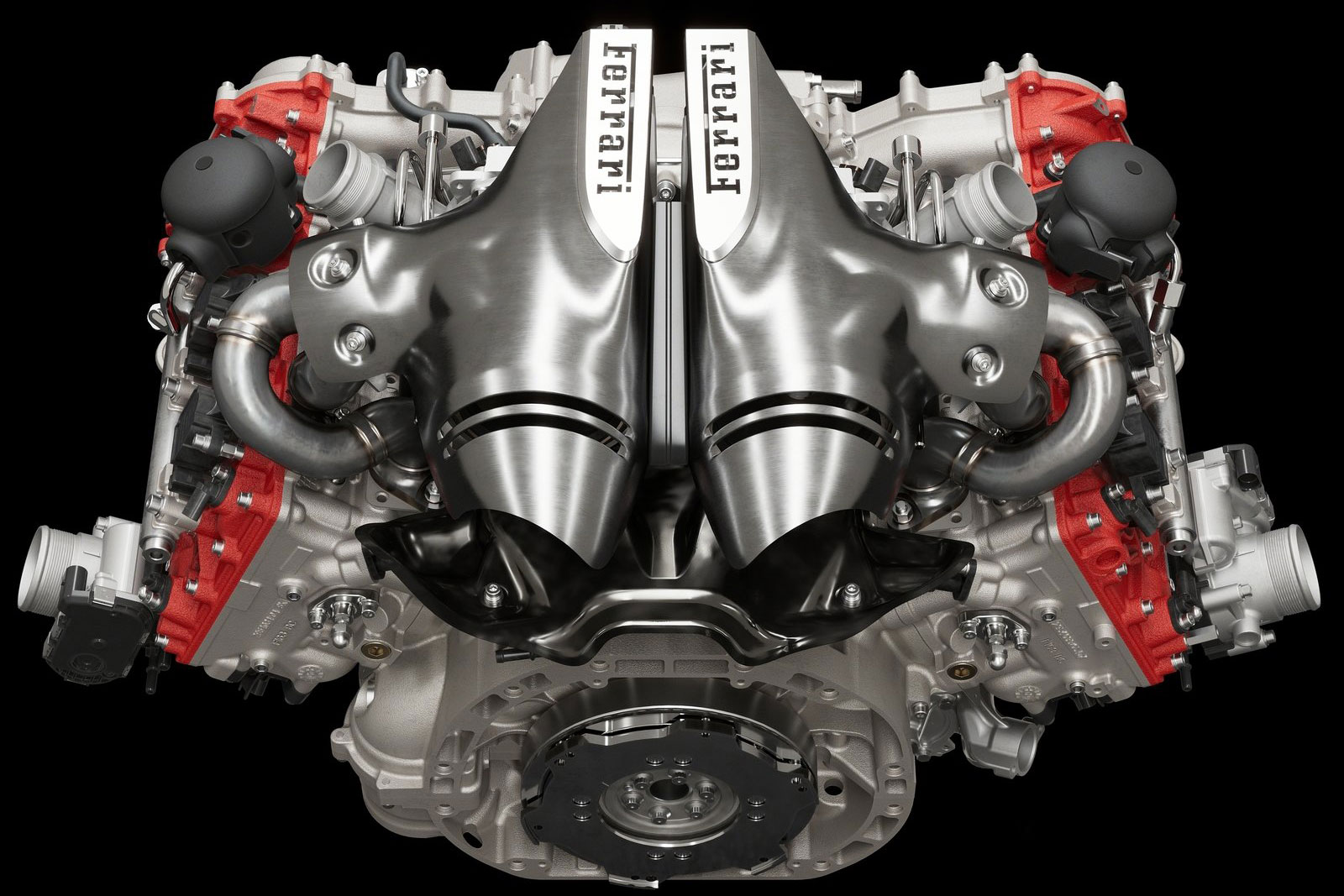 Der Motor profitierte von der neuesten Ferrari-Brennkammerentwicklung, die beim SF90 Stradale eingeführt wurde: Zentralinjektor und Zündkerze mit 350-bar-Druckeinspritzsystem, das das Kraftstoff-Luft-Gemisch in der Kammer verbessert, die Leistung verbessert und die Emissionen reduziert. Die Ein- und Auslasskanäle wurden neu konstruiert und abgestimmt, um den volumetrischen Wirkungsgrad zu maximieren und so hohe Turbulenzen in der Kammer zu gewährleisten.