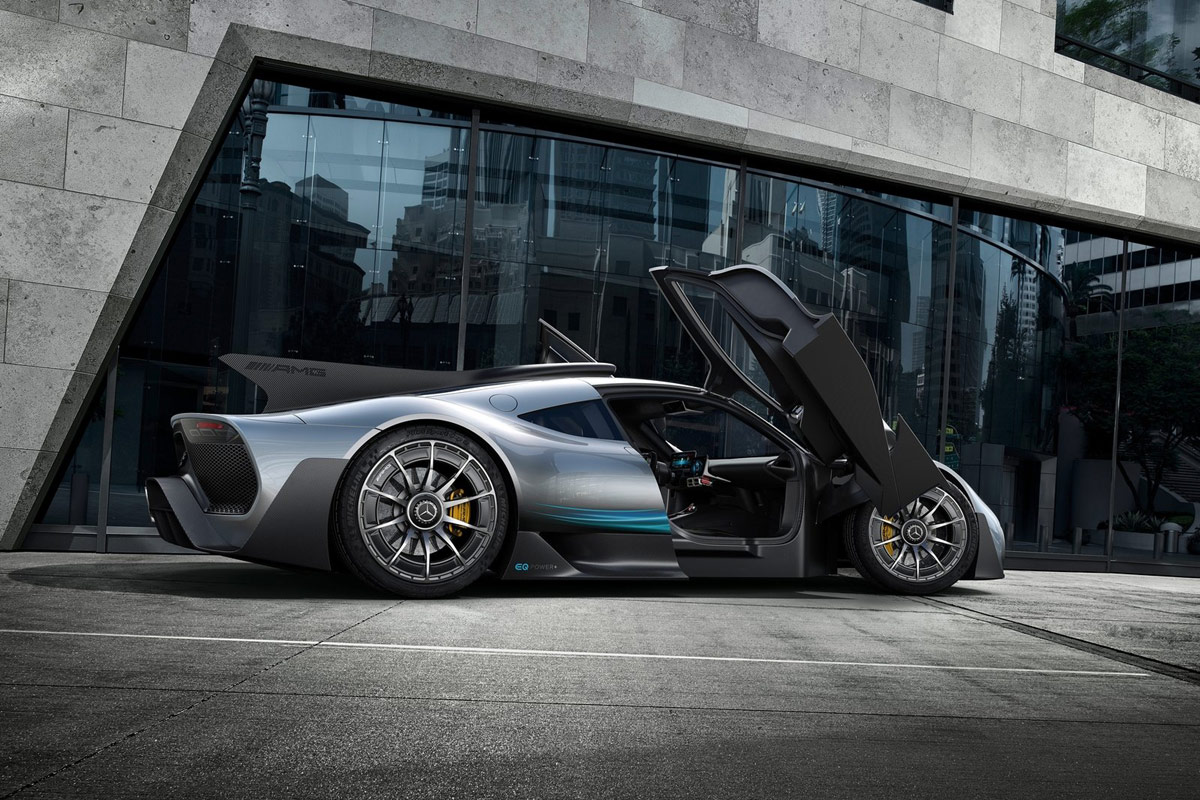 Von AMG gibt es nicht besonders viele Leistungsdaten geliefert. Allgemein wäre das Hypercar in der Lage, über 1.000 PS zu leisten, was in einer Höchstgeschwindigkeit von „über 350 km/h“ resultiert. Konkurrenten wie der Lamborghini Aventador und der Pagani Huayra bewegen sich demnach etwa in einer Leistungsklasse. Optisch bleibt Project One ein Modell für sich. Große Luftschlitze ziehen sich über die gesamte Front und sind damit das markanteste Element, welches sogleich ins Auge springt. Dazu gesellen sich weitere interessante Design-Elemente: ein vorgerücktes Cockpit, Dachluke mit Haifischflosse, schmale LED-Leuchten sowie ein relativ großer Diffusor. Durch eine Airbox auf dem Dach des Autos wird der Motor mit ausreichend Luft versorgt.