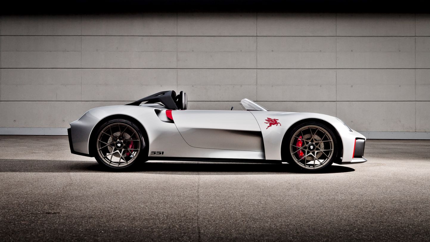 Mit seinem puristischen, reduzierten Cockpit, den charakteristischen Kühlergittern über dem Mittelmotor, den roten grafischen Akzenten und den angedeuteten Finnen am Heck erinnert der kompakte Porsche Vision Spyder (2019; Hartmodell im Maßstab 1:1) an den Porsche 550-1500 RS Spyder von 1954. Gleichzeitig diente die Studie der Weiterentwicklung der Design-Identität von Porsche und als Ideenspeicher für zukünftige Details – so beispielsweise der hoch modern gestaltete Überrollbügel.