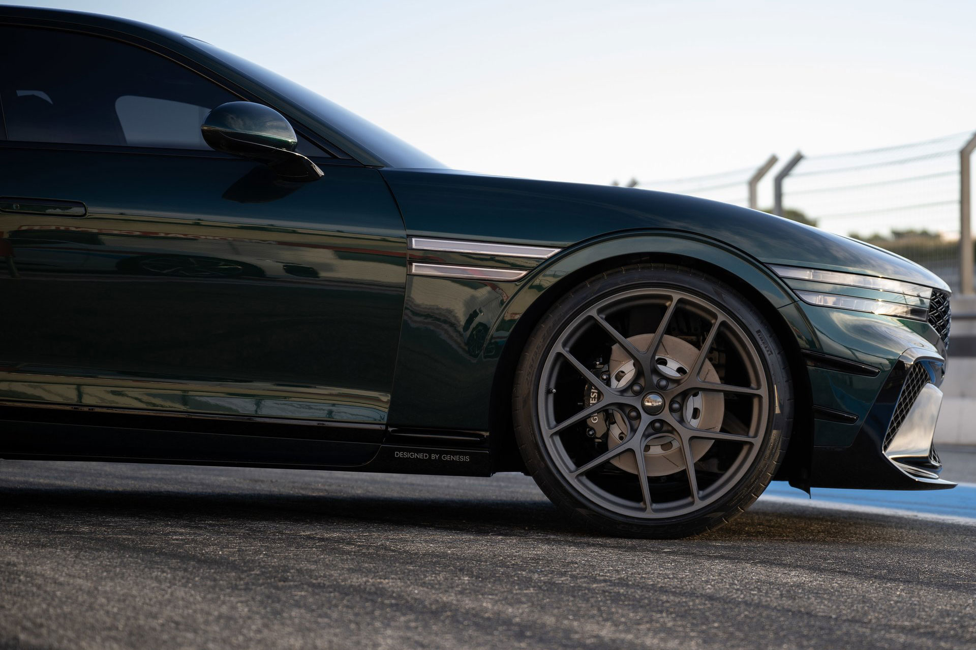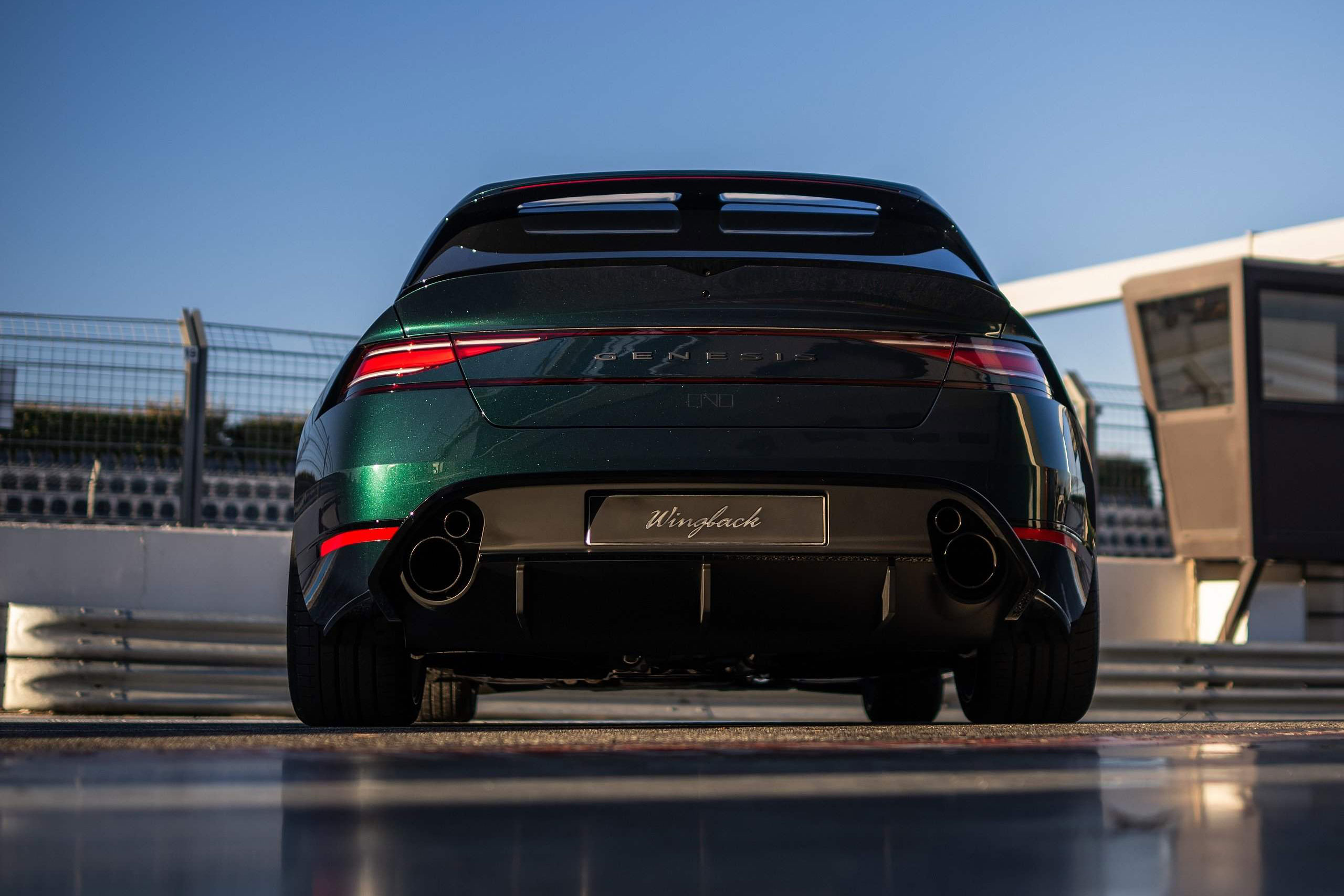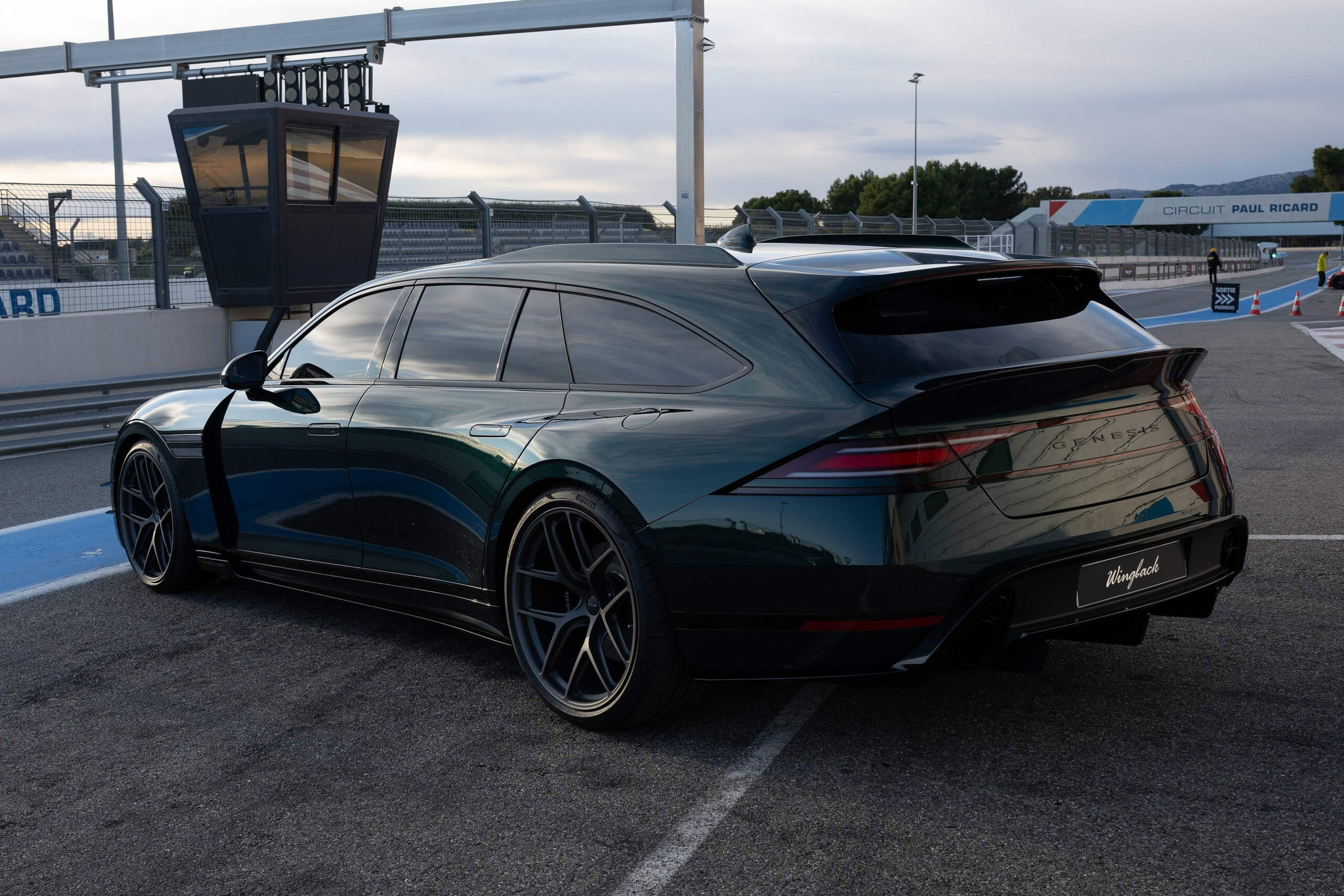 Die Basis des Wingback bildet unverändert die Plattform des G90: 3,2 Meter Radstand, 5,1 Meter Länge. Klingt zunächst völlig unspektakulär. Doch die Designer rund um Donckerwolke haben aus der Limousine etwas geschaffen, das eher wie ein luxuriöser Gran Turismo Kombi wirkt. Alle vertrauten Genesis-Stilelemente sind noch da: Crest-Grill, Parabolic Line, die typischen Zweilinien-Leuchten. Nur wirken sie nun wie unter Spannung gesetzt. Die Front ist aggressiver gezeichnet, mit größeren Lufteinlässen und seitlichen Canards. Die verbreiterten Kotflügel umschließen 22-Zöller mit Niederquerschnittsreifen. Insgesamt wirkt das Auto, als hätte jemand einer klassischen Luxuslimousine ein intensives Krafttraining verordnet.
