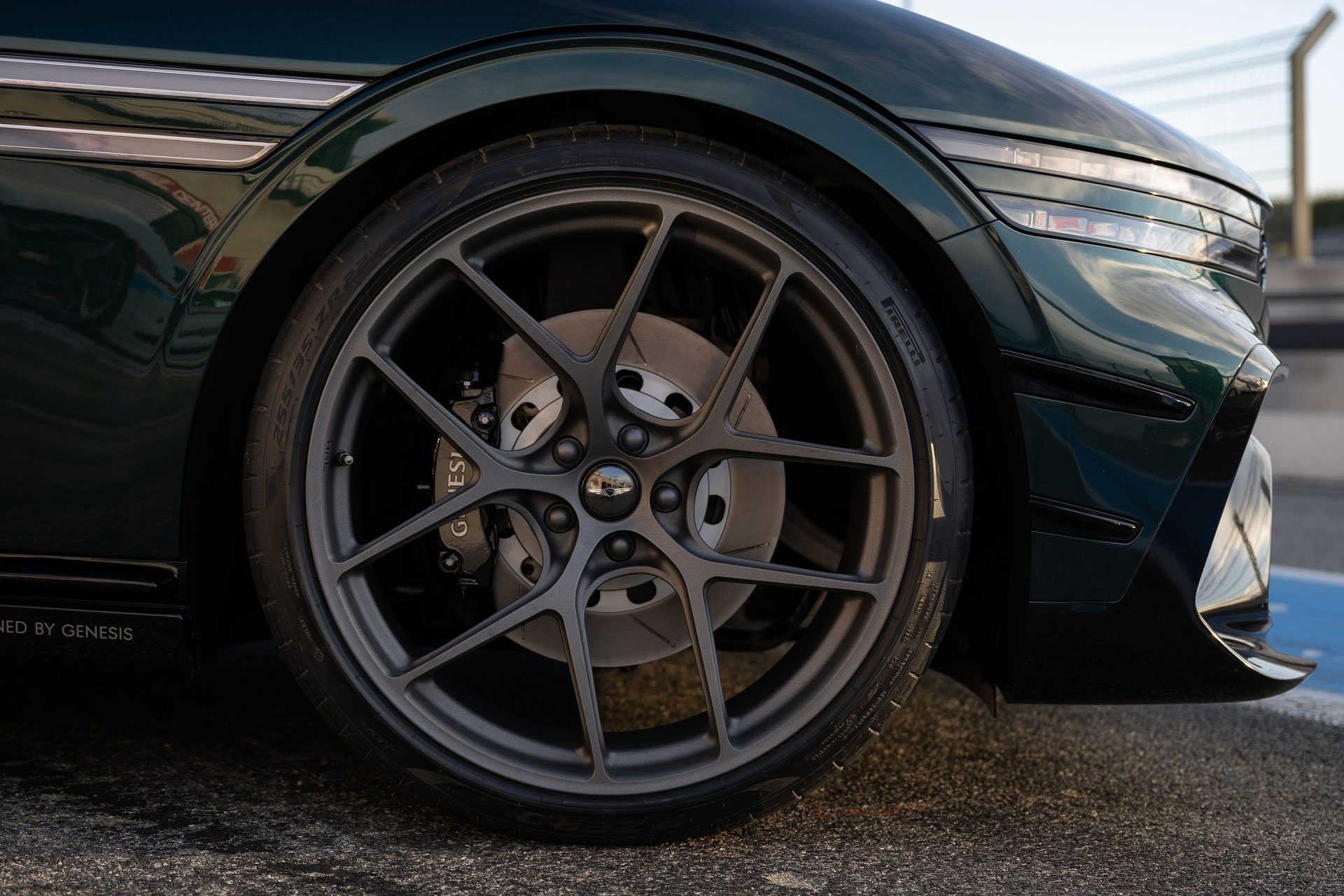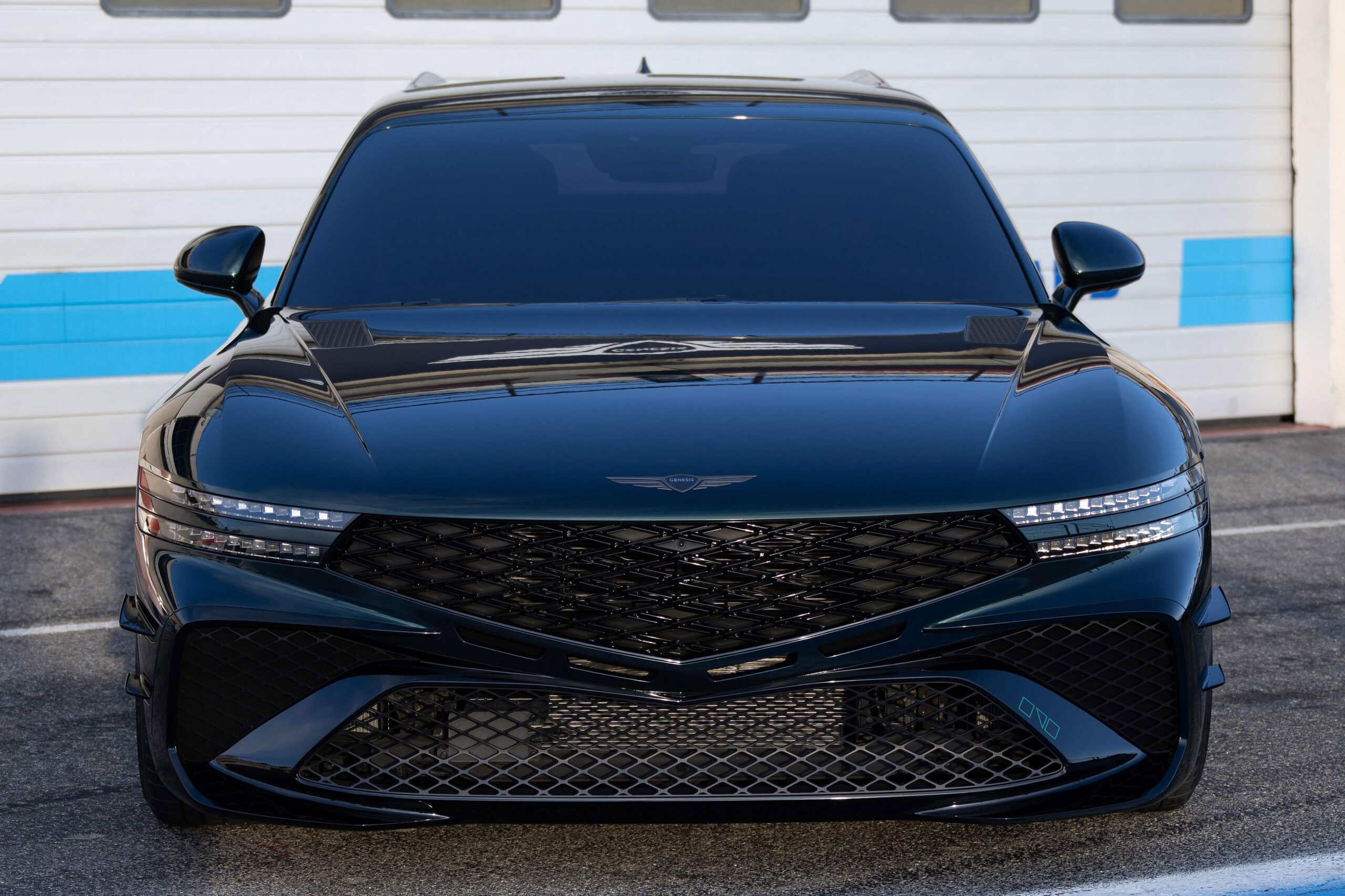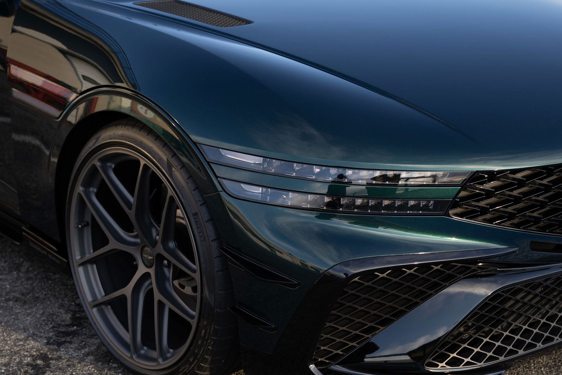 Die Basis des Wingback bildet unverändert die Plattform des G90: 3,2 Meter Radstand, 5,1 Meter Länge. Klingt zunächst völlig unspektakulär. Doch die Designer rund um Donckerwolke haben aus der Limousine etwas geschaffen, das eher wie ein luxuriöser Gran Turismo Kombi wirkt. Alle vertrauten Genesis-Stilelemente sind noch da: Crest-Grill, Parabolic Line, die typischen Zweilinien-Leuchten. Nur wirken sie nun wie unter Spannung gesetzt. Die Front ist aggressiver gezeichnet, mit größeren Lufteinlässen und seitlichen Canards. Die verbreiterten Kotflügel umschließen 22-Zöller mit Niederquerschnittsreifen. Insgesamt wirkt das Auto, als hätte jemand einer klassischen Luxuslimousine ein intensives Krafttraining verordnet.