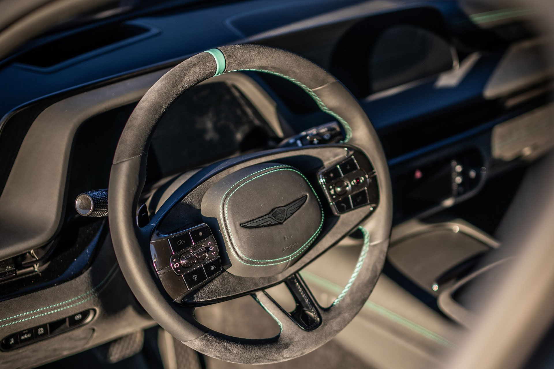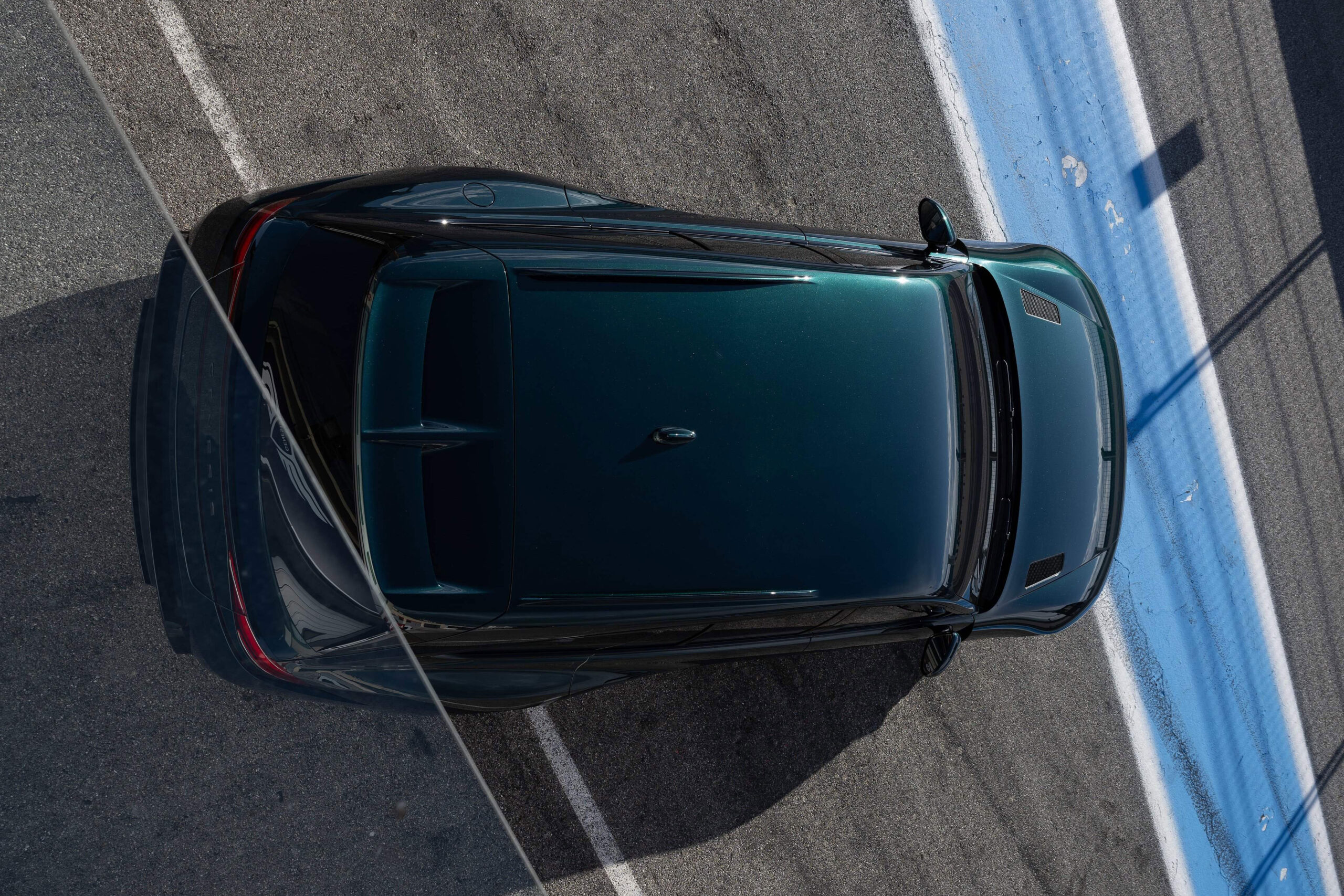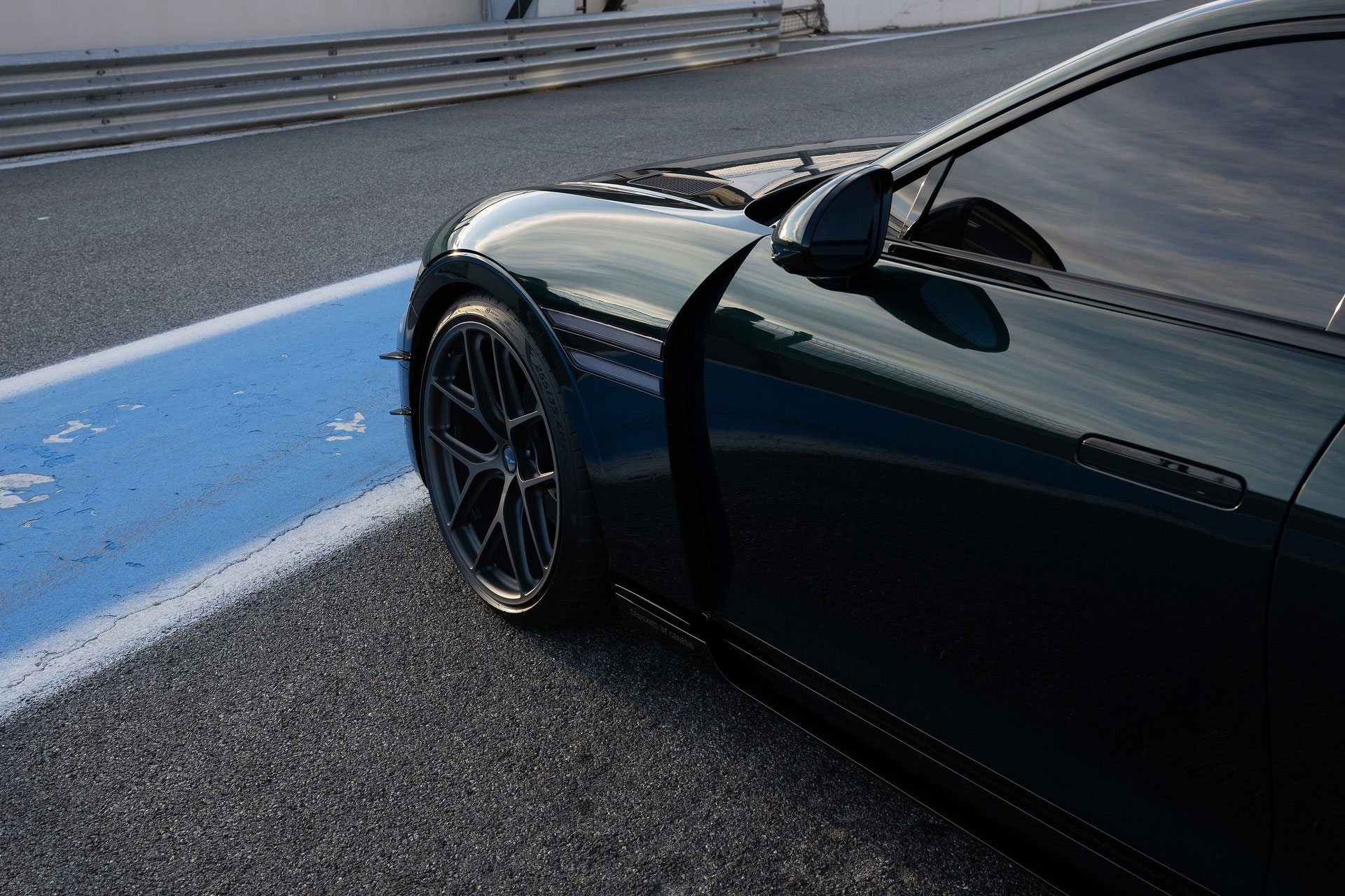 Die gestreckte Dachlinie erzeugt eine vollwertige Shooting-Brake-Anmutung. Statt einer konventionellen Limousinenheckpartie findet sich nun eine große Heckklappe mit leicht steilerer Heckscheibe. Zwei Spoiler sowie ein sportlich ausgelegter Diffusor machen klar, dass dieses Auto mehr transportieren soll als nur Gepäck für den Wochenendtrip. Innen zeigt sich die Magma-DNA in Form grüner Akzente und Nähte auf den gesteppten Chamude-Sitzen.