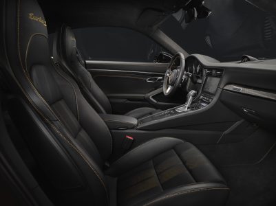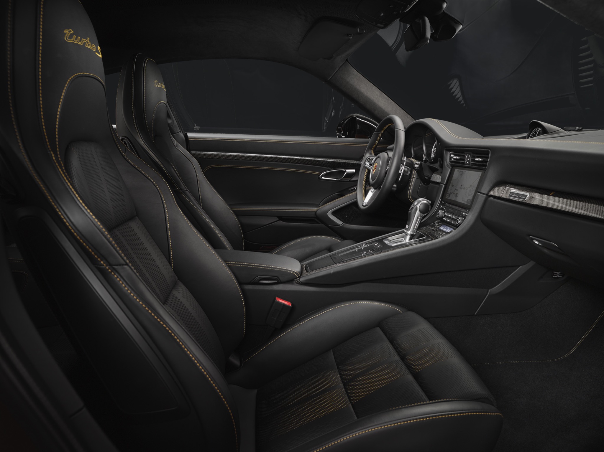 Doch das Exclusive Programm wäre nicht das Exclusive Programm, wenn es nicht auch für den Innenraum einige Schmankerl bereithielte, die es in dieser Form für den Standardelfer nicht zu kaufen gibt: Unter den perforierten Sitzmittelbahnen der 18-Wege-Sportsitze wurden zwei Streifen in der neuen Lieblingsfarbe Goldgelb eingearbeitet. Auch die Nähte sowie die eingestickten turbo S – Schriftzüge heben sich in Goldgelb vom ansonsten schwarzen Interieur ab. Am Alcantara-Dachhimmel finden sich erneut die goldgelben Zierstreifen wieder und über dem Handschuhfach prangt eine Plakette, die jeden Beifahrer darauf hinweist, dass er hier in einer streng limitierten Sonderserie sitzt. Der Preis? 259.992 Euro.