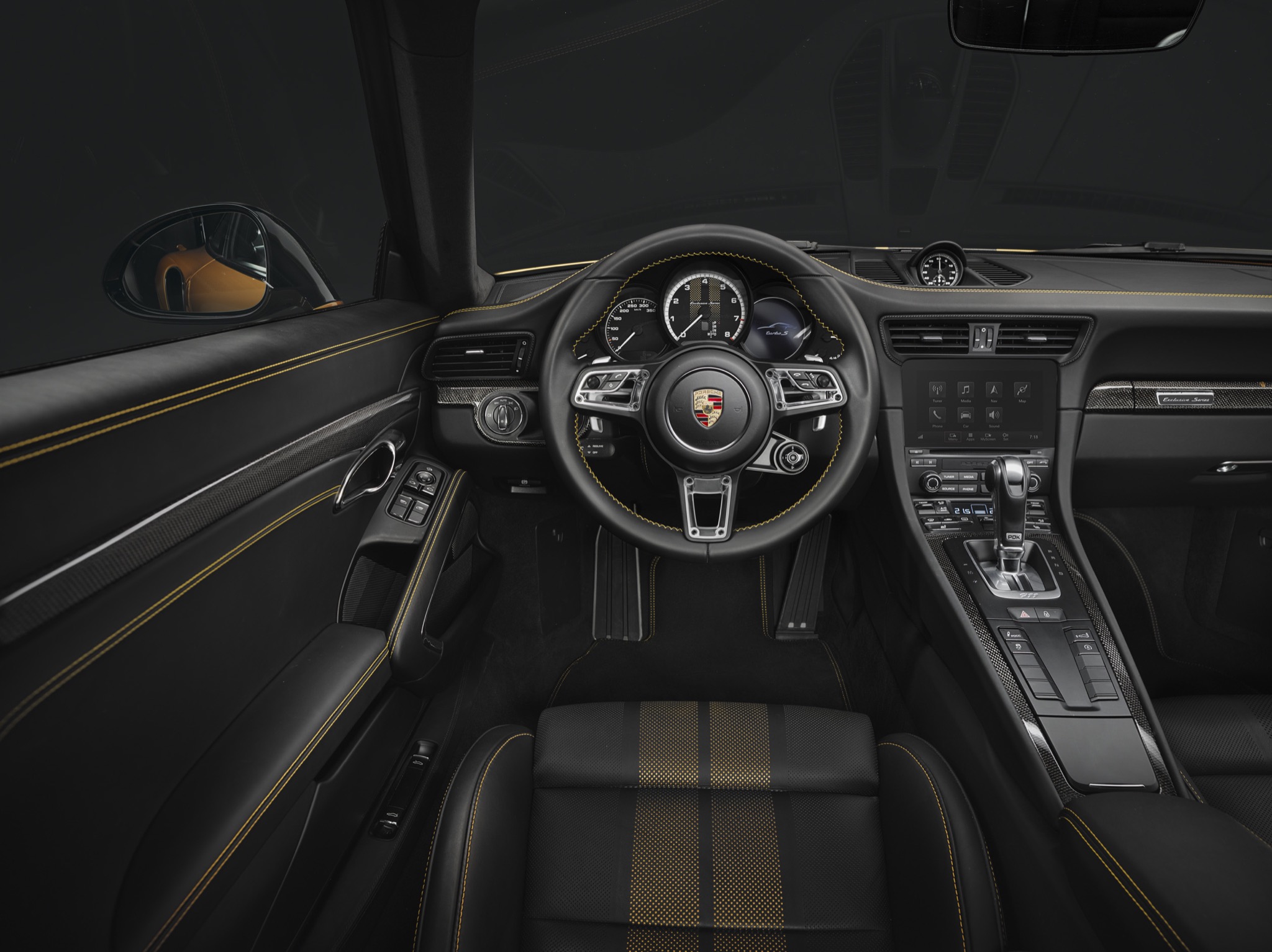 Doch das Exclusive Programm wäre nicht das Exclusive Programm, wenn es nicht auch für den Innenraum einige Schmankerl bereithielte, die es in dieser Form für den Standardelfer nicht zu kaufen gibt: Unter den perforierten Sitzmittelbahnen der 18-Wege-Sportsitze wurden zwei Streifen in der neuen Lieblingsfarbe Goldgelb eingearbeitet. Auch die Nähte sowie die eingestickten turbo S – Schriftzüge heben sich in Goldgelb vom ansonsten schwarzen Interieur ab. Am Alcantara-Dachhimmel finden sich erneut die goldgelben Zierstreifen wieder und über dem Handschuhfach prangt eine Plakette, die jeden Beifahrer darauf hinweist, dass er hier in einer streng limitierten Sonderserie sitzt. Der Preis? 259.992 Euro.