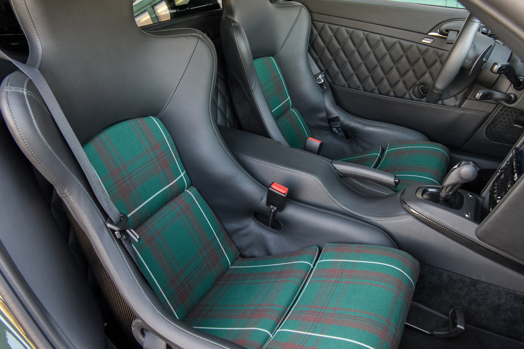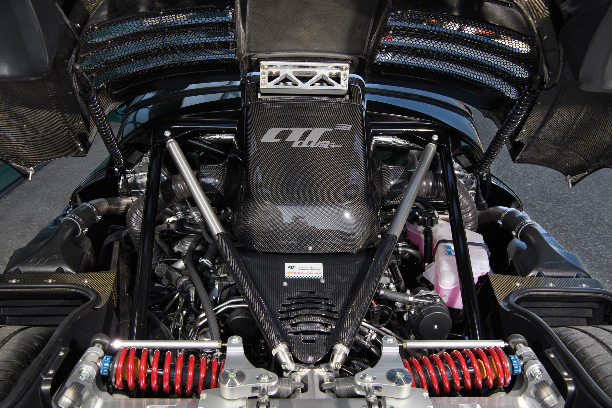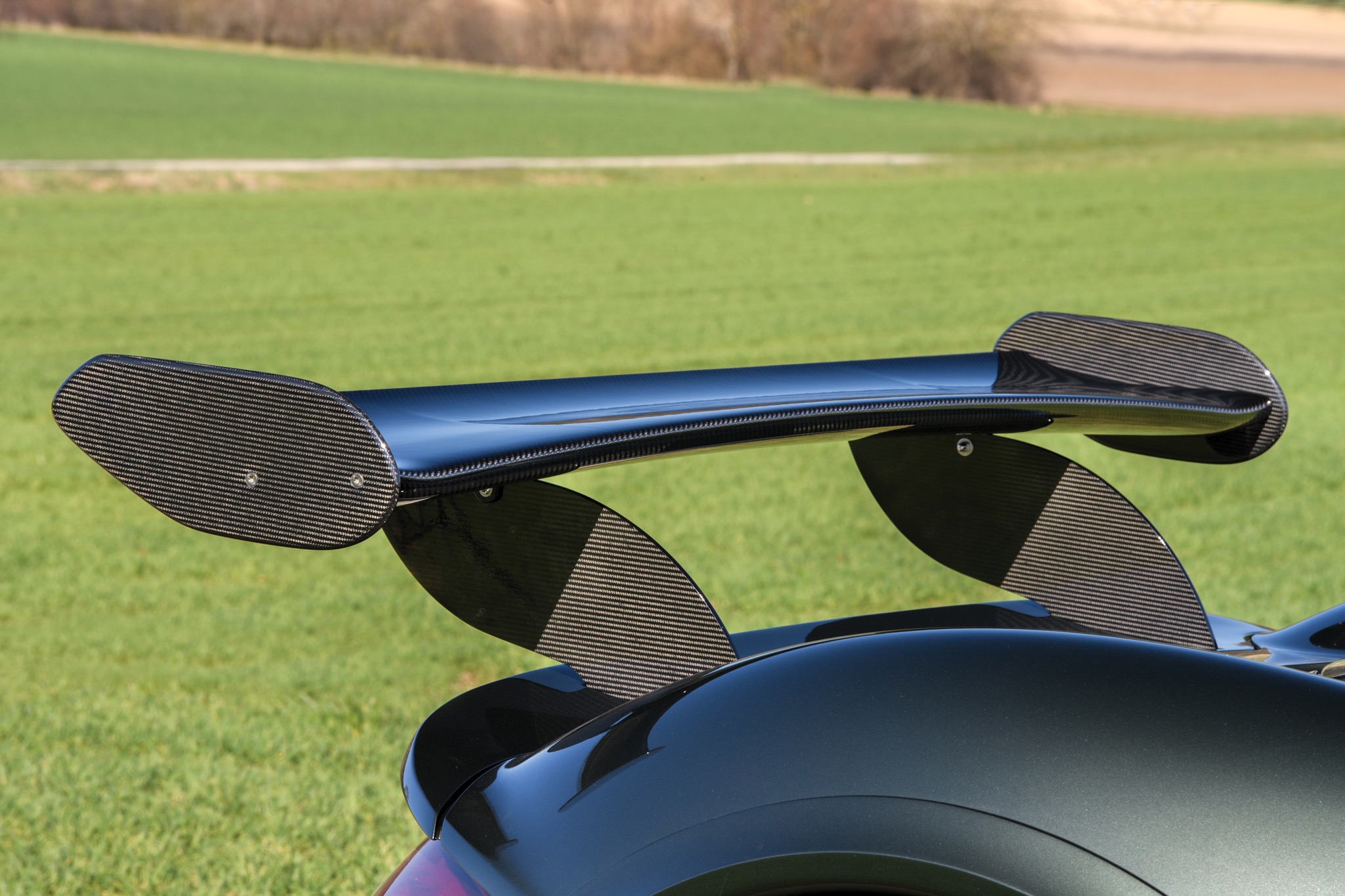 {1}Technik? Ja, da werkelt in dem Auto, das am zweiten Maiwochenende in Monaco unter der Führung von RM Sotheby’s versteigert wird, ein alter Bekannter: der 3,8-Liter große Sechszylinder-Boxermotor aus dem 997 turbo dürfte den meisten Porschejüngern ein Begriff sein. Doch die flache, aerodynamische Karosserieform haben es bereits angekündigt: hier stehen nicht nur 480 PS. Hier liegen, dank eines umfangreichen Turbo-Upgrades, satte 777 PS und 980 Newtonmeter Drehmoment an. Mittels eines Sechsgang-Schaltgetriebes oder (wie hier) eines Siebengang-PDK werden diese ausschließlich an die Hinterachse weitergeleitet. Dank rund 1,3 Tonnen Leergewicht ist die Beschleunigung famos, die Höchstgeschwindigkeit indes soll bei 380 Stundenkilometern liegen.