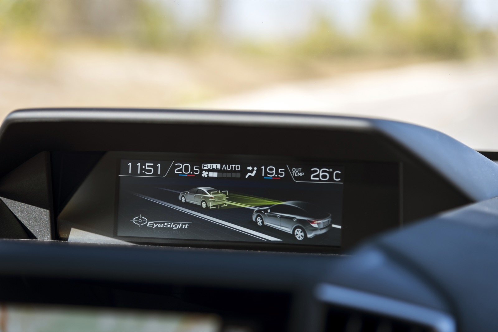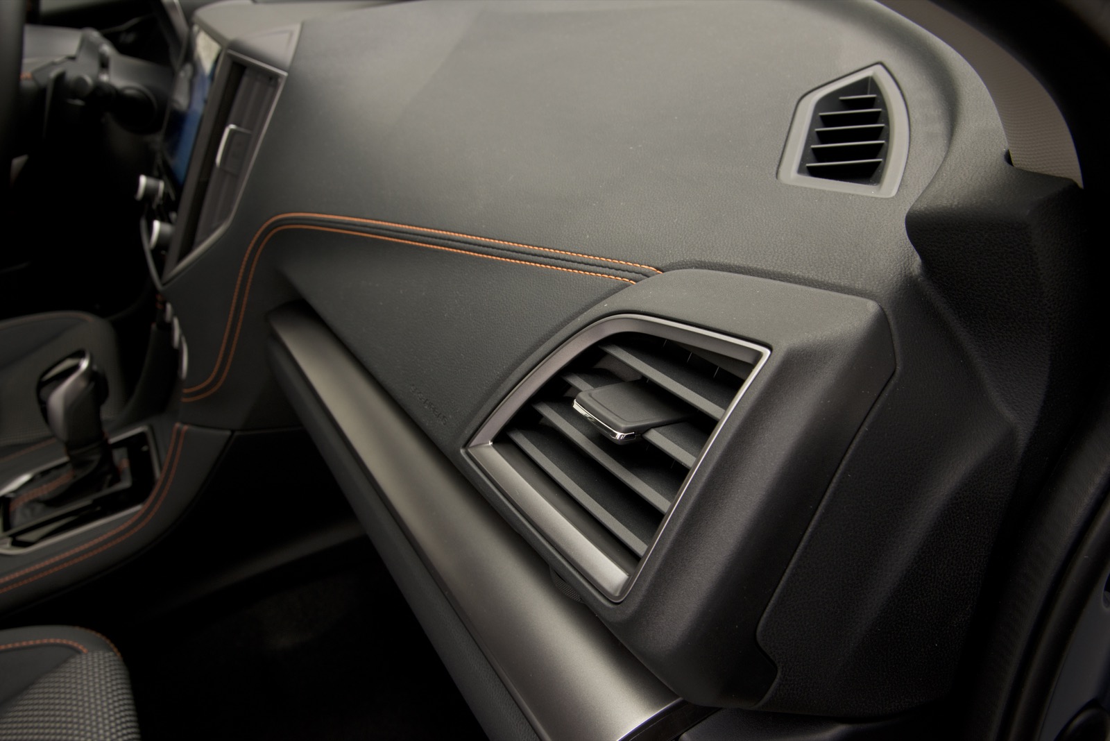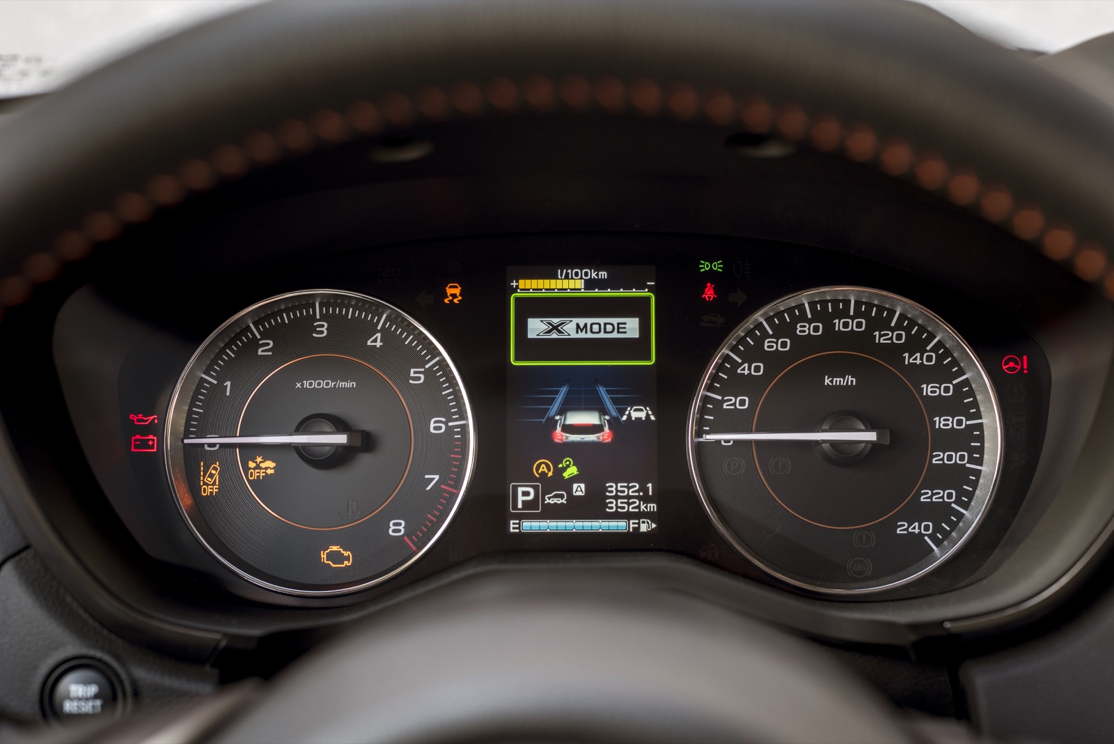 {1}Die Nerven des Fahrers hingegen schont der gesamte Innenraum, der gerade für einen Japaner mit seiner – wir wollen es mal so nennen – Liebe zum Detail überrascht. Orangefarbene Ziernähte auf dem Armaturenbrett und den Sitzen bringen Licht in das aufgeräumte und ansonsten vertraute Cockpit, das mit klassischen Rundinstrumenten und den beiden für Subaru typischen Displays in der Mittelkonsole aufwartet. Hierüber lassen sich nicht nur Fahrzeuginformationen abrufen, sondern auch das serienmäßig installierte Eyesight-System steuern, das den Subaru-eigenen Abstandsradar darstellt. Dieser funktionierte im Test äußerst zuverlässig und ohne Tadel, sodass sich auch längere Strecken entspannt darstellten. Ein nettes Gimmick, das uns als bekennende Assistenzverweigerer zum Schmunzeln brachte: Bremste der Subaru XV automatisch, so leuchteten auch im Infodisplay entsprechend die Bremsleuchten am dort illustrierten Fahrzeug auf.