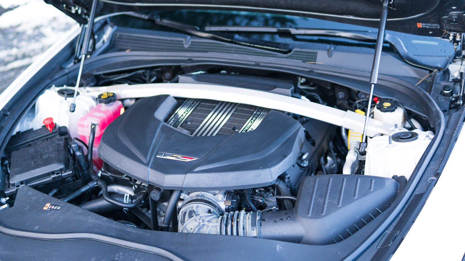 Was nicht heißt, dass dieses Auto in irgendeiner Form tatsächlich „normal“ ist. Unter der Carbonhaube (Detail!) schlummert die Technik der Corvette Z06. Was in Zahlen ausgedrückt folgendes heißt: 659 PS. 881 Newtonmeter. Voll auf die Hinterachse, eh klar. Doch die Amerikaner sind nicht mehr ganz so hart drauf wie zu Zeiten des ersten CTS-V (hier bei uns im Test). Sie bieten diesen Motor ausschließlich gekoppelt an eine Achtgangautomatik an. Anders als bei der Corvette.