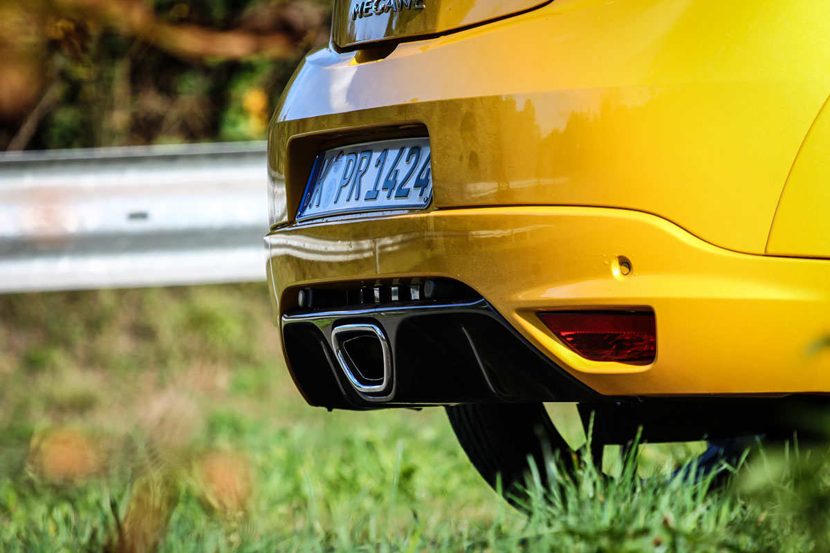 Nicht nur die Front verleiht dem kreischgelben Megane ein gesundes Maß an Sportlichkeit. Breite Kotflügel, ein kleiner Spoiler, Diffusor samt mittigem Auspuff, beim französischen Hot Hatch passt die Optik. Wer dazu noch das Cup-Paket mit Brembo-Bremsanlage inklusiven roten Bremssätteln ordert, der ist von einem alltagstauglichen Tracktool gar nicht mehr weit entfernt.