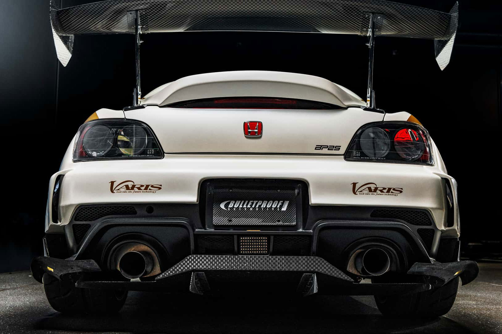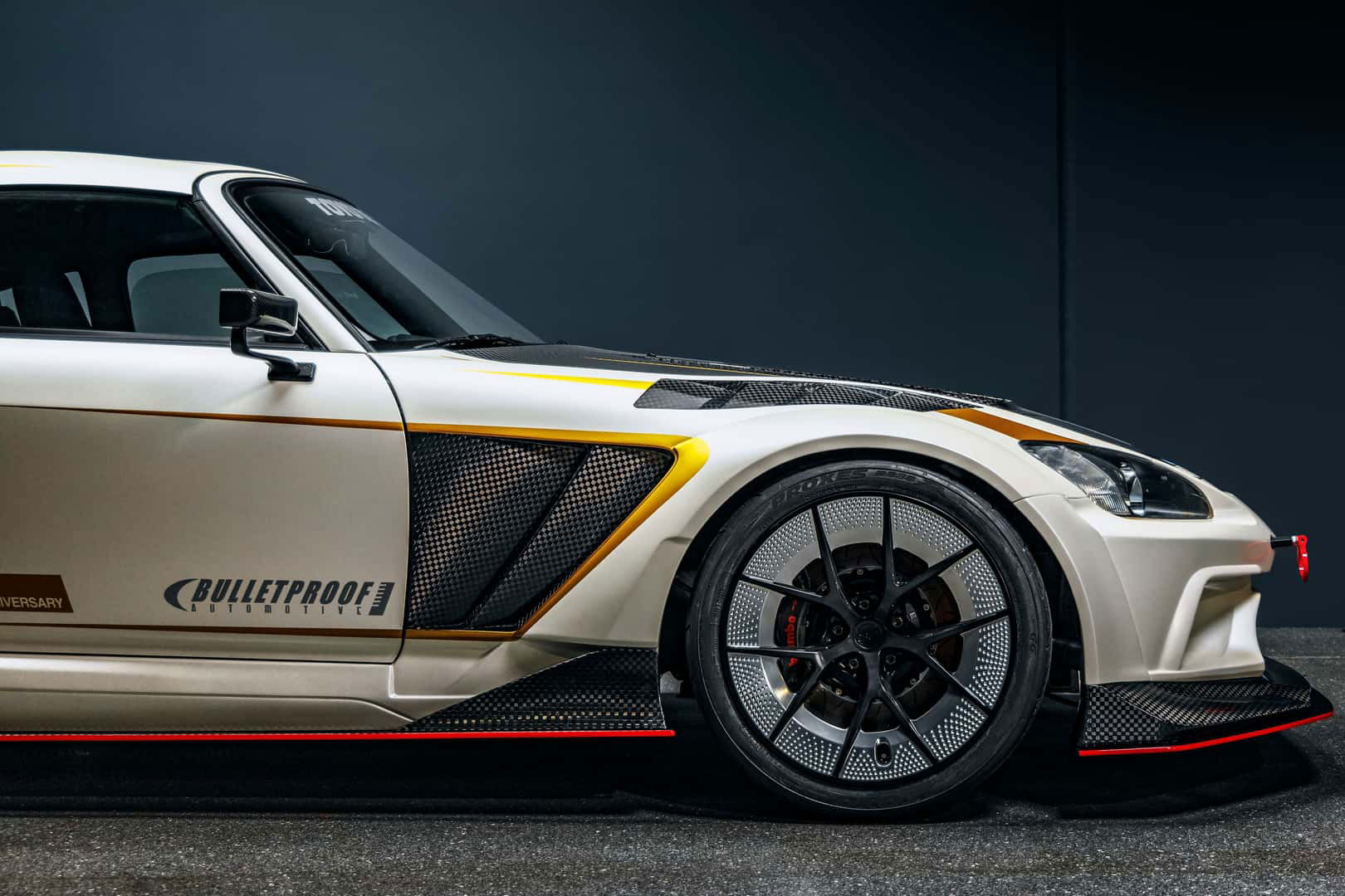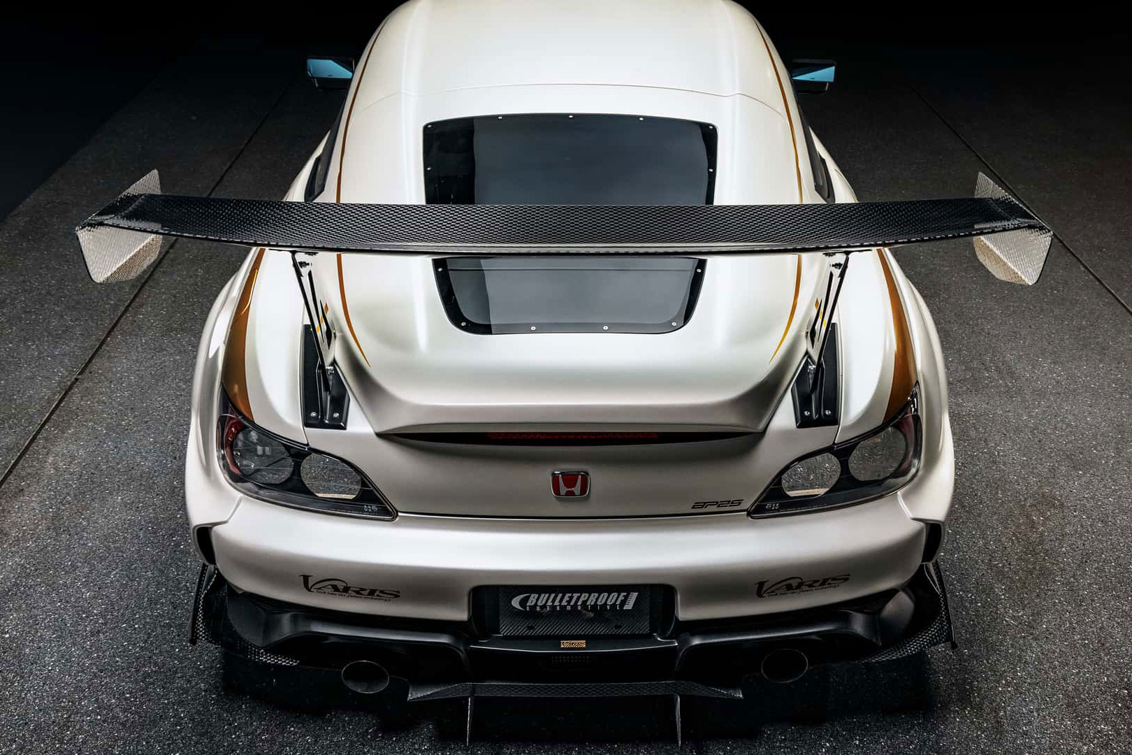 Karosserieseitig trägt der S2000 das Varis-Dark-Panther-Widebody-Paket, das zahlreiche aerodynamische Bauteile aus Carbon umfasst. Dazu zählen eine belüftete Motorhaube, ein groß dimensionierter Heckflügel sowie ein gewichtsreduzierter Kofferraumdeckel. Bulletproof Automotive entschied sich für den Farbton Lamborghini Balloon White – exakt derselbe Lack, der bereits das erste Showcar des Unternehmens, den Concept One, auszeichnete.