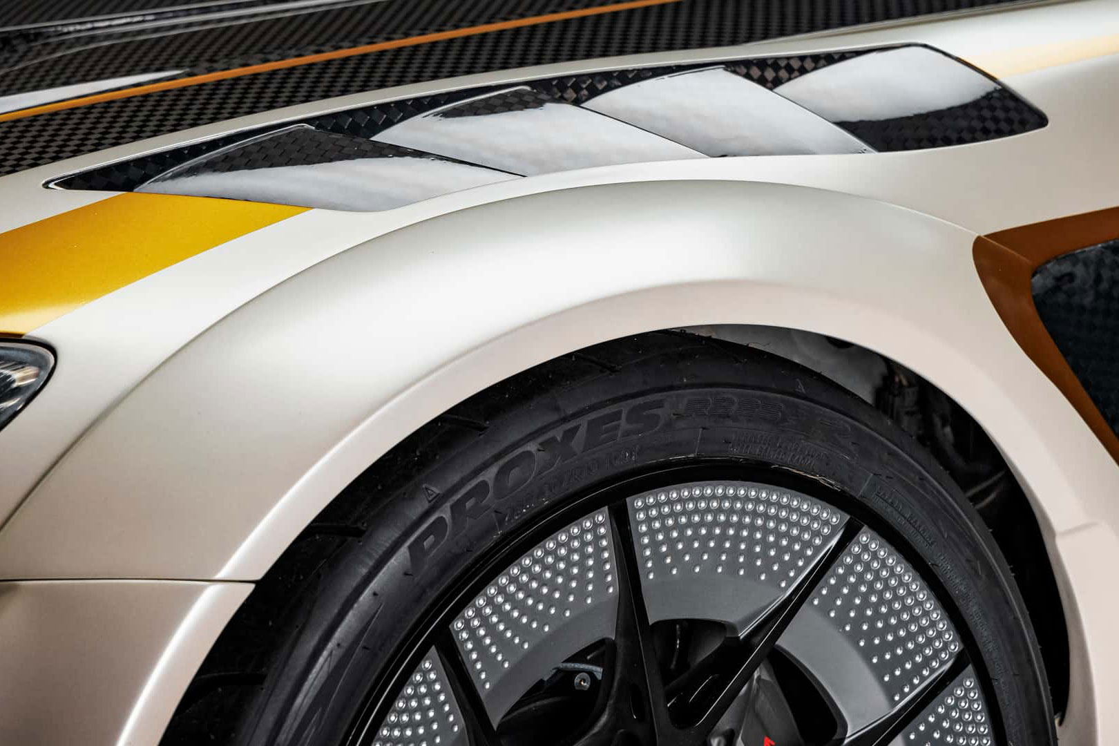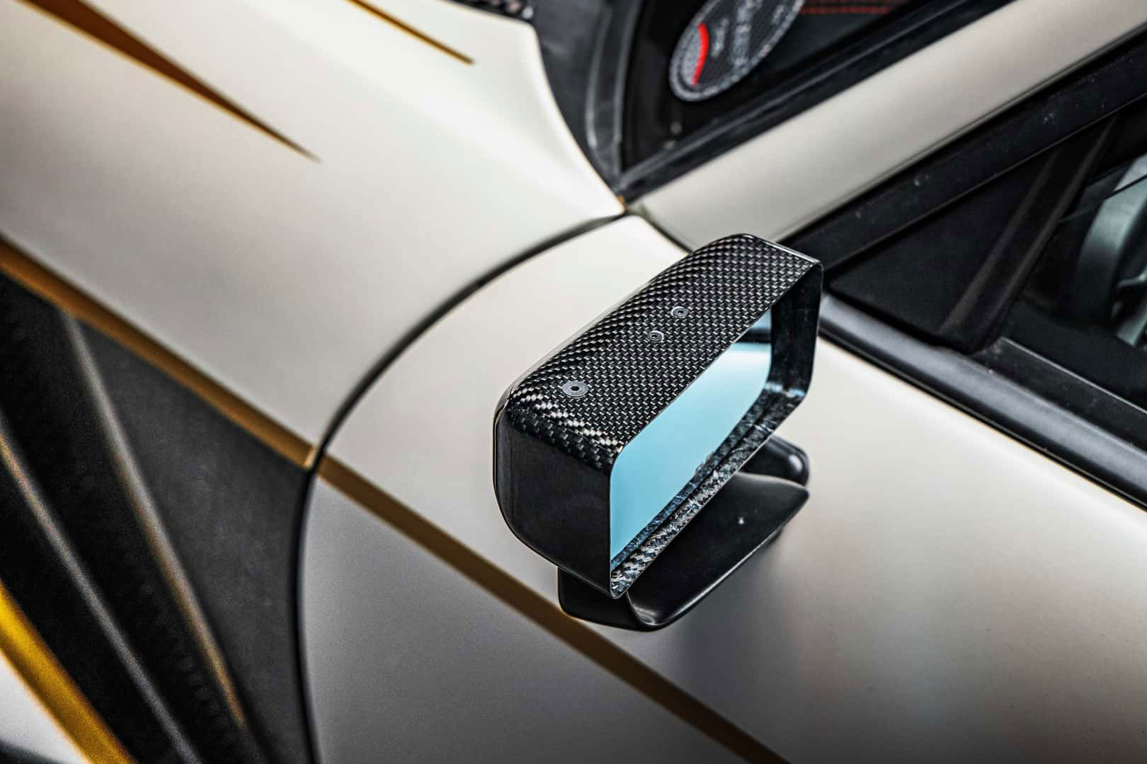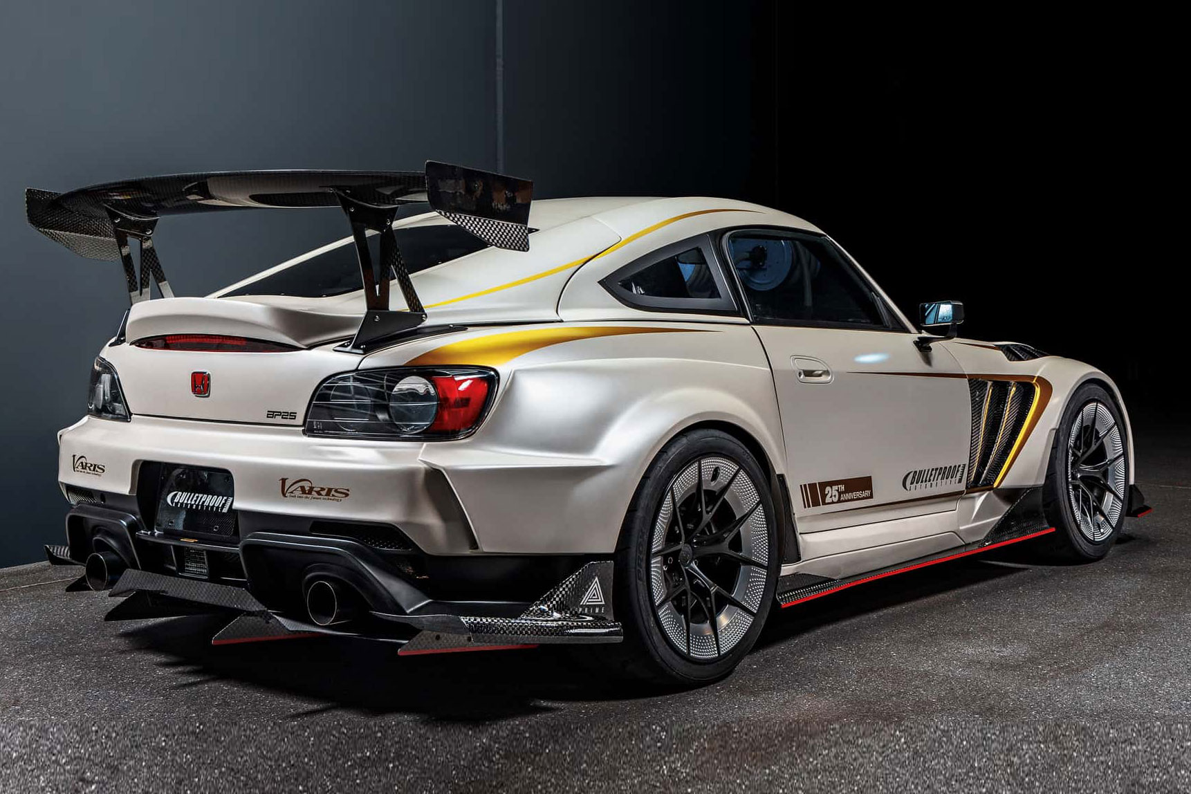 Karosserieseitig trägt der S2000 das Varis-Dark-Panther-Widebody-Paket, das zahlreiche aerodynamische Bauteile aus Carbon umfasst. Dazu zählen eine belüftete Motorhaube, ein groß dimensionierter Heckflügel sowie ein gewichtsreduzierter Kofferraumdeckel. Bulletproof Automotive entschied sich für den Farbton Lamborghini Balloon White – exakt derselbe Lack, der bereits das erste Showcar des Unternehmens, den Concept One, auszeichnete.