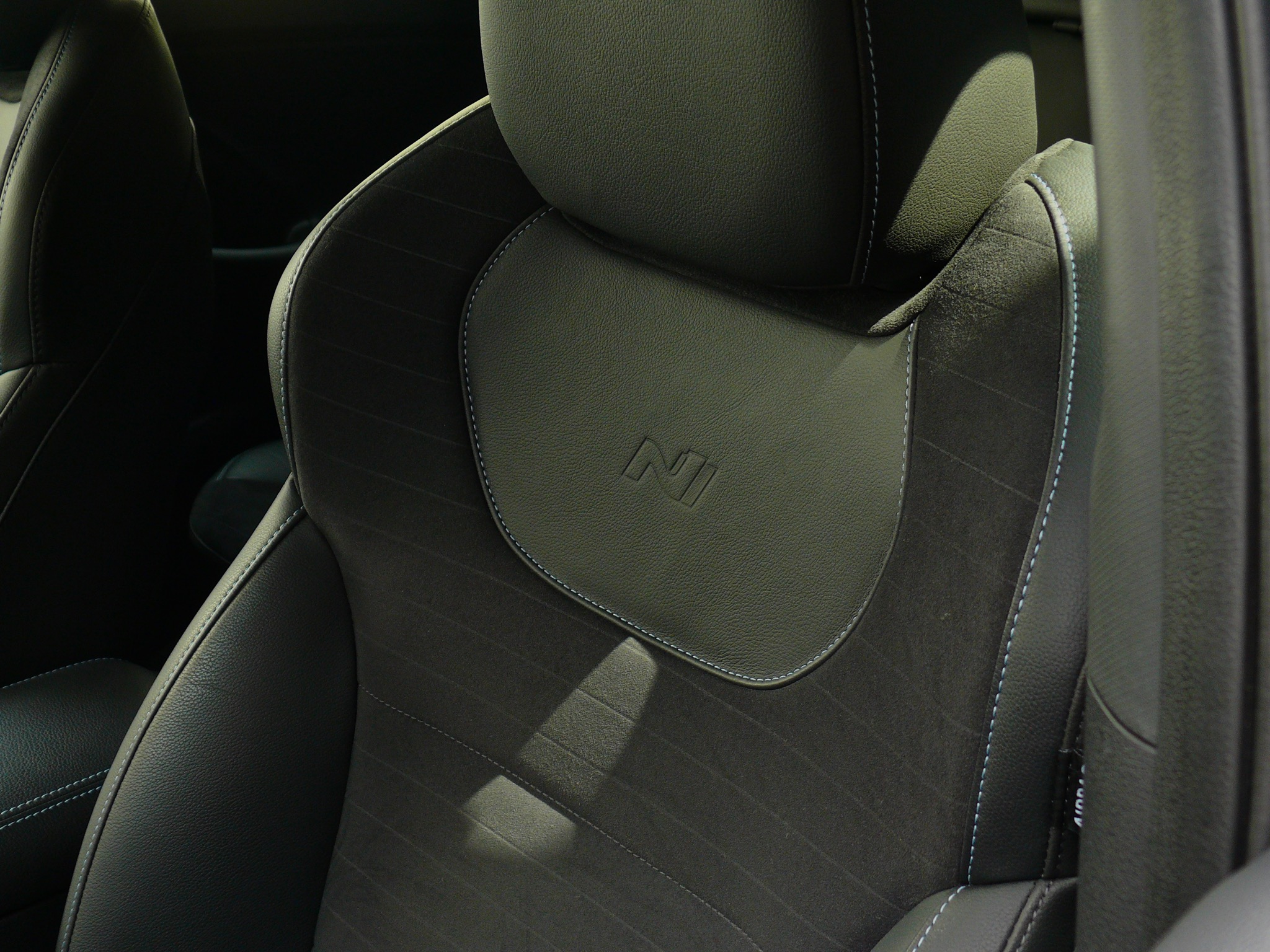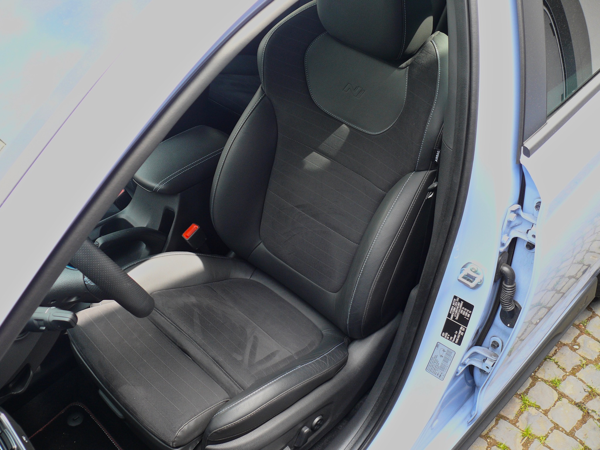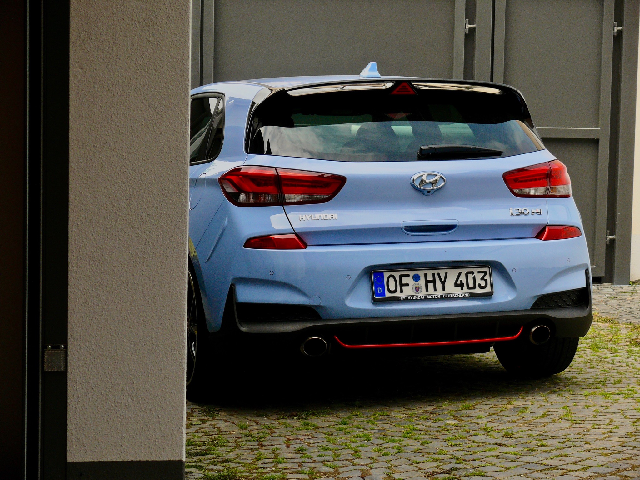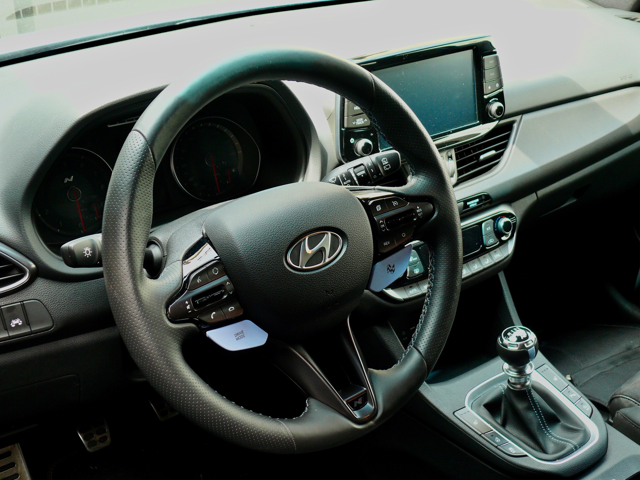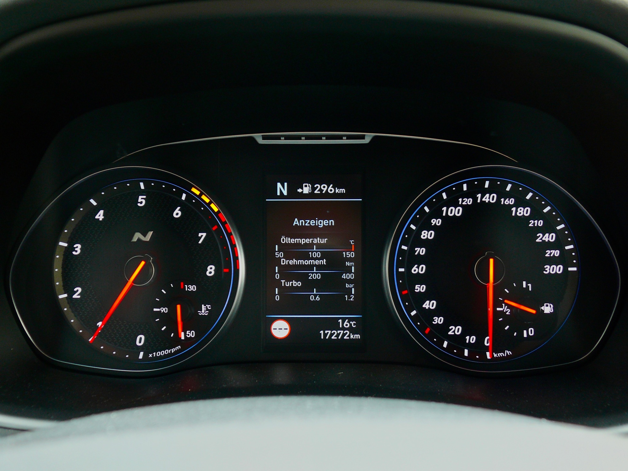 {1}Wir wollen schließlich erstmal fahren, sprich: Platz genommen im i30 N Performance. Das Sportgestühl ist auf Wunsch und gegen zusätzliche 1.700 Euro voll elektrisch einstellbar, bietet einen Leder-Alcantara-Mix und lässt sich für groß- oder kleingewachsene nahezu perfekt einstellen. Auch das Lenkrad bietet einen bemerkenswert weiten Verstellbereich, sodass man sehr zügig eine ideale Sitzposition findet, die zwar einen Tick zu hoch, aber zumindest nicht unbequem niedrig ist. Abgesehen von den blauen Nähten im Innenraum, N-spezifischen Instrumenten sowie zweier zusätzlicher Tasten am Lenkrad für die verschiedenen Fahrmodi wirkt ansonsten alles gewohnt wie im normalen i30 auch. Dazu gehört auch, dass die Verarbeitungsqualität ansich mehr als ordentlich ist, die Materialauswahl aber an so mancher Stelle die softlackverwöhnte VW-Klientel nicht unbedingt befriedigen wird. Ferner wirkt die Multimediaeinheit etwas aus der Zeit gefallen, reagiert träge auf Umschaltbefehle, berechnet dafür aber sämtliche Routen überaus fix. Irgendwo muss man halt Abstriche machen.