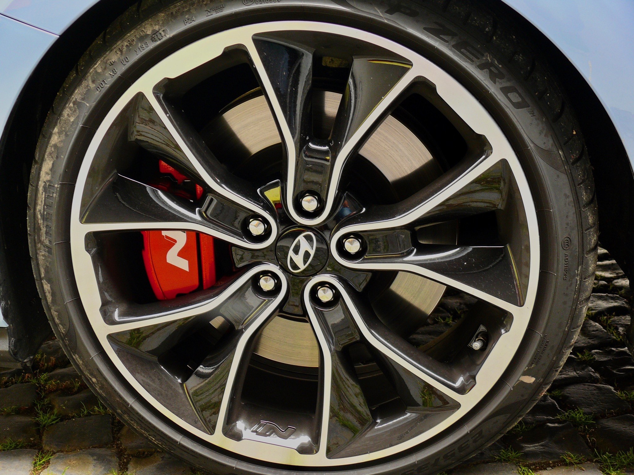 Und nun steht er vor uns. In Performance Blue (590 Euro Aufpreis) lackiert, mit einigen roten Akzenten gespickt, kauert er recht tief auf der Straße, macht Eindruck mit seiner zweiflutigen Abgasanlage und dem großen Dachkantenspoiler. Viele können ihn nicht einschätzen, doch der Kenner sieht sofort: hier steht kein stinknormaler Hyundai i30. Und – was der Kenner auch sieht: hier steht die Performance-Variante des i30 N. Die erblickt man nämlich schon von weitem anhand der deutlich satter im Radhaus stehenden 19-Zoll-Felgen sowie der dahinter aufblitzenden 345-Millimeter-Bremsanlage. Und man hört sie – zwangsläufig beim Starten des Motors. Insbesondere das Stand- und Rangiergeräusch der Performance-eigenen Abgasanlage ist den Aufpreis von 2.500 Euro zum Standard-i30 N absolut wert und dieses Gefühl wird nur durch den Druck auf den Race-Knopf am Lenkrad gesteigert, aber dazu später mehr.