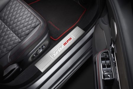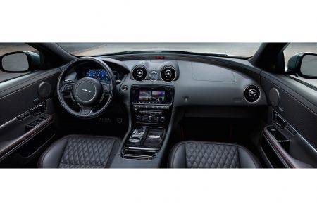 Und auch optisch soll der Jag nun seine Zähne zeigen – und bleibt doch weitgehend zurückhaltend im Vergleich zum jüngst vorgestellten Extremsportler Jaguar XE SV Project 8. Zwei der aus der umfangreichen Palette wählbaren Farben wurden exklusiv für den XJR575 kreiert: Satin Corris Grey (auf den Bildern zu sehen) und Velocity Blue. Eine aggressivere Frontschürze mit vergrößerten Lufteinlässen, Luftauslässe auf der Motorhaube, verbreiterte Türschweller und eine Heckspoilerlippe sind die dezenten Merkmale des Topmodells. Eine vierflutige Abgasanlage gehört in der Klasse mittlerweile zum guten Ton. Ledersitze in Diamantsteppung in verschiedenen Farben und optional rote Ziernähte sowie XJR575-Embleme zeigen dann spätestens im Innenraum, um was für einen XJ es sich hier handelt.