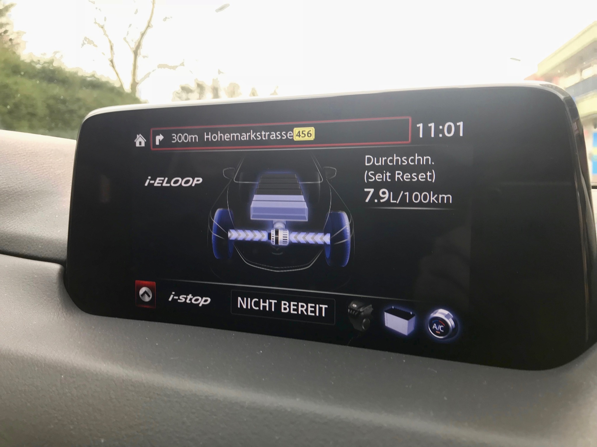 {1}Auch auf der Langstrecke fanden wir Gefallen am Japaner, was unter anderem an den eingebauten technischen Helferlein lag – mit Ausnahme der in der Variante Sports-Line (ab 38.190 Euro) serienmäßig verbauten Müdigkeitserkennung DAA. Diese meint an den unmöglichsten Parametern zu erkennen, dass der Fahrer eine Pause benötigt und macht sodann mit einem erschreckend durchdringenden Piepton auf sich aufmerksam, sodass man – wach wie man ist – beinahe in die Leitplanke donnert. Hier wäre noch etwas Feinarbeit nötig. Doch abgesehen davon, dass der Totwinkelwarner (ebenfalls Serie) samt Anzeige im detailreichen Head-Up-Display (990 Euro im Technik-Paket) besagte Leitplanke desöfteren für ein „sich bewegendes Objekt“ hielt, blieben sämtliche Assistenten angenehm im Hintergrund. Auch der radargestützte Abstands-Tempomat verhielt sich feinfühlig und war angenehm in der Regelung. Gleiches gilt für die (ebenfalls serienmäßigen) Voll-LED-Scheinwerfer mit Fernlichtautomatik, die nur noch vom famosen System der Mercedes-S-Klasse übertroffen werden. Das Multimediasystem ist zwar optisch etwas in die Jahre gekommen und verlor manchmal die Lust am DAB-Empfang (ebenfalls: Serie), die Navi-Einheit rechnete jedoch schnell und fehlerfrei. Nicht vergessen: wir reden hier über ein Mazda-SUV zum Preis von weniger als 40.000 Euro.