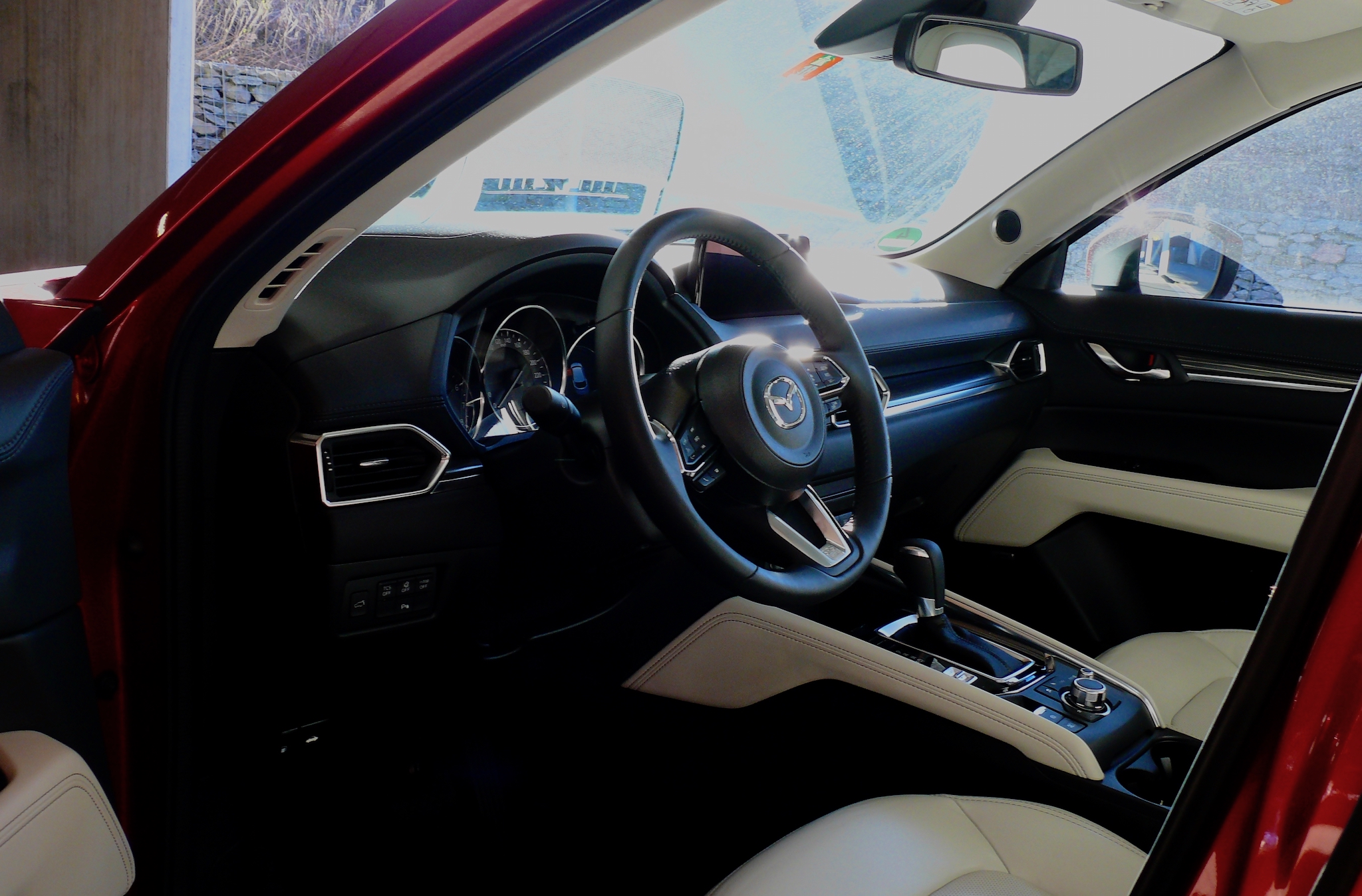 {1}Dies lässt uns zunächst einen Blick unter die Magmarot Metallic (900 Euro Aufpreis) lackierte Motorhaube werfen: der 2,5-Liter große Vierzylinder-Saugbenziner ist mit seinen 194 PS und 258 Newtonmetern Drehmoment im Prinzip ein alter Bekannter, verfügt jedoch seit der CX-5-Neuauflage über eine Zylinderabschaltung. Mittels eines variablen Ventilspiels können die Ein- und Auslassventile des ersten und vierten Zylinders im Teillastbetrieb deaktiviert werden, sodass lediglich die beiden verbleibenden Zylinder arbeiten müssen. Dies geschieht für den Fahrer fast unmerklich, lediglich ein minimales Vibrieren des Gaspedals können sehr feinfühlige Naturen vermerken, der Zweizylinderbetrieb wird jedoch für die Meisten im Verborgenen bleiben, da sie darüber nicht mittels einer Anzeige wie beispielsweise im Cadillac XT5 informiert werden. Für die Spritsparfanatiker wäre diese noch eine willkommene Spielerei, denn das Potential ist groß: auf Schweizer Autobahnen mit hohem Tempomatanteil und im zähfließenden Verkehr rund um den Lac Léman genehmigte sich der Vierzylinder lediglich 7,4 Liter Super. Und selbst forscher gefahrene Autobahnabschnitte quittierte der Japaner mit beeindruckenden 8,7 Litern Durchschnittsverbrauch pro 100 Kilometer. Im Langzeitschnitt benötigten wir 8,4 Liter Superbenzin, was ein hervorragender Wert für ein 1,6-Tonnen schweres Allrad-SUV mit knapp 200 PS ist. Mazda zeigt: es muss nicht immer Downsizing sein. Intelligente Ingenieursleistung genügt in der Regel schon.