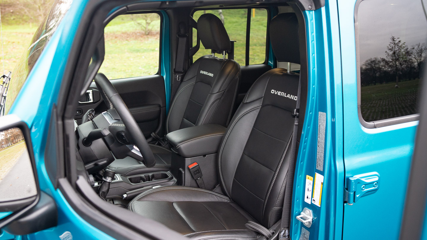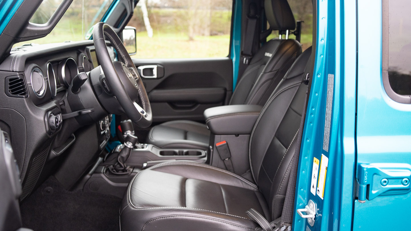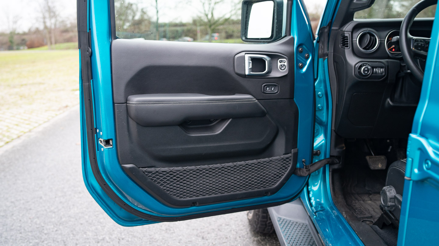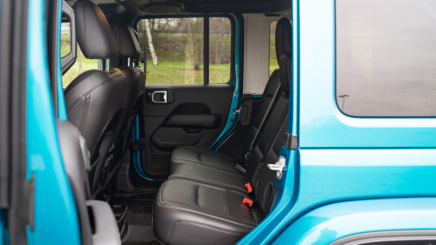 {1}Nach dem Einstieg bemerkt man die Rückdatiertung der Ursprungsidee bis ins Jahr 1942 vielleicht am stärksten. Eine steile und flache Frontscheibe, eine Sitzposition sehr nach an der Tür und überhaupt – es herrscht eine gewisse Kompaktheit im Innenraum. Es ist dabei nicht so, dass er wenig Platz hätte. Im Gegenteil. Doch der Raumeindruck ist eher klein. Die Stunde des Jeep Wrangler schlägt, wenn man sein Dach öffnet.