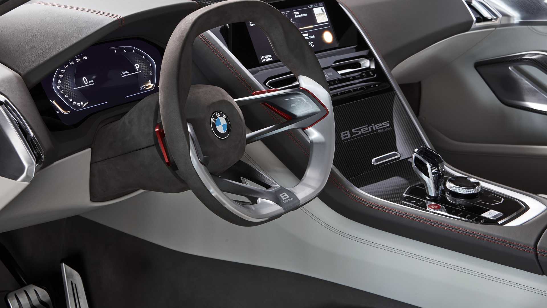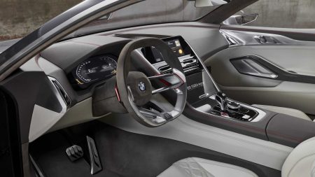 {1} Und auch der Innenraum zeigt sich sportlich luxuriös. Schalter gehören weitestgehend der Vergangenheit an. Die Mittelkonsole gibt sich betont offen und gibt von allen Seiten den Blick frei auf die zentrale Multimediaeinheit. Der Fahrer indes kann sich mittels volldigitaler Instrumententafel auf den Blick nach vorne konzentrieren. Die Konzeptstudie wartet mit hochwertigen Innenraummaterialien auf – Leder und Carbon dominieren. Ein besonderes Detail: Automatikwählhebel und iDrive Controller sind mit edlem Swarovski-Glas bestückt.