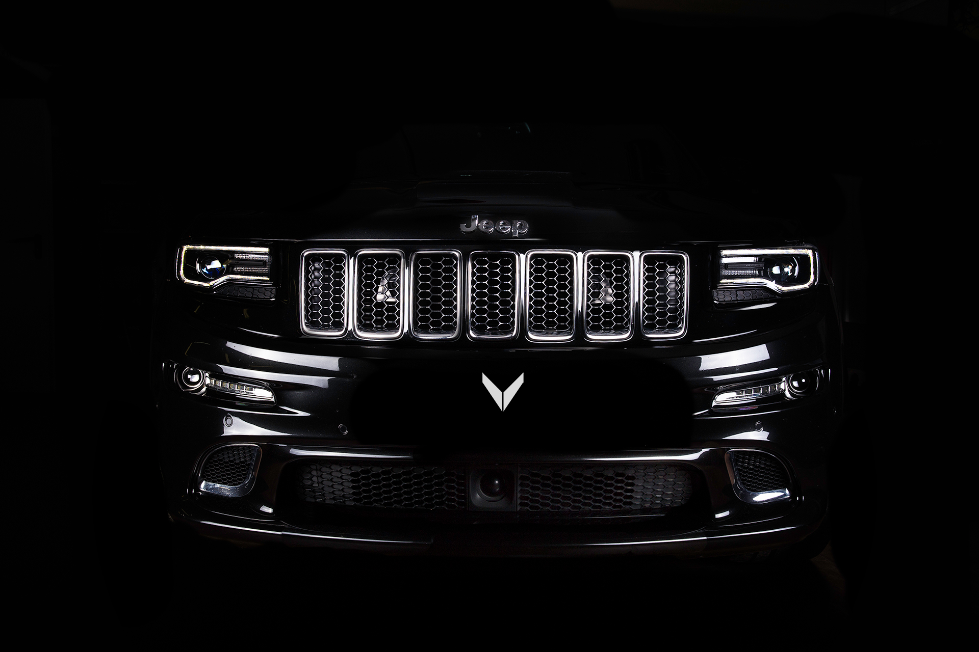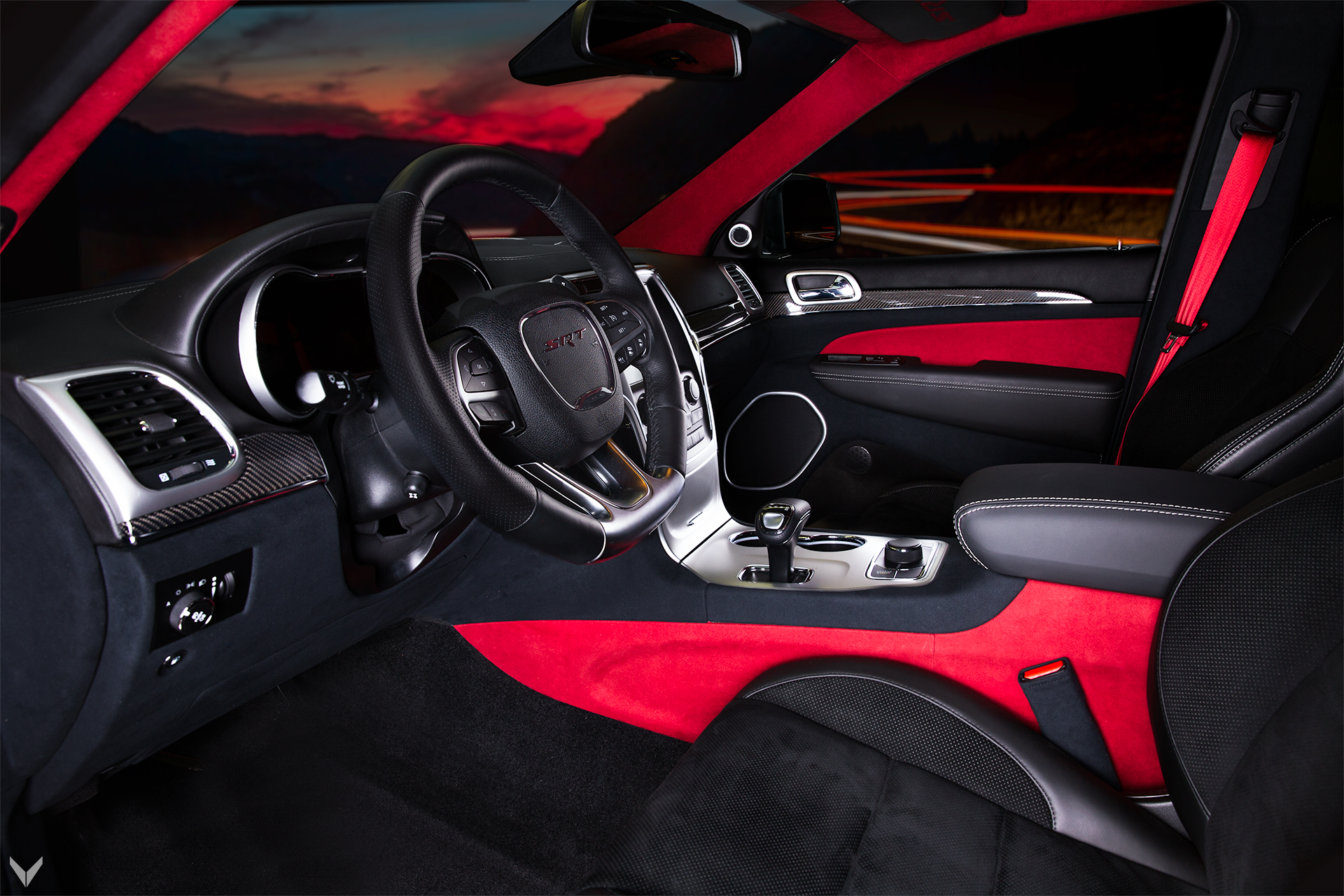 Und selbstverständlich wurden nicht nur die Kopfstützen neu bezogen: besonders präsent gibt sich der komplett in rotem Alcantara bezogene Dachhimmel (inklusive Sonnenblenden mit eingesticktem SRT-Logo) des 468 PS starken SUV. Auch die Mittelkonsole, die sich sonst in schnödem Plastik kleidet, ist nun mit schwarz-rotem Alcantara bezogen und ebenso die Türpappen. Damit nun auch die elektrische Sitzverstellung zum Erlebnis wird, sind die Sitzkonsolen außerdem mit Alcantara bezogen. Ein SRT-Jeep der besonderen Art also – mit einer noch besondereren Geschichte dahinter.